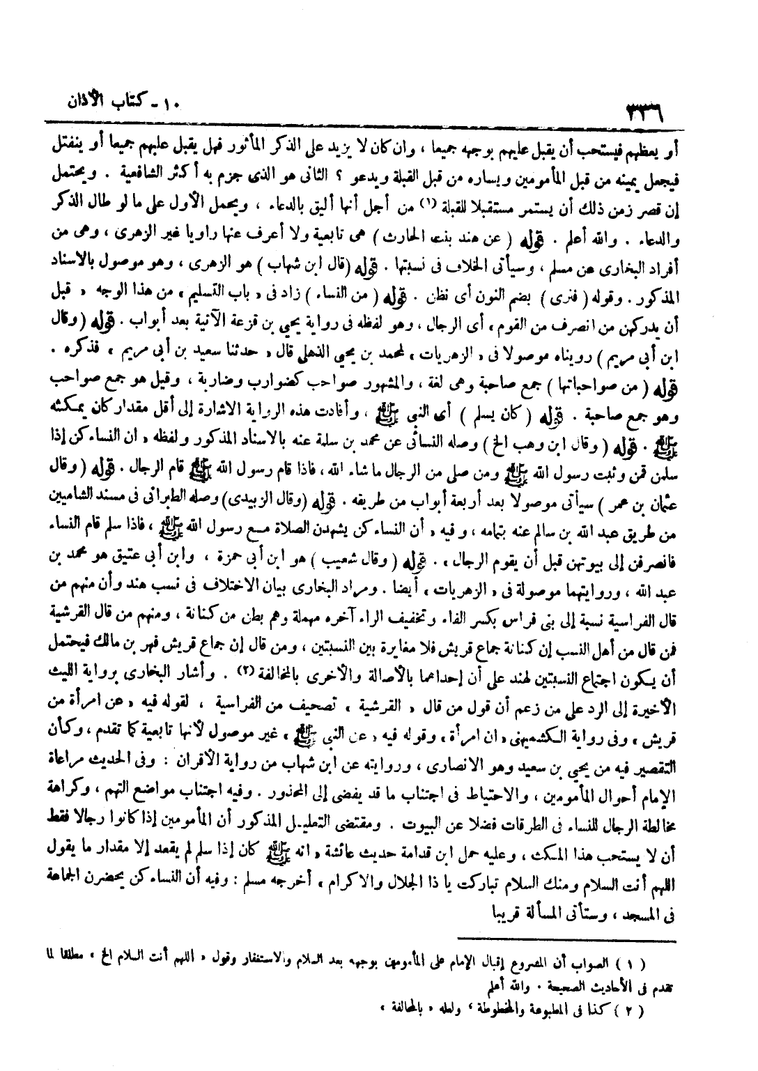[849] قَوْلُهُ عَنْ هِنْدِ بِنْتِ الْحَارِثِ هِيَ تَابِعِيَّةٌ وَلَا أَعْرِفُ عَنْهَا رَاوِيًا غَيْرَ الزُّهْرِيِّ وَهِيَ مِنْ أَفْرَادِ الْبُخَارِيِّ عَنْ مُسْلِمٍ وَسَيَأْتِي الْخِلَافُ فِي نسبتها قَوْله قَالَ بن شهَاب هُوَ الزُّهْرِيّ وَهُوَ مَوْصُول بِالْإِسْنَادِ الْمَذْكُورِ وَقَوْلُهُ فَنُرَى بِضَمِّ النُّونِ أَيْ نُظَنُّ قَوْلُهُ مِنَ النِّسَاءِ زَادَ فِي بَابِ التَّسْلِيمِ مِنْ هَذَا الْوَجْهِ قَبْلَ أَنْ يُدْرِكَهُنَّ مَنِ انْصَرَفَ مِنَ الْقَوْمِ أَيِ الرِّجَالِ وَهُوَ لَفْظُهُ فِي رِوَايَةِ يَحْيَى بْنِ قَزَعَةَ الْآتِيَةِ بعد أَبْوَاب قَوْله وَقَالَ بن أَبِي مَرْيَمَ رَوَيْنَاهُ مَوْصُولًا فِي الزُّهْرِيَّاتِ لِمُحَمَّدِ بْنِ يَحْيَى الذُّهْلِيِّ قَالَ حَدَّثَنَا سَعِيدُ بْنُ أَبِي مَرْيَمَ فَذَكَرَهُ قَوْلُهُ مِنْ صَوَاحِبَاتِهَا جَمْعُ صَاحِبَةٍ وَهِيَ لُغَةٌ وَالْمَشْهُورُ صَوَاحِبُ كَضَوَارِبَ وَضَارِبَةٍ وَقِيلَ هُوَ جَمْعُ صَوَاحِبَ وَهُوَ جَمْعُ صَاحِبَةٍ قَوْلُهُ كَانَ يُسَلِّمُ أَيِ النَّبِيُّ صَلَّى اللَّهُ عَلَيْهِ وَسَلَّمَ وَأَفَادَتْ هَذِهِ الرِّوَايَةُ الْإِشَارَةَ إِلَى أَقَلِّ مِقْدَارٍ كَانَ يَمْكُثُهُ صَلَّى اللَّهُ عَلَيْهِ وَسلم قَوْله وَقَالَ بن وَهْبٍ إِلَخْ وَصَلَهُ النَّسَائِيُّ عَنْ مُحَمَّدِ بْنِ سَلَمَةَ عَنْهُ بِالْإِسْنَادِ الْمَذْكُورِ وَلَفْظُهُ أَنَّ النِّسَاءَ كُنَّ إِذَا سَلَّمْنَ قُمْنَ وَثَبَتَ رَسُولِ اللَّهِ صَلَّى اللَّهُ عَلَيْهِ وَسَلَّمَ وَمِنْ صَلَّى مِنَ الرِّجَالِ مَا شَاءَ اللَّهُ فَإِذَا قَامَ رَسُولُ اللَّهِ صَلَّى اللَّهُ عَلَيْهِ وَسَلَّمَ قَامَ الرِّجَالُ قَوْلُهُ وَقَالَ عُثْمَانُ بْنُ عُمَرَ سَيَأْتِي مَوْصُولًا بَعْدَ أَرْبَعَةِ أَبْوَابٍ مِنْ طَرِيقِهِ قَوْلُهُ وَقَالَ الزُّبَيْدِيُّ وَصَلَهُ الطَّبَرَانِيُّ فِي مُسْنَدِ الشَّامِيِّينَ مِنْ طَرِيقِ عَبْدِ اللَّهِ بْنِ سَالِمٍ عَنْهُ بِتَمَامِهِ وَفِيهِ أَنَّ النِّسَاءَ كُنَّ يَشْهَدْنَ الصَّلَاةَ مَعَ رَسُولِ اللَّهِ صَلَّى اللَّهُ عَلَيْهِ وَسَلَّمَ فَإِذَا سَلَّمَ قَامَ النِّسَاءُ فَانْصَرَفْنَ إِلَى بُيُوتِهِنَّ قَبْلَ أَنْ يَقُومَ الرِّجَالُ قَوْلُهُ وَقَالَ شُعَيْبٌ هُوَ بن أبي حَمْزَة وبن أَبِي عَتِيقٍ هُوَ مُحَمَّدُ بْنُ عَبْدِ اللَّهِ وَرِوَايَتُهُمَا مَوْصُولَةٌ فِي الزُّهْرِيَّاتِ أَيْضًا وَمُرَادُ الْبُخَارِيِّ بَيَانُ الِاخْتِلَافِ فِي نَسَبِ هِنْدٍ وَأَنَّ مِنْهُمْ مَنْ قَالَ الْفِرَاسِيَّةُ نِسْبَةً إِلَى بَنِي فِرَاسٍ بِكَسْرِ الْفَاءِ وَتَخْفِيفِ الرَّاءِ آخِرُهُ مُهْمَلَةٌ وَهُمْ بَطْنٌ مِنْ كِنَانَةَ وَمِنْهُمْ مَنْ قَالَ الْقُرَشِيَّةُ فَمَنْ قَالَ مِنْ أَهْلِ النَّسَبِ إِنَّ كِنَانَةَ جِمَاعُ قُرَيْشٍ فَلَا مُغَايَرَةَ بَيْنَ النِّسْبَتَيْنِ وَمَنْ قَالَ إِنَّ جِمَاعَ قُرَيْشٍ فِهْرُ بْنُ مَالِكٍ فَيَحْتَمِلُ أَنْ يَكُونَ اجْتِمَاعُ النِّسْبَتَيْنِ لِهِنْدٍ عَلَى أَنَّ إِحْدَاهُمَا بِالْأَصَالَةِ وَالْأُخْرَى بِالْمُخَالَفَةِ وَأَشَارَ الْبُخَارِيُّ بِرِوَايَةِ اللَّيْثِ الْأَخِيرَةِ إِلَى الرَّدِّ عَلَى مَنْ زَعَمَ أَنَّ قَوْلَ مَنْ قَالَ الْقُرَشِيَّةَ تَصْحِيفٌ مِنَ الْفِرَاسِيَّةِ لِقَوْلِهِ فِيهِ عَنِ امْرَأَةٍ مِنْ قُرَيْشٍ وَفِي رِوَايَةِ الْكُشْمِيهَنِيِّ أَنَّ امْرَأَةً وَقَوْلُهُ فِيهِ عَنِ النَّبِيِّ صَلَّى اللَّهُ عَلَيْهِ وَسَلَّمَ غَيْرُ مَوْصُول لِأَنَّهَا تَابِعِيَّةٌ كَمَا تَقَدَّمَ وَكَأَنَّ التَّقْصِيرَ فِيهِ مِنْ يَحْيَى بْنِ سَعِيدٍ وَهُوَ الْأَنْصَارِيُّ وَرِوَايَتُهُ عَن بن شِهَابٍ مِنْ رِوَايَةِ الْأَقْرَانِ وَفِي الْحَدِيثِ مُرَاعَاةُ الْإِمَامِ أَحْوَالَ الْمَأْمُومِين