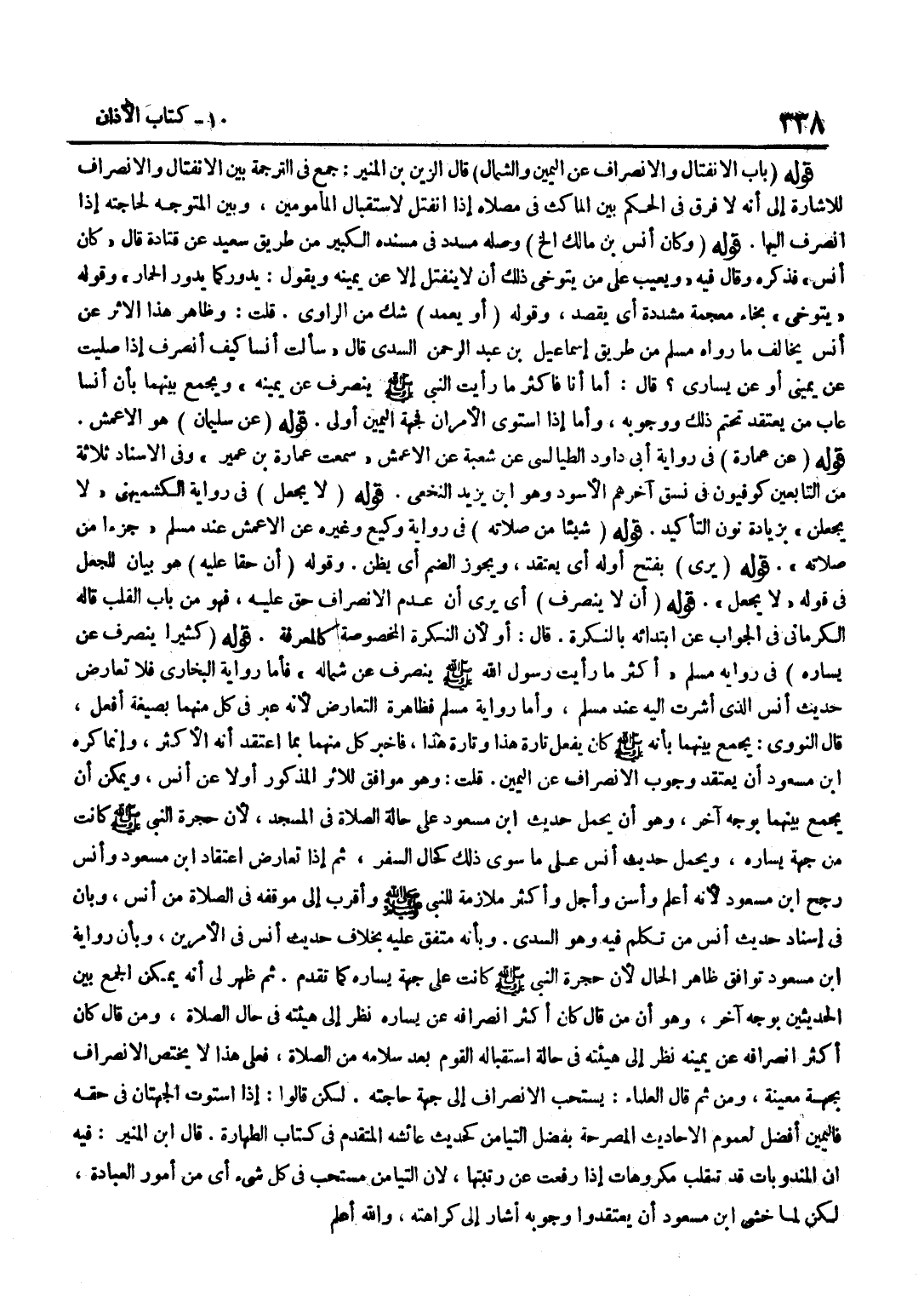 قَالَ الزَّيْنُ بْنُ الْمُنِيرِ جَمَعَ فِي التَّرْجَمَةِ بَيْنَ الِانْفِتَالِ وَالِانْصِرَافِ لِلْإِشَارَةِ إِلَى أَنَّهُ لَا فَرْقَ فِي الْحُكْمِ بَيْنَ الْمَاكِثِ فِي مُصَلَّاهُ إِذَا انْفَتَلَ لِاسْتِقْبَالِ الْمَأْمُومِينَ وَبَيْنَ الْمُتَوَجِّهِ لِحَاجَتِهِ إِذَا انْصَرَفَ إِلَيْهَا قَوْلُهُ وَكَانَ أَنَسُ بْنُ مَالِكٍ إِلَخْ وَصَلَهُ مُسَدَّدٌ فِي مُسْنَدِهِ الْكَبِيرِ مِنْ طَرِيقِ سَعِيدٍ عَنْ قَتَادَةَ قَالَ كَانَ أَنَسٌ فَذَكَرَهُ وَقَالَ فِيهِ وَيَعِيبُ عَلَى مَنْ يَتَوَخَّى ذَلِكَ أَنْ لَا يَنْفَتِلَ إِلَّا عَنْ يَمِينِهِ وَيَقُولُ يَدُورُ كَمَا يَدُورُ الْحِمَارُ وَقَوْلُهُ يَتَوَخَّى بِخَاءٍ مُعْجَمَةٍ مُشَدَّدَةٍ أَيْ يَقْصِدُ وَقَوْلُهُ أَوْ يَعْمِدُ شَكٌّ مِنَ الرَّاوِي قُلْتُ وَظَاهِرُ هَذَا الْأَثَرِ عَنْ أَنَسٍ يُخَالِفُ مَا رَوَاهُ مُسْلِمٌ مِنْ طَرِيقِ إِسْمَاعِيلَ بْنَ عَبْدِ الرَّحْمَنِ السُّدِّيِّ قَالَ سَأَلْتُ أَنَسًا كَيْفَ أَنْصَرِفُ إِذَا صَلَّيْتُ عَنْ يَمِينِي أَوْ عَنْ يَسَارِي قَالَ أَمَّا أَنَا فَأَكْثَرُ مَا رَأَيْتُ النَّبِيَّ صَلَّى اللَّهُ عَلَيْهِ وَسَلَّمَ يَنْصَرِفُ عَنْ يَمِينِهِ وَيُجْمَعُ بَيْنَهُمَا بِأَنَّ أَنَسًا عَابَ مَنْ يَعْتَقِدُ تَحَتُّمَ ذَلِكَ وَوُجُوبَهُ وَأَمَّا إِذَا اسْتَوَى الْأَمْرَانِ فَجِهَةُ الْيَمِينِ أَوْلَى