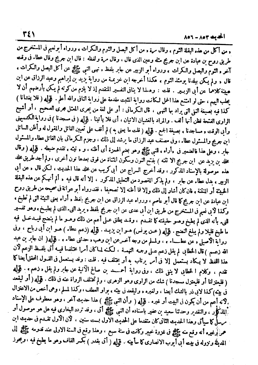 مَنْ أَكَلَ مِنْ هَذِهِ الْبَقْلَةِ الثُّومِ وَقَالَ مَرَّةً مَنْ أَكَلَ الْبَصَلَ وَالثُّومَ وَالْكُرَّاثَ وَرَوَاهُ أَبُو نُعَيْمٍ فِي الْمُسْتَخْرَجِ مِنْ طَرِيقِ رَوْحِ بن عبَادَة عَن بن جُرَيْجٍ مِثْلَهُ وَعَيَّنَ الَّذِي قَالَ وَقَالَ مَرَّةً وَلَفظه قَالَ بن جُرَيْجٍ وَقَالَ عَطَاءٌ فِي وَقْتٍ آخَرَ الثُّومُ وَالْبَصَلُ وَالْكُرَّاثُ وَرَوَاهُ أَبُو الزُّبَيْرِ عَنْ جَابِرٍ بِلَفْظِ نَهَى النَّبِيُّ صَلَّى اللَّهُ عَلَيْهِ وَسَلَّمَ عَنْ أَكْلِ الْبَصَلِ وَالْكُرَّاثِ قَالَ وَلَمْ يَكُنْ ببلدنا يَوْمئِذٍ الثوم هَكَذَا أخرجه بن خُزَيْمَةَ مِنْ رِوَايَةِ يَزِيدَ بْنِ إِبْرَاهِيمَ وَعَبْدِ الرَّزَّاق عَن بن عُيَيْنَة كِلَاهُمَا عَن أبي الزبير قلت وَهَذَا لَا يُنَافِي التَّفْسِيرَ الْمُتَقَدِّمَ إِذْ لَا يَلْزَمُ مِنْ كَوْنِهِ لَمْ يَكُنْ بِأَرْضِهِمْ أَنْ لَا يُجْلَبَ إِلَيْهِمْ حَتَّى لَوِ امْتَنَعَ هَذَا الْحَمْلُ لَكَانَتْ رِوَايَةُ الْمُثْبِتِ مُقَدَّمَةً عَلَى رِوَايَةِ النَّافِي وَاللَّهُ أَعْلَمُ قَوْلُهُ فَلَا يَغْشَانَا كَذَا فِيهِ بِصِيغَةِ النَّفْيِ الَّتِي يُرَادُ بِهَا النَّهْيُ قَالَ الْكِرْمَانِيُّ أَوْ عَلَى لُغَةِ مَنْ يُجْرِي الْمُعْتَلَّ مَجْرَى الصَّحِيحِ أَوْ أَشْبَعَ الرَّاوِي الْفَتْحَةَ فَظَنَّ أَنَّهَا أَلِفٌ وَالْمُرَادُ بِالْغَشَيَانِ الْإِتْيَانُ أَيْ فَلَا يأتينا قَوْلُهُ فِي مَسْجِدِنَا فِي رِوَايَةِ الْكُشْمِيهَنِيِّ وَأَبِي الْوَقْتِ مَسَاجِدِنَا بِصِيغَةِ الْجَمْعِ قَوْلُهُ قُلْتُ مَا يَعْنِي بِهِ لَمْ أَقِفْ عَلَى تَعْيِينِ الْقَائِلِ وَالْمقول لَهُ وأظن السَّائِل بن جريج والمسئول عَطاء وَفِي مُصَنَّفِ عَبْدِ الرَّزَّاقِ مَا يُرْشِدُ إِلَى ذَلِكَ وَجَزَمَ الْكِرْمَانِيُّ بِأَنَّ الْقَائِلَ عَطَاءٌ وَالْمَسْئُولَ جَابِرٌ وَعَلَى هَذَا فَالضَّمِيرُ فِي أُرَاهُ لِلنَّبِيِّ صَلَّى اللَّهُ عَلَيْهِ وَسَلَّمَ وَهُوَ بِضَمِّ الْهَمْزَةِ أَيْ أَظُنهُ ونيئه تَقَدَّمَ ضَبْطُهُ قَوْلُهُ وَقَالَ مَخْلَدُ بْنُ يَزِيدَ عَن بن جُرَيْجٍ إِلَّا نَتْنَهُ بِفَتْحِ النُّونِ وَسُكُونِ الْمُثَنَّاةِ مِنْ فَوْقَ بَعْدَهَا نُونٌ أُخْرَى وَلَمْ أَجِدْ طَرِيقَ مَخْلَدٍ هَذِهِ مَوْصُولَةً بِالْإِسْنَادِ الْمَذْكُورِ وَقَدْ أَخْرَجَ السَّرَّاجُ عَنْ أَبِي كُرَيْبٍ عَنْ مَخْلَدٍ هَذَا الْحَدِيثَ لَكِنْ قَالَ عَنْ أَبِي الزُّبَيْرِ بَدَلَ عَطَاءٍ عَنْ جَابِرٍ وَلَمْ يَذْكُرِ الْمَقْصُودَ مِنَ التَّعْلِيقِ الْمَذْكُورِ إِلَّا أَنَّهُ قَالَ فِيهِ أَلَمْ أَنْهَكُمْ عَنْ هَذِهِ الْبَقْلَةِ الْخَبِيثَةِ أَوِ الْمُنْتِنَةِ فَإِنْ كَانَ أَشَارَ إِلَى ذَلِكَ وَإِلَّا فَمَا أَظُنُّهُ إِلَّا تَصْحِيفًا فَقَدْ رَوَاهُ أَبُو عَوَانَةَ فِي صَحِيحِهِ مِنْ طَرِيقِ رَوْحِ بْنِ عبَادَة عَن بن جُرَيْجٍ كَمَا قَالَ أَبُو عَاصِمٍ وَرَوَاهُ عَبْدُ الرَّزَّاق عَن بن جُرَيْجٍ بِلَفْظِ أُرَاهُ يَعْنِي النِّيئَةَ الَّتِي لَمْ تُطْبَخْ وَكَذَا لِأَبِي نُعَيْمٍ فِي الْمُسْتَخْرَجِ مِنْ طَرِيق بن أبي عدي عَن بن جريج بِلَفْظ يُرِيد النئ الَّذِي لم يطْبخ وَهُوَ تَفْسِير النئ بِأَنَّهُ الَّذِي لَمْ يُطْبَخْ وَهُوَ حَقِيقَتُهُ كَمَا تَقَدَّمَ وَقَدْ يُطْلَقُ عَلَى أَعَمَّ مِنْ ذَلِكَ وَهُوَ مَا لَمْ يَنْضَجْ فَيَدْخُلُ فِيهِ مَا طبخ قَلِيلا وَلم يبلغ النَّضْح قَوْله عَن يُونُس هُوَ بن يزِيد قَوْله زعم عَطاء هُوَ بن أَبِي رَبَاحٍ وَفِي رِوَايَةِ الْأَصِيلِيِّ عَنْ عَطَاءٍ وَلمُسلم من وَجه آخر عَن بن وَهْبٍ حَدَّثَنِي عَطَاءٌ