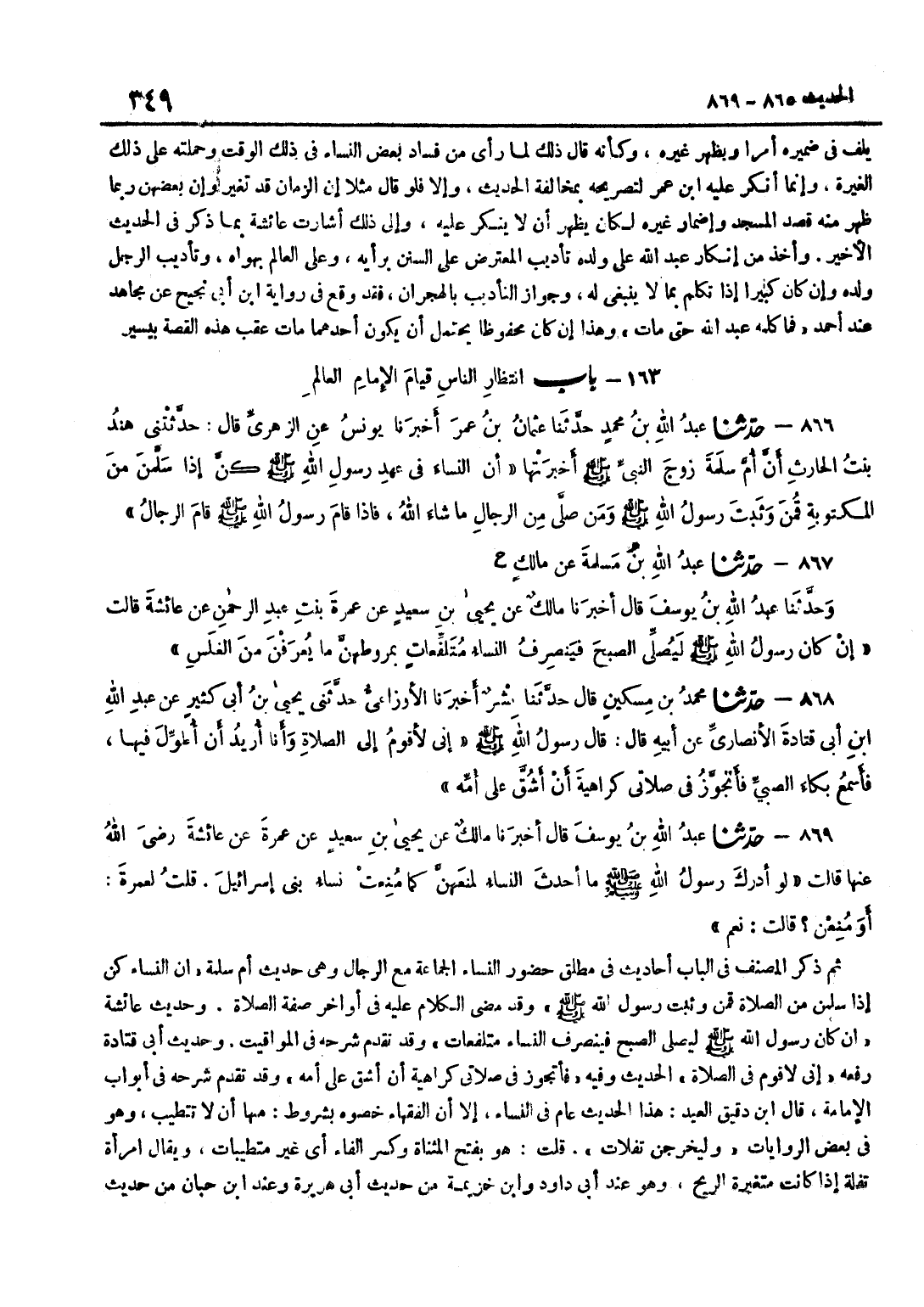 يَلُفُّ فِي ضَمِيرِهِ أَمْرًا وَيُظْهِرُ غَيْرَهُ وَكَأَنَّهُ قَالَ ذَلِكَ لَمَّا رَأَى مِنْ فَسَادِ بَعْضِ النِّسَاءِ فِي ذَلِكَ الْوَقْتِ وَحَمَلَتْهُ عَلَى ذَلِكَ الْغيرَة وَإِنَّمَا أنكر عَلَيْهِ بن عُمَرَ لِتَصْرِيحِهِ بِمُخَالَفَةِ الْحَدِيثِ وَإِلَّا فَلَوْ قَالَ مَثَلًا إِنَّ الزَّمَانَ قَدْ تَغَيَّرَ وَإِنَّ بَعْضَهُنَّ رُبَّمَا ظَهَرَ مِنْهُ قَصْدُ الْمَسْجِدِ وَإِضْمَارُ غَيْرِهِ لَكَانَ يَظْهَرُ أَنْ لَا يُنْكِرَ عَلَيْهِ وَإِلَى ذَلِكَ أَشَارَتْ عَائِشَةُ بِمَا ذُكِرَ فِي الْحَدِيثِ الْأَخِيرِ وَأُخِذَ مِنْ إِنْكَارِ عَبْدِ اللَّهِ عَلَى وَلَدِهِ تَأْدِيبُ الْمُعْتَرِضِ عَلَى السُّنَنِ بِرَأْيِهِ وَعَلَى الْعَالِمِ بِهَوَاهُ وَتَأْدِيبُ الرَّجُلِ وَلَدَهُ وَإِنْ كَانَ كَبِيرًا إِذَا تَكَلَّمَ بِمَا لَا يَنْبَغِي لَهُ وَجَوَازُ التَّأْدِيبِ بِالْهِجْرَانِ فَقَدْ وَقَعَ فِي رِوَايَةِ بن أَبِي نَجِيحٍ عَنْ مُجَاهِدٍ عِنْدَ أَحْمَدَ فَمَا كَلَّمَهُ عَبْدُ اللَّهِ حَتَّى مَاتَ وَهَذَا إِنْ كَانَ مَحْفُوظًا يَحْتَمِلُ أَنْ يَكُونَ أَحَدُهُمَا مَاتَ عَقِبَ هَذِهِ الْقِصَّةِ بِيَسِيرٍ حَدِيثُ أُمِّ سَلَمَةَ أَنَّ النِّسَاءَ كُنَّ إِذَا سَلَّمْنَ مِنَ الصَّلَاةِ قُمْنَ وَثَبَتَ رَسُولَ اللَّهِ صَلَّى اللَّهُ عَلَيْهِ وَسَلَّمَ قَدْ مَضَى الْكَلَامُ عَلَيْهِ فِي أَوَاخِرِ صِفَةِ الصَّلَاةِ حَدِيثُ عَائِشَةَ إِنْ كَانَ رَسُولُ اللَّهِ صَلَّى اللَّهُ عَلَيْهِ وَسَلَّمَ لَيُصَلِّي الصُّبْحَ فَيَنْصَرِفُ النِّسَاءُ مُتَلَفِّعَاتٍ وَقَدْ تَقَدَّمَ شَرْحُهُ فِي الْمَوَاقِيتِ حَدِيثُ أَبِي قَتَادَةَ رَفَعَهُ إِنِّي لَأَقُومُ فِي الصَّلَاةِ الْحَدِيثُ وَفِيهِ فَأَتَجَوَّزُ فِي صَلَاتِي كَرَاهِيَةَ أَنْ أَشُقَّ عَلَى أُمِّهِ وَقَدْ تَقَدَّمَ شَرحه فِي أَبْوَاب الْإِمَامَة قَالَ بن دَقِيقِ الْعِيدِ هَذَا الْحَدِيثُ عَامٌّ فِي النِّسَاءِ إِلَّا أَنَّ الْفُقَهَاءَ خَصُّوهُ بِشُرُوطٍ مِنْهَا أَنْ لَا تَتَطَيَّبَ وَهُوَ فِي بَعْضِ الرِّوَايَاتِ وَلْيَخْرُجْنَ تَفِلَاتٍ قُلْتُ هُوَ بِفَتْحِ الْمُثَنَّاةِ وَكَسْرِ الْفَاءِ أَيْ غَيْرَ مُتَطَيِّبَاتٍ وَيُقَالُ امْرَأَةٌ تَفِلَةٌ إِذَا كَانَتْ مُتَغَيِّرَةَ الرِّيحِ وَهُوَ عِنْدَ أَبِي دَاوُدَ وبن خُزَيْمَة من حَدِيث أبي هُرَيْرَة وَعند بن حِبَّانَ مِنْ حَدِيثِ زَيْدِ بْنِ خَالِدٍ وَأَوَّلُهُ لَا تَمْنَعُوا إِمَاءَ اللَّهِ مَسَاجِدَ اللَّهِ وَلِمُسْلِمٍ من حَدِيث زَيْنَب امْرَأَة بن مَسْعُودٍ إِذَا شَهِدَتْ إِحْدَاكُنَّ الْمَسْجِدَ فَلَا تَمَسَّنَّ طِيبًا انْتَهَى قَالَ وَيَلْحَقُ بِالطِّيبِ مَا فِي مَعْنَاهُ لِأَنَّ سَبَبَ الْمَنْعِ مِنْهُ مَا فِيهِ مِنْ تَحْرِيكِ دَاعِيَةِ الشَّهْوَةِ كَحُسْنِ الْمَلْبَسِ وَالْحُلِيِّ الَّذِي يَظْهَرُ وَالزِّينَةِ الْفَاخِرَةِ وَكَذَا الِاخْتِلَاطُ بِالرِّجَالِ وَفَرَّقَ كَثِيرٌ مِنَ الْفُقَهَاءِ الْمَالِكِيَّةِ وَغَيْرِهِمْ بَيْنَ الشَّابَّةِ وَغَيْرِهَا وَفِيهِ نَظَرٌ إِلَّا إِنْ أُخِذَ الْخَوْفُ عَلَيْهَا مِنْ جِهَتِهَا لِأَنَّهَا إِذَا عَرِيَتْ مِمَّا ذُكِرَ وَكَانَتْ مُسْتَتِرَةً حَصَلَ الْأَمْنُ عَلَيْهَا وَلَا سِيَّمَا إِذَا كَانَ ذَلِكَ بِاللَّيْلِ وَقَدْ وَرَدَ فِي بَعْضِ طُرُقِ هَذَا الْحَدِيثِ وَغَيْرِهِ مَا يَدُلُّ عَلَى أَنَّ صَلَاةَ الْمَرْأَةِ فِي بَيْتِهَا أَفْضَلُ مِنْ صَلَاتِهَا فِي الْمَسْجِدِ وَذَلِكَ فِي رِوَايَةِ حَبِيبِ بْنِ أَبِي ثَابِتٍ عَنِ بن عُمَرَ بِلَفْظِ لَا تَمْنَعُوا نِسَاءَكُمُ الْمَسَاجِدَ وَبُيُوتُهُنَّ خير لَهُنَّ أخرجه أَبُو دَاوُد وَصَححهُ بن خُزَيْمَةَ وَلِأَحْمَدَ وَالطَّبَرَانِيِّ مِنْ حَدِيثِ أُمِّ حُمَيْدٍ السَّاعِدِيَّ