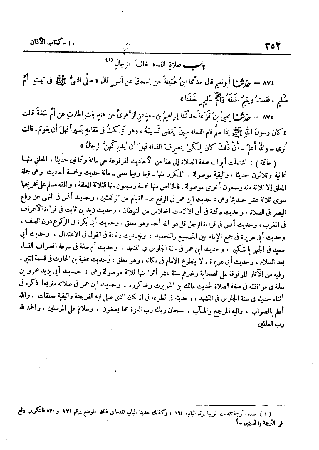 خَاتِمَةٌ اشْتَمَلَتْ أَبْوَابُ صِفَةِ الصَّلَاةِ إِلَى هُنَا مِنْ الْأَحَادِيثِ الْمَرْفُوعَةِ عَلَى مِائَةٍ وَثَمَانِينَ حَدِيثًا الْمُعَلَّقُ مِنْهَا ثَمَانِيَةٌ وَثَلَاثُونَ حَدِيثًا وَالْبَقِيَّةُ مَوْصُولَةٌ الْمُكَرَّرُ مِنْهَا فِيهَا وَفِيمَا مَضَى مِائَةُ حَدِيثٍ وَخَمْسَةُ أَحَادِيثَ وَهِيَ جُمْلَةُ الْمُعَلَّقِ إِلَّا ثَلَاثَةً مِنْهُ وَسَبْعُونَ أُخْرَى مَوْصُولَةٌ فَالْخَالِصُ مِنْهَا خَمْسَةٌ وَسَبْعُونَ مِنْهَا الثَّلَاثَةُ الْمُعَلَّقَةُ وَافَقَهُ مُسْلِمٌ عَلَى تَخْرِيجِهَا سِوَى ثَلَاثَةَ عَشَرَ حَدِيثًا وَهِيَ حَدِيثُ بن عُمَرَ فِي الرَّفْعِ عِنْدَ الْقِيَامِ مِنَ الرَّكْعَتَيْنِ وَحَدِيثُ أَنَسٍ فِي النَّهْي عَنْ رَفْعِ الْبَصَرِ فِي الصَّلَاةِ وَحَدِيثُ عَائِشَةَ فِي أَنَّ الِالْتِفَاتَ اخْتِلَاسٌ مِنَ الشَّيْطَانِ وَحَدِيثُ زَيْدِ بْنِ ثَابِتٍ فِي قِرَاءَةِ الْأَعْرَافِ فِي الْمَغْرِبِ وَحَدِيثُ أَنَسٍ فِي قِرَاءَةِ الرَّجُلِ قُلْ هُوَ اللَّه أَحَد وَهُوَ مُعَلَّقٌ وَحَدِيثُ أَبِي بَكْرَةَ فِي الرُّكُوعِ دُونَ الصَّفِّ وَحَدِيثُ أَبِي هُرَيْرَةَ فِي جَمْعِ الْإِمَامِ بَيْنَ التَّسْمِيعِ وَالتَّحْمِيدِ وَحَدِيثُ رِفَاعَةَ فِي الْقَوْلِ فِي الِاعْتِدَالِ وَحَدِيثُ أَبِي سَعِيدٍ فِي الْجَهْر بِالتَّكْبِيرِ وَحَدِيث بن عُمَرَ فِي سُنَّةِ الْجُلُوسِ فِي التَّشَهُّدِ وَحَدِيثُ أُمِّ سَلَمَةَ فِي سُرْعَةِ انْصِرَافِ النِّسَاءِ بَعْدَ السَّلَامِ وَحَدِيثُ أَبِي هُرَيْرَةَ لَا يَتَطَوَّعُ الْإِمَامُ فِي مَكَانِهِ وَهُوَ مُعَلَّقٌ وَحَدِيثُ عُقْبَةَ بْنِ الْحَارِثِ فِي قِسْمَةِ التِّبْرِ وَفِيهِ مِنَ الْآثَارِ الْمَوْقُوفَةِ عَلَى الصَّحَابَةِ وَغَيْرِهِمْ سِتَّةَ عَشَرَ أَثَرًا مِنْهَا ثَلَاثَةٌ مَوْصُولَةٌ وَهِيَ حَدِيثُ أَبِي يَزِيدَ عَمْرِو بْنِ سَلَمَةَ فِي مُوَافَقَتِهِ فِي صِفَةِ الصَّلَاةِ لِحَدِيثِ مَالِكِ بْنِ الْحُوَيْرِثِ وَقَدْ كَرَّرَهُ وَحَدِيث بن عُمَرَ فِي صَلَاتِهِ مُتَرَبِّعًا ذَكَرَهُ فِي أَثْنَاءِ حَدِيثِهِ فِي سُنَّةِ الْجُلُوسِ فِي التَّشَهُّدِ وَحَدِيثُهُ فِي تَطَوُّعِهِ فِي الْمَكَانِ الَّذِي صَلَّى فِيهِ الْفَرِيضَةَ وَالْبَقِيَّةُ مُعَلَّقَاتٌ وَاللَّهُ أَعْلَمُ بِالصَّوَابِ وَإِلَيْهِ الْمَرْجِعُ وَالْمَآبُ سُبْحَانَ رَبِّكَ رَبِّ الْعِزَّةِ عَمَّا يصفونَ وَسَلام على الْمُرْسلين وَالْحَمْد لله رب الْعَالمين