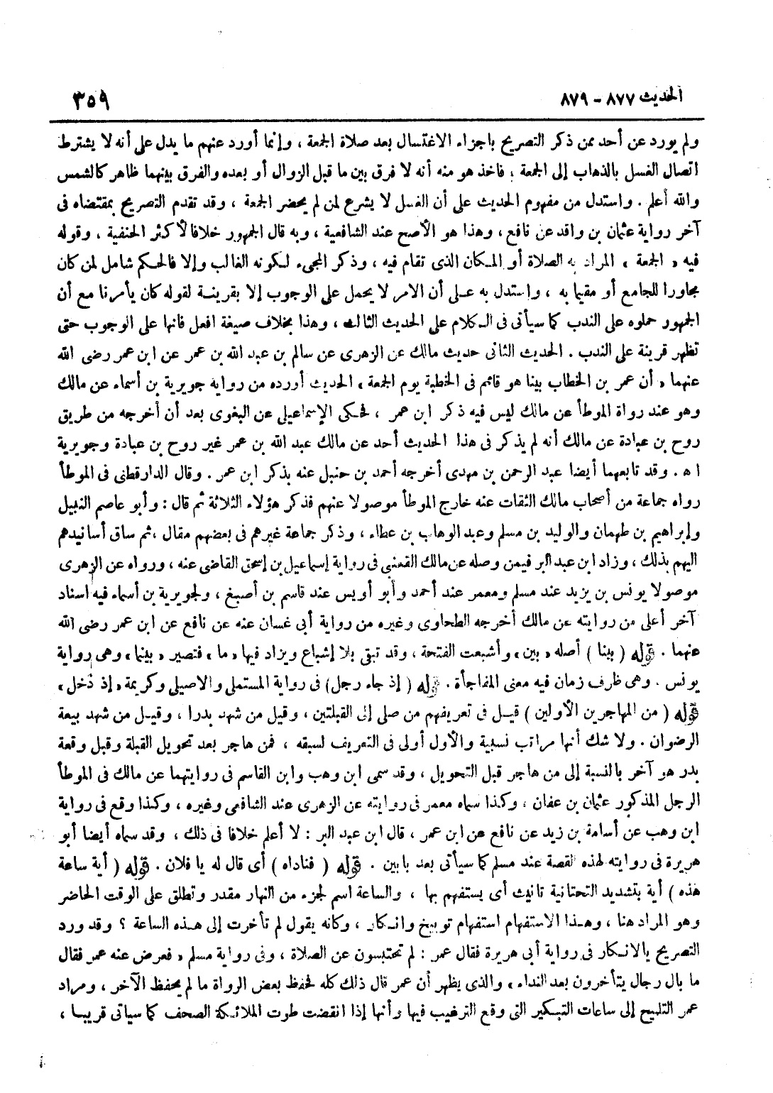 وَلَمْ يُورِدْ عَنْ أَحَدٍ مِمَّنْ ذَكَرَ التَّصْرِيحَ بِإِجْزَاءِ الِاغْتِسَالِ بَعْدَ صَلَاةِ الْجُمُعَةِ وَإِنَّمَا أَوْرَدَ عَنْهُمْ مَا يَدُلُّ عَلَى أَنَّهُ لَا يُشْتَرَطُ اتِّصَالُ الْغُسْلِ بِالذَّهَابِ إِلَى الْجُمُعَةِ فَأَخَذَ هُوَ مِنْهُ أَنَّهُ لَا فَرْقَ بَيْنَ مَا قَبْلَ الزَّوَالِ أَوْ بَعْدَهُ وَالْفَرْقُ بَيْنَهُمَا ظَاهِرٌ كَالشَّمْسِ وَاللَّهُ أَعْلَمُ وَاسْتُدِلَّ مِنْ مَفْهُومِ الْحَدِيثِ عَلَى أَنَّ الْغُسْلَ لَا يُشْرَعُ لِمَنْ لَمْ يَحْضُرِ الْجُمُعَةَ وَقَدْ تَقَدَّمَ التَّصْرِيحُ بِمُقْتَضَاهُ فِي آخِرِ رِوَايَةِ عُثْمَانَ بْنِ وَاقِدٍ عَنْ نَافِعٍ وَهَذَا هُوَ الْأَصَحُّ عِنْدَ الشَّافِعِيَّةِ وَبِهِ قَالَ الْجُمْهُورُ خِلَافًا لِأَكْثَرِ الْحَنَفِيَّةِ وَقَوْلُهُ فِيهِ الْجُمُعَةَ الْمُرَادُ بِهِ الصَّلَاةُ أَوِ الْمَكَانُ الَّذِي تُقَامُ فِيهِ وَذَكَرَ الْمَجِيءَ لِكَوْنِهِ الْغَالِبَ وَإِلَّا فَالْحُكْمُ شَامِلٌ لِمَنْ كَانَ مُجَاوِرًا لِلْجَامِعِ أَوْ مُقِيمًا بِهِ وَاسْتُدِلَّ بِهِ عَلَى أَنَّ الْأَمْرَ لَا يُحْمَلُ عَلَى الْوُجُوبِ إِلَّا بِقَرِينَةٍ لِقَوْلِهِ كَانَ يَأْمُرنَا مَعَ أَنَّ الْجُمْهُورَ حَمَلُوهُ عَلَى النَّدْبِ كَمَا سَيَأْتِي فِي الْكَلَامِ عَلَى الْحَدِيثِ الثَّالِثِ وَهَذَا بِخِلَافِ صِيغَةِ افْعَلْ فَإِنَّهَا عَلَى الْوُجُوبِ حَتَّى تظهر قرينَة على النّدب الحَدِيث الثَّانِي حَدِيثُ مَالِكٍ عَنِ الزُّهْرِيِّ عَنْ سَالِمِ بْنِ عَبْدِ اللَّهِ بْنِ عُمَرَ عَنْ بن عُمَرَ رَضِيَ اللهُ عَنْهُمَا أَنَّ عُمَرَ بْنَ الْخَطَّابِ بَيْنَا هُوَ قَائِمٌ فِي الْخُطْبَةِ يَوْمَ الْجُمُعَة الحَدِيث أوردهُ من رِوَايَة جوَيْرِية بن أَسْمَاءَ عَنْ مَالِكٍ وَهُوَ عِنْدَ رُوَاةِ الْمُوَطَّأِ عَن مَالك لَيْسَ فِيهِ ذكر بن عُمَرَ فَحَكَى الْإِسْمَاعِيلِيُّ عَنِ الْبَغَوِيِّ بَعْدَ أَنْ أَخْرَجَهُ مِنْ طَرِيقِ رَوْحِ بْنِ عُبَادَةَ عَنْ مَالِكٍ أَنَّهُ لَمْ يُذْكَرْ فِي هَذَا الْحَدِيثِ أحد عَن مَالك عَبْدِ اللَّهِ بْنِ عُمَرَ غَيْرُ رَوْحِ بْنِ عُبَادَةَ وَجُوَيْرِيَةَ اه وَقَدْ تَابَعَهُمَا أَيْضًا عَبْدُ الرَّحْمَنِ بْنُ مَهْدِيٍّ أَخْرَجَهُ أَحْمَدُ بنُ حَنْبَلَ عَنهُ بِذكر بن عُمَرَ وَقَالَ الدَّارَقُطْنِيُّ فِي الْمُوَطَّأِ رَوَاهُ جَمَاعَةٌ مِنْ أَصْحَابِ مَالِكٍ الثِّقَاتِ عَنْهُ خَارِجَ الْمُوَطَّأِ مَوْصُولًا عَنْهُمْ فَذَكَرَ هَؤُلَاءِ الثَّلَاثَةَ ثُمَّ قَالَ وَأَبُو عَاصِمٍ النَّبِيلُ وَإِبْرَاهِيمُ بْنُ طَهْمَانَ وَالْوَلِيدُ بْنُ مُسْلِمٍ وَعَبْدُ الْوَهَّابِ بْنُ عَطَاءٍ وَذَكَرَ جَمَاعَةً غَيْرَهُمْ فِي بَعْضِهِمْ مَقَالٌ ثُمَّ سَاقَ أسانيدهم إِلَيْهِم بذلك وَزَاد بن عَبْدِ الْبَرِّ فِيمَنْ وَصَلَهُ عَنْ مَالِكٍ الْقَعْنَبِيِّ فِي رِوَايَةِ إِسْمَاعِيلَ بْنِ إِسْحَاقَ الْقَاضِي عَنْهُ وَرَوَاهُ عَنِ الزُّهْرِيِّ مَوْصُولًا يُونُسُ بْنُ يَزِيدَ عِنْدَ مُسْلِمٍ وَمَعْمَرٌ عِنْدَ أَحْمَدَ وَأَبُو أُوَيْسٍ عِنْد قَاسم بن أصبغ ولجويرية بن أَسْمَاءَ فِيهِ إِسْنَادٌ آخَرُ أَعْلَى مِنْ رِوَايَتِهِ عَنْ مَالِكٍ أَخْرَجَهُ الطَّحَاوِيُّ وَغَيْرُهُ مِنْ رِوَايَةِ أبي غَسَّان عَنهُ عَن نَافِع عَن بن عُمَرَ رَضِيَ اللَّهُ عَنْهُمَا قَوْلُهُ بَيْنَا أَصْلُهُ بَيْنَ وَأُشْبِعَتِ الْفَتْحَةُ وَقَدْ تَبْقَى بِلَا إِشْبَاعٍ وَيُزَادُ فِيهَا مَا فَتَصِيرُ بَيْنَمَا وَهِيَ رِوَايَةُ يُونُسَ وَهِيَ ظَرْفُ زَمَانٍ فِيهِ مَعْنَى الْمُفَاجَأَةِ قَوْلُهُ إِذْ جَاءَ رَجُلٌ فِي رِوَايَةِ الْمُسْتَمْلِي وَالْأَصِيلِيِّ وَكَرِيمَةَ إِذْ دَخَلَ