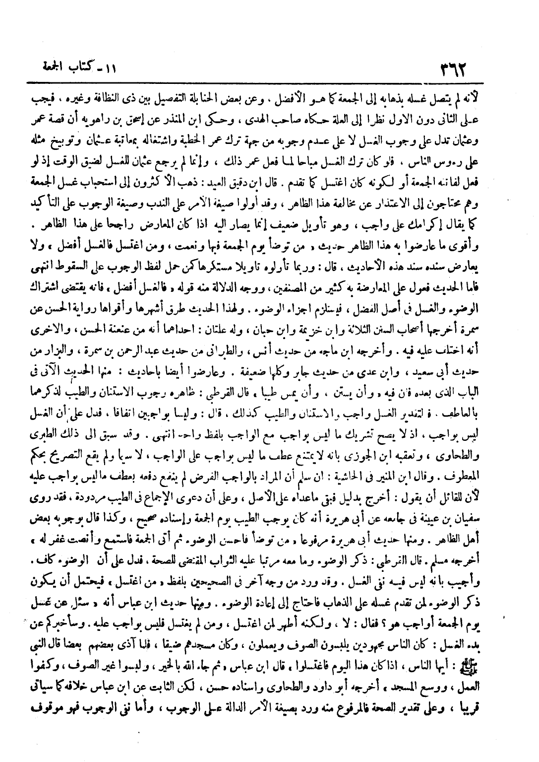لِأَنَّهُ لَمْ يَتَّصِلْ غُسْلَهُ بِذَهَابِهِ إِلَى الْجُمُعَةِ كَمَا هُوَ الْأَفْضَلُ وَعَنْ بَعْضِ الْحَنَابِلَةِ التَّفْصِيلُ بَيْنَ ذِي النَّظَافَةِ وَغَيْرِهِ فَيَجِبُ عَلَى الثَّانِي دُونَ الْأَوَّلِ نَظَرًا إِلَى الْعِلَّةِ حَكَاهُ صَاحِبُ الْهدى وَحكى بن الْمُنْذِرِ عَنْ إِسْحَاقَ بْنِ رَاهْوَيْهِ أَنَّ قِصَّةَ عُمَرَ وَعُثْمَانَ تَدُلُّ عَلَى وُجُوبِ الْغُسْلِ لَا عَلَى عَدَمِ وُجُوبِهِ مِنْ جِهَةِ تَرْكِ عُمَرَ الْخُطْبَةَ وَاشْتِغَالِهِ بِمُعَاتَبَةِ عُثْمَانَ وَتَوْبِيخِ مِثْلِهِ عَلَى رُؤُوس النَّاسِ فَلَوْ كَانَ تَرْكُ الْغُسْلِ مُبَاحًا لَمَا فَعَلَ عُمَرُ ذَلِكَ وَإِنَّمَا لَمْ يَرْجِعْ عُثْمَانُ لِلْغُسْلِ لِضِيقِ الْوَقْتِ إِذْ لَوْ فَعَلَ لَفَاتَتْهُ الْجُمُعَةُ أَوْ لِكَوْنِهِ كَانَ اغْتَسَلَ كَمَا تَقَدَّمَ قَالَ بن دَقِيقِ الْعِيدِ ذَهَبَ الْأَكْثَرُونَ إِلَى اسْتِحْبَابِ غُسْلِ الْجُمُعَةِ وَهُمْ مُحْتَاجُونَ إِلَى الِاعْتِذَارِ عَنْ مُخَالَفَةِ هَذَا الظَّاهِرِ وَقَدْ أَوَّلُوا صِيغَةَ الْأَمْرِ عَلَى النَّدْبِ وَصِيغَةَ الْوُجُوبِ عَلَى التَّأْكِيدِ كَمَا يُقَالُ إِكْرَامُكَ عَلَيَّ وَاجِبٌ وَهُوَ تَأْوِيلٌ ضَعِيفٌ إِنَّمَا يُصَارُ إِلَيْهِ إِذَا كَانَ الْمُعَارِضُ رَاجِحًا عَلَى هَذَا الظَّاهِرِ وَأَقْوَى مَا عَارَضُوا بِهِ هَذَا الظَّاهِرَ حَدِيثَ مَنْ تَوَضَّأَ يَوْمَ الْجُمُعَةِ فَبِهَا وَنِعْمَتْ وَمَنِ اغْتَسَلَ فَالْغُسْلُ أَفْضَلُ وَلَا يُعَارِضُ سَنَدُهُ سَنَدَ هَذِهِ الْأَحَادِيثِ قَالَ وَرُبَّمَا تَأَوَّلُوهُ تَأْوِيلًا مُسْتَكْرَهًا كَمَنْ حَمَلَ لَفْظَ الْوُجُوبِ عَلَى السُّقُوطِ انْتَهَى فَأَمَّا الْحَدِيثُ فَعَوَّلَ عَلَى الْمُعَارَضَةِ بِهِ كَثِيرٌ مِنَ الْمُصَنِّفِينَ وَوَجْهُ الدَّلَالَةِ مِنْهُ قَوْلُهُ فَالْغُسْلُ أَفْضَلُ فَإِنَّهُ يَقْتَضِي اشْتَرَاكَ الْوُضُوءِ وَالْغُسْلِ فِي أَصْلِ الْفَضْلِ فَيَسْتَلْزِمُ إِجْزَاءَ الْوُضُوءِ وَلِهَذَا الْحَدِيثِ طُرُقٌ أَشْهَرُهَا وَأَقْوَاهَا رِوَايَةُ الْحَسَنِ عَن سَمُرَة أخرجهَا أَصْحَاب السّنَن الثَّلَاثَة وبن خُزَيْمَة وبن حِبَّانَ وَلَهُ عِلَّتَانِ إِحْدَاهُمَا أَنَّهُ مِنْ عَنْعَنَةِ الْحَسَنِ وَالْأُخْرَى أَنَّهُ اخْتُلِفَ عَلَيْهِ فِيهِ وَأَخْرَجَهُ بن مَاجَهْ مِنْ حَدِيثِ أَنَسٍ وَالطَّبَرَانِيُّ مِنْ حَدِيثِ عَبْدِ الرَّحْمَنِ بْنِ سَمُرَةَ وَالْبَزَّارُ مِنْ حَدِيثِ أبي سعيد وبن عَدِيٍّ مِنْ حَدِيثِ جَابِرٍ وَكُلُّهَا ضَعِيفَةٌ وَعَارَضُوا أَيْضًا بِأَحَادِيثَ مِنْهَا الْحَدِيثُ الْآتِي فِي الْبَابِ الَّذِي بَعْدَهُ فَإِنَّ فِيهِ وَأَنْ يَسْتَنَّ وَأَنْ يَمَسَّ طِيبًا قَالَ الْقُرْطُبِيُّ ظَاهِرُهُ وُجُوبُ الِاسْتِنَانِ وَالطِّيبِ لِذِكْرِهِمَا بِالْعَاطِفِ فَالتَّقْدِيرُ الْغُسْلُ وَاجِبٌ وَالِاسْتِنَانُ وَالطِّيبُ كَذَلِكَ قَالَ وَلَيْسَا بِوَاجِبَيْنِ اتِّفَاقًا فَدَلَّ عَلَى أَنَّ الْغُسْلَ لَيْسَ بِوَاجِبٍ إِذْ لَا يَصِحُّ تَشْرِيكُ مَا لَيْسَ بِوَاجِبٍ مَعَ الْوَاجِبِ بِلَفْظٍ وَاحِدٍ انْتَهَى وَقَدْ سَبَقَ إِلَى ذَلِكَ الطَّبَرِيّ والطَّحَاوِي وَتعقبه بن الْجَوْزِيِّ بِأَنَّهُ لَا يَمْتَنِعُ عَطْفُ مَا لَيْسَ بِوَاجِبٍ عَلَى الْوَاجِبِ لَا سِيَّمَا وَلَمْ يَقَعِ التَّصْرِيح بِحكم الْمَعْطُوف وَقَالَ بن الْمُنِيرِ فِي الْحَاشِيَةِ إِنْ سَلِمَ أَنَّ الْمُرَادَ بِالْوَاجِبِ الْفَرْضُ لَمْ يَنْفَعْ دَفْعُهُ بِعِطْفِ مَا لَيْسَ بِوَاجِبٍ عَلَيْهِ لِأَنَّ لِلْقَائِلِ أَنْ يَقُولَ أُخْرِجَ بِدَلِيلٍ فَبَقِيَ مَا عَدَاهُ عَلَى الْأَصْلِ وَعَلَى أَنَّ دَعْوَى الْإِجْمَاعِ فِي الطِّيبِ مَرْدُودَةٌ فَقَدْ رَوَى سُفْيَانُ بْنُ عُيَيْن