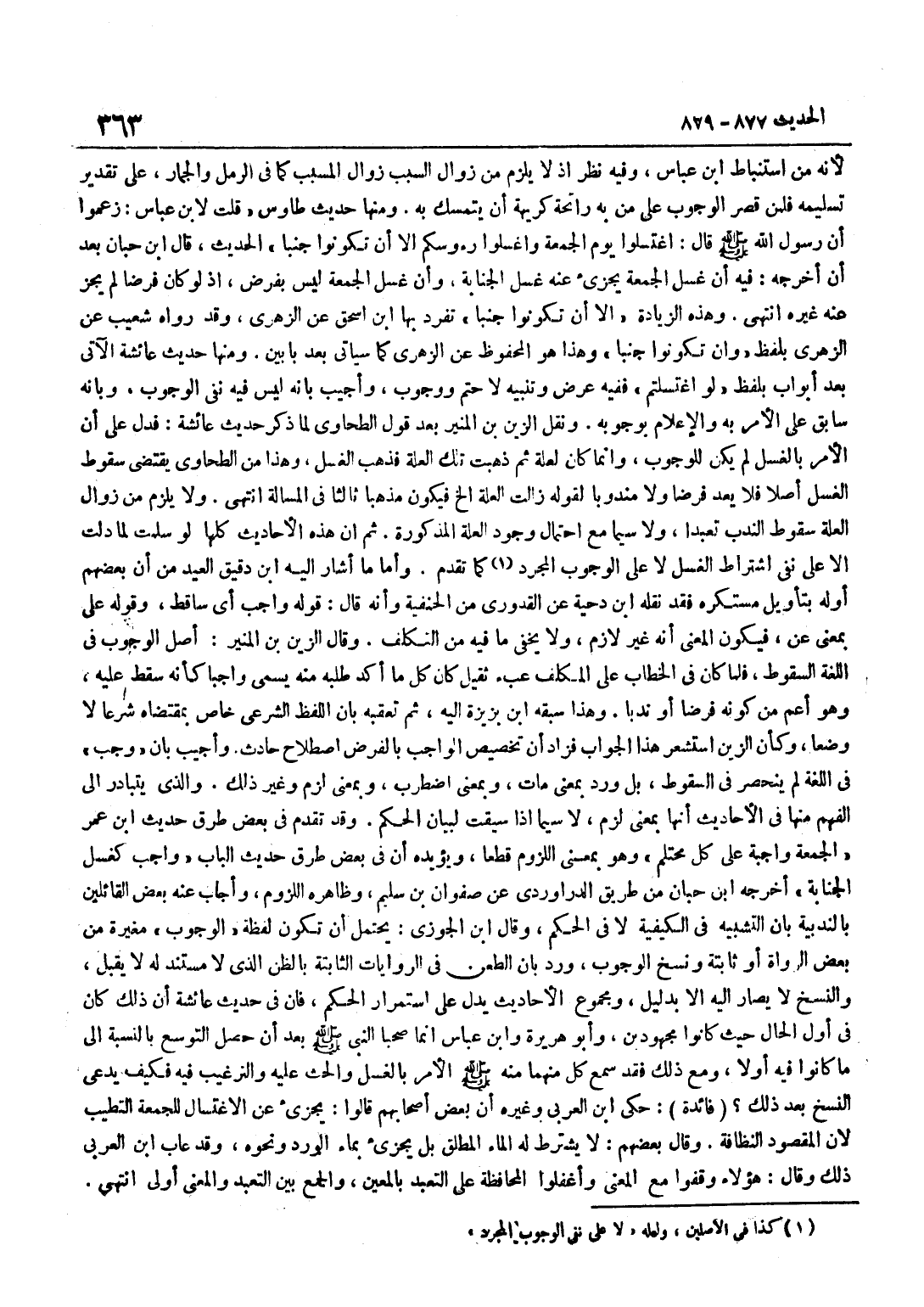 لِأَنَّهُ من استنباط بن عَبَّاسٍ وَفِيهِ نَظَرٌ إِذْ لَا يَلْزَمُ مِنْ زَوَالِ السَّبَبِ زَوَالُ الْمُسَبَّبِ كَمَا فِي الرَّمَلِ وَالْجِمَارِ عَلَى تَقْدِيرِ تَسْلِيمِهِ فَلِمَنْ قَصَرَ الْوُجُوبَ عَلَى مَنْ بِهِ رَائِحَةٌ كَرِيهَةٌ أَنْ يَتَمَسَّكَ بِهِ وَمِنْهَا حَدِيثُ طَاوُسٍ قُلْتُ لِابْنِ عَبَّاسٍ زَعَمُوا أَنَّ رَسُولَ اللَّهِ صَلَّى اللَّهُ عَلَيْهِ وَسَلَّمَ قَالَ اغْتَسِلُوا يَوْمَ الْجُمُعَةِ وَاغْسِلُوا رُءُوسَكُمُ الا أَن تَكُونُوا جنبا الحَدِيث قَالَ بن حِبَّانَ بَعْدَ أَنْ أَخْرَجَهُ فِيهِ أَنَّ غُسْلَ الْجُمُعَةِ يُجْزِئُ عَنْهُ غُسْلُ الْجَنَابَةِ وَأَنَّ غُسْلَ الْجُمُعَةِ لَيْسَ بِفَرْضٍ إِذْ لَوْ كَانَ فَرْضًا لَمْ يُجْزِ عَنْهُ غَيْرُهُ انْتَهَى وَهَذِهِ الزِّيَادَةُ الا أَن تَكُونُوا جنبا تفرد بهَا بن إِسْحَاقَ عَنِ الزُّهْرِيِّ وَقَدْ رَوَاهُ شُعَيْبٌ عَنِ الزُّهْرِيِّ بِلَفْظِ وَأَنْ تَكُونُوا جُنُبًا وَهَذَا هُوَ الْمَحْفُوظُ عَنِ الزُّهْرِيِّ كَمَا سَيَأْتِي بَعْدَ بَابَيْنِ وَمِنْهَا حَدِيثُ عَائِشَةَ الْآتِي بَعْدَ أَبْوَابٍ بِلَفْظِ لَوِ اغْتَسَلْتُمْ فَفِيهِ عَرْضٌ وَتَنْبِيهٌ لَا حَتْمَ وَوُجُوبٌ وَأُجِيبَ بِأَنَّهُ لَيْسَ فِيهِ نَفْيُ الْوُجُوبِ وَبِأَنَّهُ سَابِقٌ عَلَى الْأَمْرِ بِهِ وَالْإِعْلَامِ بِوُجُوبِهِ وَنَقَلَ الزَّيْنُ بْنُ الْمُنِيرِ بَعْدَ قَوْلِ الطَّحَاوِيِّ لَمَّا ذَكَرَ حَدِيثَ عَائِشَةَ فَدَلَّ عَلَى أَنَّ الْأَمْرَ بِالْغُسْلِ لَمْ يَكُنْ لِلْوُجُوبِ وَإِنَّمَا كَانَ لِعِلَّةٍ ثُمَّ ذَهَبَتْ تِلْكَ الْعِلَّةُ فَذَهَبَ الْغُسْلُ وَهَذَا مِنَ الطَّحَاوِيِّ يَقْتَضِي سُقُوطَ الْغُسْلِ أَصْلًا فَلَا يُعَدُّ فَرْضًا وَلَا مَنْدُوبًا لِقَوْلِهِ زَالَتِ الْعِلَّةُ إِلَخْ فَيَكُونُ مَذْهَبًا ثَالِثًا فِي الْمَسْأَلَةِ انْتَهَى وَلَا يَلْزَمُ مِنْ زَوَالِ الْعِلَّةِ سُقُوطُ النَّدْبِ تَعَبُّدًا وَلَا سِيَّمَا مَعَ احْتِمَالِ وُجُودِ الْعِلَّةِ الْمَذْكُورَةِ ثُمَّ إِنَّ هَذِهِ الْأَحَادِيثَ كُلَّهَا لَوْ سَلِمَتْ لَمَا دَلَّتْ إِلَّا عَلَى نَفْيِ اشْتِرَاطِ الْغُسْلِ لَا عَلَى الْوُجُوبِ الْمُجَرَّدِ كَمَا تقدم وَأما مَا أَشَارَ إِلَيْهِ بن دَقِيقِ الْعِيدِ مِنْ أَنَّ بَعْضَهُمْ أَوَّلَهُ بِتَأْوِيلٍ مستكره فقد نَقله بن دِحْيَةَ عَنِ الْقَدُورِيِّ مِنَ الْحَنَفِيَّةِ وَأَنَّهُ قَالَ قَوْلُهُ وَاجِبٌ أَيْ سَاقِطٌ وَقَوْلُهُ عَلَى بِمَعْنَى عَنْ فَيَكُونُ الْمَعْنَى أَنَّهُ غَيْرُ لَازِمٍ وَلَا يَخْفَى مَا فِيهِ مِنَ التَّكَلُّفِ وَقَالَ الزَّيْنُ بْنُ الْمُنِيرِ أَصْلُ الْوُجُوبِ فِي اللُّغَةِ السُّقُوطُ فَلَمَّا كَانَ فِي الْخِطَابِ عَلَى الْمُكَلَّفِ عِبْءٌ ثَقِيلٌ كَانَ كُلُّ مَا أُكِّدَ طَلَبُهُ مِنْهُ يُسَمَّى وَاجِبًا كَأَنَّهُ سَقَطَ عَلَيْهِ وَهُوَ أَعَمُّ مِنْ كَوْنِهِ فَرْضًا أَوْ نَدْبًا وَهَذَا سَبَقَهُ بن بَزِيزَةَ إِلَيْهِ ثُمَّ تَعَقَّبَهُ بِأَنَّ اللَّفْظَ الشَّرْعِيَّ خَاصٌّ بِمُقْتَضَاهُ شَرْعًا لَا وَضْعًا وَكَأَنَّ الزَّيْنَ اسْتَشْعَرَ هَذَا الْجَوَابَ فَزَادَ أَنَّ تَخْصِيصَ الْوَاجِبِ بِالْفَرْضِ اصْطِلَاحٌ حَادِثٌ وَأُجِيبَ بِأَنَّ وَجَبَ فِي اللُّغَةِ لَمْ يَنْحَصِرْ فِي السُّقُوطِ بَلْ وَرَدَ بِمَعْنَى مَاتَ وَبِمَعْنَى اضْطَرَبَ وَبِمَعْنَى لَزِمَ وَغَيْرِ ذَلِكَ وَالَّذِي يَتَبَادَرُ إِلَى الْفَهْمِ مِنْهَا فِي الْأَحَادِيثِ أَنَّهَا بِمَعْنَى لَزِمَ لَا سِيَّمَا إِذَا سِيقَتْ لِبَيَانِ الْحُكْمِ وَقَدْ تَقَدَّمَ فِي بَعْضِ طرق حَدِيث بن عُمَرَ الْجُمُعَةُ وَاجِبَةٌ عَلَى كُلِّ مُحْتَلِمٍ وَهُوَ بِمَعْنَى اللُّزُومِ قَطْعًا وَيُؤَيِّدُهُ أَنَّ فِي بَعْضِ طُرُقِ حَدِيث