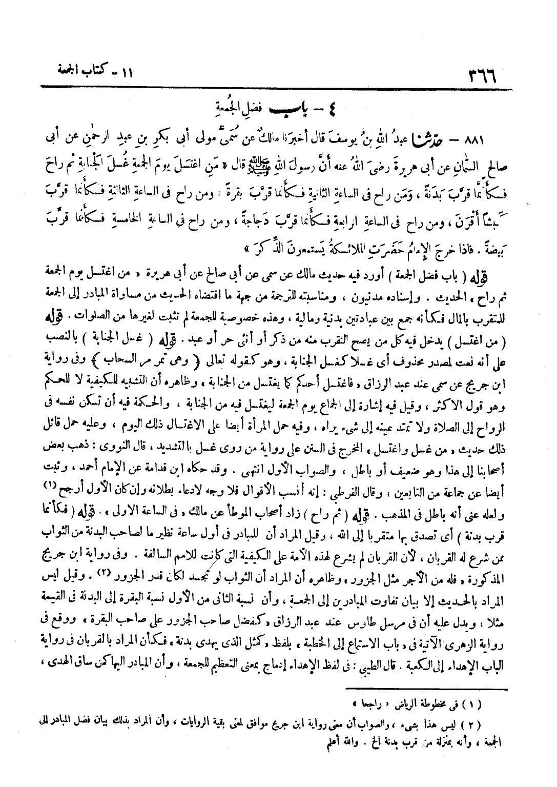 [881] قَوْلُهُ مَنِ اغْتَسَلَ يَدْخُلُ فِيهِ كُلُّ مَنْ يَصِحُّ التَّقَرُّبُ مِنْهُ مِنْ ذَكَرٍ أَوْ أُنْثَى حُرٍّ أَوْ عَبْدٍ قَوْلُهُ غُسْلَ الْجَنَابَةِ بِالنَّصْبِ عَلَى أَنَّهُ نَعْتٌ لِمَصْدَرٍ مَحْذُوفٍ أَيْ غُسْلًا كَغُسْلِ الْجَنَابَةِ وَهُوَ كَقَوْلِه تَعَالَى وَهِي تمر مر السَّحَاب وَفِي رِوَايَة بن جُرَيْجٍ عَنْ سُمَيٍّ عِنْدَ عَبْدِ الرَّزَّاقِ فَاغْتَسَلَ أَحَدُكُمْ كَمَا يَغْتَسِلُ مِنَ الْجَنَابَةِ وَظَاهِرُهُ أَنَّ التَّشْبِيهَ لِلْكَيْفِيَّةِ لَا لِلْحُكْمِ وَهُوَ قَوْلُ الْأَكْثَرِ وَقِيلَ فِيهِ إِشَارَةٌ إِلَى الْجِمَاعِ يَوْمَ الْجُمُعَةِ لِيَغْتَسِلَ فِيهِ مِنَ الْجَنَابَةِ وَالْحِكْمَةُ فِيهِ أَنْ تَسْكُنَ نَفْسُهُ فِي الرَّوَاحِ إِلَى الصَّلَاةِ وَلَا تَمْتَدُّ عَيْنُهُ إِلَى شَيْءٍ يَرَاهُ وَفِيهِ حَمْلُ الْمَرْأَةِ أَيْضًا عَلَى الِاغْتِسَالِ ذَلِكَ الْيَوْمَ وَعَلَيْهِ حَمَلَ قَائِلُ ذَلِكَ حَدِيثُ مَنْ غَسَّلَ وَاغْتَسَلَ الْمُخَرَّجُ فِي السُّنَنِ عَلَى رِوَايَةِ مَنْ رَوَى غَسَّلَ بِالتَّشْدِيدِ قَالَ النَّوَوِيُّ ذَهَبَ بَعْضُ أَصْحَابِنَا إِلَى هَذَا وَهُوَ ضَعِيفٌ أَوْ بَاطِلٌ وَالصَّوَابُ الأول انْتهى وَقد حَكَاهُ بن قُدَامَةَ عَنِ الْإِمَامِ أَحْمَدَ وَثَبَتَ أَيْضًا عَنْ جَمَاعَةٍ مِنَ التَّابِعِينَ وَقَالَ الْقُرْطُبِيُّ إِنَّهُ أَنْسَبُ الْأَقْوَالِ فَلَا وَجْهَ لِادِّعَاءِ بُطْلَانِهِ وَإِنْ كَانَ الْأَوَّلُ أَرْجَحَ وَلَعَلَّهُ عَنَى أَنَّهُ بَاطِلٌ فِي الْمَذْهَبِ قَوْلُهُ ثُمَّ رَاحَ زَادَ أَصْحَابُ الْمُوَطَّأِ عَنْ مَالِكٍ فِي السَّاعَةِ الْأُولَى قَوْلُهُ فَكَأَنَّمَا قَرَّبَ بَدَنَةً أَيْ تَصَدَّقَ بِهَا مُتَقَرِّبًا إِلَى اللَّهِ وَقِيلَ الْمُرَادُ أَنَّ لِلْمُبَادِرِ فِي أَوَّلِ سَاعَةٍ نَظِيرَ مَا لِصَاحِبِ الْبَدَنَةِ مِنَ الثَّوَابِ مِمَّنْ شُرِعَ لَهُ الْقُرْبَانُ لِأَنَّ الْقُرْبَانَ لَمْ يُشْرَعْ لِهَذِهِ الْأُمَّةِ عَلَى الْكَيْفِيَّةِ الَّتِي كَانَتْ للامم السالفة وَفِي رِوَايَة بن جُرَيْجٍ الْمَذْكُورَةِ فَلَهُ مِنَ الْأَجْرِ مِثْلُ الْجَزُورِ وَظَاهِرُهُ أَنَّ الْمُرَادَ أَنَّ الثَّوَابَ لَوْ تَجَسَّدَ لَكَانَ قَدْرَ الْجَزُورِ وَقِيلَ لَيْسَ الْمُرَادُ بِالْحَدِيثِ إِلَّا بَيَانَ تَفَاوُتِ الْمُبَادِرِينَ إِلَى الْجُمُعَةِ وَأَنَّ نِسْبَةَ الثَّانِي مِنَ الْأَوَّلِ نِسْبَةُ الْبَقَرَةِ إِلَى الْبَدَنَةِ فِي الْقِيمَةِ مَثَلًا وَيَدُلُّ عَلَيْهِ أَنَّ فِي مُرْسَلِ طَاوُسٍ عِنْدَ عَبْدِ الرَّزَّاقِ كَفَضْلِ صَاحِبِ الْجَزُورِ عَلَى صَاحِبِ الْبَقَرَةِ وَوَقَعَ فِي رِوَايَةِ الزُّهْرِيِّ الْآتِيَةِ فِي بَابِ الِاسْتِمَاعِ إِلَى الْخُطْبَةِ بِلَفْظِ كَمِثْلِ الَّذِي يُهْدِي بَدَنَةً فَكَأَنَّ الْمُرَادَ بِالْقُرْبَانِ فِي رِوَايَةِ الْبَابِ الْإِهْدَاءُ إِلَى الْكَعْبَةِ قَالَ الطِّيبِيُّ فِي لَفْظِ الْإِهْدَاءِ إِدْمَاجٌ بِمَعْنَى التَّعْظِيمِ لِلْجُمُعَةِ وَأَنَّ الْمُبَادِرَ إِلَيْهَا كَمَنْ سَاق الْهدى