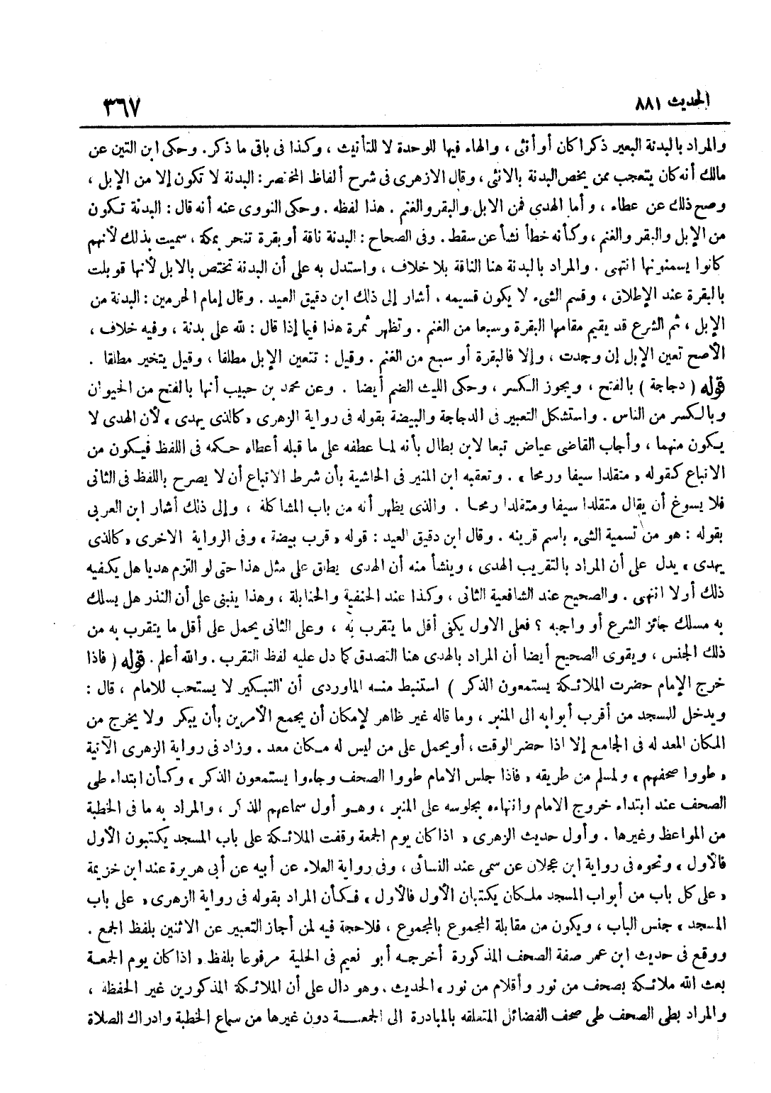 وَالْمُرَادُ بِالْبَدَنَةِ الْبَعِيرُ ذَكَرًا كَانَ أَوْ أُنْثَى وَالْهَاءُ فِيهَا لِلْوَحْدَةِ لَا لِلتَّأْنِيثِ وَكَذَا فِي بَاقِي مَا ذكر وَحكى بن التِّينِ عَنْ مَالِكٍ أَنَّهُ كَانَ يَتَعَجَّبُ مِمَّنْ يَخُصُّ الْبَدَنَةَ بِالْأُنْثَى وَقَالَ الْأَزْهَرِيُّ فِي شَرْحِ أَلْفَاظِ الْمُخْتَصَرِ الْبَدَنَةُ لَا تَكُونُ إِلَّا مِنَ الْإِبِلِ وَصَحَّ ذَلِكَ عَنْ عَطَاءٍ وَأَمَّا الْهَدْيُ فَمِنَ الْإِبِلِ وَالْبَقَرِ وَالْغَنَمِ هَذَا لَفْظُهُ وَحَكَى النَّوَوِيُّ عَنْهُ أَنَّهُ قَالَ الْبَدَنَةُ تَكُونُ مِنَ الْإِبِلِ وَالْبَقَرِ وَالْغَنَمِ وَكَأَنَّهُ خَطَأٌ نَشَأَ عَنْ سَقْطٍ وَفِي الصِّحَاحِ الْبَدَنَةُ نَاقَةٌ أَوْ بَقَرَةٌ تُنْحَرُ بِمَكَّةَ سُمِّيَتْ بِذَلِكَ لِأَنَّهُمْ كَانُوا يُسَمِّنُونَهَا انْتَهَى وَالْمُرَادُ بِالْبَدَنَةِ هُنَا النَّاقَةُ بِلَا خِلَافٍ وَاسْتُدِلَّ بِهِ عَلَى أَنَّ الْبَدَنَةَ تَخْتَصُّ بِالْإِبِلِ لِأَنَّهَا قُوبِلَتْ بِالْبَقَرَةِ عِنْدَ الْإِطْلَاقِ وَقَسْمُ الشَّيْءِ لَا يكون قسيمه أَشَارَ إِلَى ذَلِك بن دَقِيقِ الْعِيدِ وَقَالَ إِمَامُ الْحَرَمَيْنِ الْبَدَنَةُ مِنَ الْإِبِلِ ثُمَّ الشَّرْعُ قَدْ يُقِيمُ مَقَامَهَا الْبَقَرَةَ وَسَبْعًا مِنَ الْغَنَمِ وَتَظْهَرُ ثَمَرَةُ هَذَا فِيمَا إِذَا قَالَ لِلَّهِ عَلَيَّ بَدَنَةٌ وَفِيهِ خِلَافٌ الْأَصَحُّ تَعَيُّنُ الْإِبِلِ إِنْ وُجِدَتْ وَإِلَّا فَالْبَقَرَةُ أَوْ سَبْعٌ مِنَ الْغَنَمِ وَقِيلَ تَتَعَيَّنُ الْإِبِلُ مُطْلَقًا وَقِيلَ يَتَخَيَّرُ مُطْلَقًا قَوْلُهُ دَجَاجَةً بِالْفَتْحِ وَيَجُوزُ الْكَسْرُ وَحَكَى اللَّيْثُ الضَّمَّ أَيْضًا وَعَنْ مُحَمَّدِ بْنِ حَبِيبٍ أَنَّهَا بِالْفَتْحِ مِنَ الْحَيَوَانِ وَبِالْكَسْرِ مِنَ النَّاسِ وَاسْتُشْكِلَ التَّعْبِيرُ فِي الدَّجَاجَةِ وَالْبَيْضَةِ بِقَوْلِهِ فِي رِوَايَةِ الزُّهْرِيِّ كَالَّذِي يُهْدِي لِأَنَّ الْهَدْيَ لَا يَكُونُ مِنْهُمَا وَأَجَابَ الْقَاضِي عِيَاضٌ تَبَعًا لِابْنِ بَطَّالٍ بِأَنَّهُ لَمَّا عَطَفَهُ عَلَى مَا قَبْلِهِ أَعْطَاهُ حُكْمَهُ فِي اللَّفْظِ فَيَكُونُ مِنَ الِاتِّبَاعِ كَقَوْلِهِ مُتَقَلِّدًا سَيْفًا وَرُمْحًا وَتعقبه بن الْمُنِيرِ فِي الْحَاشِيَةِ بِأَنَّ شَرْطَ الِاتِّبَاعِ أَنْ لَا يُصَرِّحَ بِاللَّفْظِ فِي الثَّانِي فَلَا يَسُوغُ أَنْ يُقَالَ مُتَقَلِّدًا سَيْفًا وَمُتَقَلِّدًا رُمْحًا وَالَّذِي يَظْهَرُ أَنَّهُ مِنْ بَابِ الْمُشَاكَلَةِ وَإِلَى ذَلِكَ أَشَارَ بن الْعَرَبِيُّ بِقَوْلِهِ هُوَ مِنْ تَسْمِيَةِ الشَّيْءِ بِاسْمِ قرينه وَقَالَ بن دَقِيقِ الْعِيدِ قَوْلُهُ قَرَّبَ بَيْضَةً وَفِي الرِّوَايَةِ الْأُخْرَى كَالَّذِي يُهْدِي يَدُلُّ عَلَى أَنَّ الْمُرَادَ بِالتَّقْرِيبِ الْهَدْيُ وَيَنْشَأُ مِنْهُ أَنَّ الْهَدْيَ يُطْلَقُ عَلَى مِثْلِ هَذَا حَتَّى لَوِ الْتَزَمَ هَدْيًا هَل يَكْفِيهِ ذَلِك أَولا انْتَهَى وَالصَّحِيحُ عِنْدَ الشَّافِعِيَّةِ الثَّانِي وَكَذَا عِنْدَ الْحَنَفِيَّةِ وَالْحَنَابِلَةِ وَهَذَا يَنْبَنِي عَلَى أَنَّ النَّذْرَ هَلْ يَسْلُكُ بِهِ مَسْلَكَ جَائِزِ الشَّرْعِ أَوْ وَاجِبِهِ فَعَلَى الْأَوَّلِ يَكْفِي أَقَلُّ مَا يُتَقَرَّبُ بِهِ وَعَلَى الثَّانِي يُحْمَلُ عَلَى أَقَلِّ مَا يُتَقَرَّبُ بِهِ مِنْ ذَلِكَ الْجِنْسِ وَيُقَوِّي الصَّحِيحَ أَيْضًا أَنَّ الْمُرَادَ بِالْهَدْيِ هُنَا التَّصَدُّقُ كَمَا دَلَّ عَلَيْهِ لَفْظُ التَّقَرُّبِ وَاللَّهُ أَعْلَمُ قَوْلُهُ فَإِذَا خَرَجَ الْإِمَامُ حَضَرَتِ الْمَلَائِكَةُ يَسْتَمِعُونَ الذِّكْرَ اسْتَنْبَطَ مِنْهُ الْمَاوَرْدِيُّ أَنَّ التَّبْكِيرَ لَا يُسْتَحَبُّ لِلْإِمَامِ قَالَ وَيَدْخُلُ لِلْمَسْجِدِ مِنْ أ