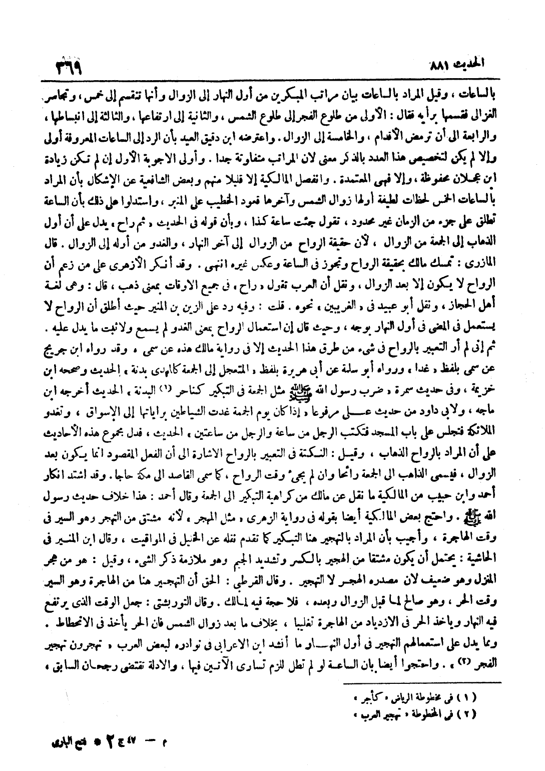 بِالسَّاعَاتِ وَقِيلَ الْمُرَادُ بِالسَّاعَاتِ بَيَانُ مَرَاتِبِ الْمُبَكِّرِينَ مِنْ أَوَّلِ النَّهَارِ إِلَى الزَّوَالِ وَأَنَّهَا تَنْقَسِمُ إِلَى خَمْسٍ وَتَجَاسَرَ الْغَزَالِيُّ فَقَسَّمَهَا بِرَأْيِهِ فَقَالَ الْأُولَى مِنْ طُلُوعِ الْفَجْرِ إِلَى طُلُوعِ الشَّمْسِ وَالثَّانِيَةُ إِلَى ارْتِفَاعِهَا وَالثَّالِثَةُ إِلَى انْبِسَاطِهَا وَالرَّابِعَةُ إِلَى أَنْ تَرْمَضَ الْأَقْدَامُ وَالْخَامِسَةُ إِلَى الزَّوَالِ وَاعْتَرضهُ بن دَقِيقِ الْعِيدِ بِأَنَّ الرَّدَّ إِلَى السَّاعَاتِ الْمَعْرُوفَةِ أَوْلَى وَإِلَّا لَمْ يَكُنْ لِتَخْصِيصِ هَذَا الْعَدَدِ بِالذِّكْرِ مَعْنًى لِأَنَّ الْمَرَاتِبَ مُتَفَاوِتَةٌ جِدًّا وَأَوْلَى الْأَجْوِبَة الأول إِن لم تكن زِيَادَة بن عَجْلَانَ مَحْفُوظَةً وَإِلَّا فَهِيَ الْمُعْتَمَدَةُ وَانْفَصَلَ الْمَالِكِيَّةُ إِلَّا قَلِيلًا مِنْهُمْ وَبَعْضُ الشَّافِعِيَّةِ عَنِ الْإِشْكَالِ بِأَنَّ الْمُرَادَ بِالسَّاعَاتِ الْخَمْسِ لَحَظَاتٌ لَطِيفَةٌ أَوَّلُهَا زَوَالُ الشَّمْسِ وَآخِرُهَا قُعُودُ الْخَطِيبِ عَلَى الْمِنْبَرِ وَاسْتَدَلُّوا عَلَى ذَلِكَ بِأَنَّ السَّاعَةَ تُطْلَقُ عَلَى جُزْءٍ مِنَ الزَّمَانِ غَيْرِ مَحْدُودٍ تَقُولُ جِئْتُ سَاعَة كَذَا وَبِأَن قَوْله فىالحديث ثُمَّ رَاحَ يَدُلُّ عَلَى أَنَّ أَوَّلَ الذَّهَابِ إِلَى الْجُمُعَةِ مِنَ الزَّوَالِ لِأَنَّ حَقِيقَةَ الرَّوَاحِ مِنَ الزَّوَالِ إِلَى آخَرِ النَّهَارِ وَالْغُدُوُّ مِنْ أَوَّلِهِ إِلَى الزَّوَالِ قَالَ الْمَازِرِيُّ تَمَسَّكَ مَالِكٌ بِحَقِيقَةِ الرَّوَاحِ وَتَجَوَّزَ فِي السَّاعَةِ وَعَكَسَ غَيْرُهُ انْتَهَى وَقَدْ أَنْكَرَ الْأَزْهَرِيُّ عَلَى مَنْ زَعَمَ أَنَّ الرَّوَاحَ لَا يَكُونُ إِلَّا بَعْدَ الزَّوَالِ وَنَقَلَ أَنَّ الْعَرَبَ تَقُولُ رَاحَ فِي جَمِيعِ الْأَوْقَاتِ بِمَعْنَى ذَهَبَ قَالَ وَهِيَ لُغَةُ أَهْلِ الْحِجَازِ وَنَقَلَ أَبُو عُبَيْدٍ فِي الْغَرِيبَيْنِ نَحْوَهُ قُلْتُ وَفِيهِ رَدٌّ عَلَى الزَّيْنِ بْنِ الْمُنِيرِ حَيْثُ أَطْلَقَ أَنَّ الرَّوَاحِ لَا يُسْتَعْمَلُ فِي الْمُضِيِّ فِي أَوَّلِ النَّهَارِ بِوَجْهٍ وَحَيْثُ قَالَ إِنَّ اسْتِعْمَالَ الرَّوَاحِ بِمَعْنَى الْغُدُوِّ لَمْ يُسْمَعْ وَلَا ثَبَتَ مَا يَدُلُّ عَلَيْهِ ثُمَّ إِنِّي لَمْ أَرَ التَّعْبِيرَ بِالرَّوَاحِ فِي شَيْءٍ مِنْ طُرُقِ هَذَا الْحَدِيثِ إِلَّا فِي رِوَايَةِ مَالِكٍ هَذِه عَن سمي وَقد رَوَاهُ بن جُرَيْجٍ عَنْ سُمَيٍّ بِلَفْظِ غَدَا وَرَوَاهُ أَبُو سَلَمَةَ عَنْ أَبِي هُرَيْرَةَ بِلَفْظِ الْمُتَعَجِّلُ إِلَى الْجُمُعَة كالمهدي بَدَنَة الحَدِيث وَصَححهُ بن خُزَيْمَةَ وَفِي حَدِيثِ سَمُرَةَ ضَرَبَ رَسُولُ اللَّهِ صَلَّى اللَّهُ عَلَيْهِ وَسَلَّمَ مِثْلُ الْجُمُعَةِ فِي التبكير كناحر الْبَدنَة الحَدِيث أخرجه بن مَاجَهْ وَلِأَبِي دَاوُدَ مِنْ حَدِيثِ عَلِيٍّ مَرْفُوعًا إِذَا كَانَ يَوْمُ الْجُمُعَةِ غَدَتِ الشَّيَاطِينُ بِرَايَاتِهَا إِلَى الْأَسْوَاقِ وَتَغْدُو الْمَلَائِكَةُ فَتَجْلِسُ عَلَى بَابِ الْمَسْجِدِ فَتَكْتُبُ الرَّجُلُ مِنْ سَاعَةٍ وَالرَّجُلُ مِنْ سَاعَتَيْنِ الْحَدِيثَ فَدَلَّ مَجْمُوعُ هَذِهِ الْأَحَادِيثِ عَلَى أَنَّ الْمُرَادَ بِالرَّوَاحِ الذَّهَابُ وَقِيلَ النُّكْتَةُ فِي التَّعْبِيرِ بِالرَّوَاحِ الْإِشَارَةُ إِلَى أَنَّ الْفِعْلَ الْمَقْصُودَ إِنَّمَا يَكُونُ بَعْدَ الزَّوَالِ فَيُسَمَّى الذَّاهِبُ إِلَى الْجُمُعَة رائحا وان لم يَجِيء وَقْتُ الرَّوَاحِ كَمَا سُمِّيَ الْقَاصِدُ إِلَى مَكَّةَ حَاجا وَقد أَشْتَدّ إِنْكَار أَحْمد وبن حَبِيبٍ مِنَ الْمَالِكِيَّةِ مَا نُقِلَ عَنْ مَالِكٍ مِنْ كَرَاهِيَةِ التَّبْكِيرِ إِلَى الْجُمُ