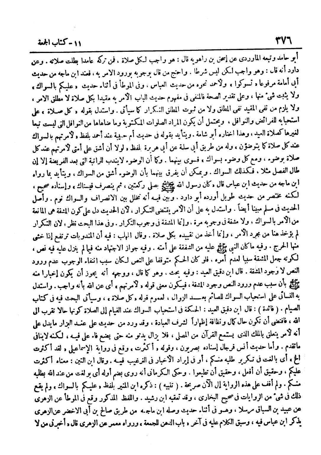 أَبُو حَامِدٍ وَتَبِعَهُ الْمَاوَرْدِيُّ عَنْ إِسْحَاقَ بْنِ رَاهْوَيْهِ قَالَ هُوَ وَاجِبٌ لِكُلِّ صَلَاةٍ فَمَنْ تَرَكَهُ عَامِدًا بَطَلَتْ صَلَاتُهُ وَعَنْ دَاوُدَ أَنَّهُ قَالَ وَهُوَ وَاجِبٌ لَكِنْ لَيْسَ شَرْطًا وَاحْتَجَّ مَنْ قَالَ بِوُجُوبِهِ بِوُرُودِ الْأَمْرِ بِهِ فَعِنْدَ بن مَاجَهْ مِنْ حَدِيثِ أَبِي أُمَامَةَ مَرْفُوعًا تَسَوَّكُوا وَلِأَحْمَدَ نَحْوُهُ مِنْ حَدِيثِ الْعَبَّاسِ وَفِي الْمُوَطَّأِ فِي أَثْنَاءِ حَدِيثِ عَلَيْكُمْ بِالسِّوَاكِ وَلَا يَثْبُتُ شَيْءٌ مِنْهَا وَعَلَى تَقْدِيرِ الصِّحَّةِ فَالْمَنْفِيُّ فِي مَفْهُومِ حَدِيثِ الْبَابِ الْأَمْرُ بِهِ مُقَيَّدًا بِكُلِّ صَلَاةٍ لَا مُطْلَقُ الْأَمْرِ وَلَا يَلْزَمُ مِنْ نَفْيِ الْمُقَيَّدِ نَفْيُ الْمُطْلَقِ وَلَا مِنْ ثُبُوتِ الْمُطْلَقِ التَّكْرَارُ كَمَا سَيَأْتِي وَاسْتُدِلَّ بِقَوْلِهِ كُلِّ صَلَاةٍ عَلَى اسْتِحْبَابِهِ لِلْفَرَائِضِ وَالنَّوَافِلِ وَيَحْتَمِلُ أَنْ يَكُونَ الْمُرَادُ الصَّلَوَاتِ الْمَكْتُوبَةَ وَمَا ضَاهَاهَا مِنَ النَّوَافِلِ الَّتِي لَيْسَتْ تَبَعًا لِغَيْرِهَا كَصَلَاةِ الْعِيدِ وَهَذَا اخْتَارَهُ أَبُو شَامَةَ وَيَتَأَيَّدُ بِقَوْلِهِ فِي حَدِيثِ أُمِّ حَبِيبَةَ عِنْدَ أَحْمَدَ بِلَفْظِ لَأَمَرْتُهُمْ بِالسِّوَاكِ عِنْد كل صَلَاة كَمَا يتوضؤون وَلَهُ مِنْ طَرِيقِ أَبِي سَلَمَةَ عَنْ أَبِي هُرَيْرَةَ بِلَفْظِ لَوْلَا أَنْ أَشُقَّ عَلَى أُمَّتِي لَأَمَرْتُهُمْ عِنْدَ كُلِّ صَلَاةٍ بِوُضُوءٍ وَمَعَ كُلِّ وُضُوءٍ بِسِوَاكٍ فَسَوَّى بَيْنَهُمَا وَكَمَا أَنَّ الْوُضُوءَ لَا يُنْدَبُ لِلرَّاتِبَةِ الَّتِي بَعْدَ الْفَرِيضَةِ إِلَّا إِنْ طَالَ الْفَصْلُ مَثَلًا فَكَذَلِكَ السِّوَاكُ وَيُمْكِنُ أَنْ يُفَرَّقَ بَيْنَهُمَا بِأَنَّ الْوُضُوءَ أَشَقُّ مِنَ السِّوَاك ويتأيد بِمَا رَوَاهُ بن ماجة من حَدِيث بن عَبَّاسٍ قَالَ كَانَ رَسُولُ اللَّهِ صَلَّى اللَّهُ عَلَيْهِ وَسَلَّمَ يُصَلِّي رَكْعَتَيْنِ ثُمَّ يَنْصَرِفُ فَيَسْتَاكُ وَإِسْنَادُهُ صَحِيحٌ لَكِنَّهُ مُخْتَصَرٌ مِنْ حَدِيثٍ طَوِيلٍ أَوْرَدَهُ أَبُو دَاوُدَ وَبَيَّنَ فِيهِ أَنَّهُ تَخَلَّلَ بَيْنَ الِانْصِرَافِ وَالسِّوَاكِ نَوْمٌ وَأَصْلُ الْحَدِيثِ فِي مُسْلِمٍ مُبَيَّنًا أَيْضًا وَاسْتُدِلَّ بِهِ عَلَى أَنَّ الْأَمْرَ يَقْتَضِي التَّكْرَارَ لِأَنَّ الْحَدِيثَ دَلَّ عَلَى كَوْنَ الْمَشَقَّةِ هِيَ الْمَانِعَةَ مِنَ الْأَمْرِ بِالسِّوَاكِ وَلَا مَشَقَّةَ فِي وُجُوبِهِ مَرَّةً وَإِنَّمَا الْمَشَقَّةُ فِي وُجُوبِ التَّكْرَارِ وَفِي هَذَا الْبَحْثِ نَظَرٌ لِأَنَّ التَّكْرَارَ لَمْ يُؤْخَذْ هُنَا مِنْ مُجَرَّدِ الْأَمْرِ وَإِنَّمَا أُخِذَ مِنْ تَقْيِيدِهِ بِكُلِّ صَلَاةٍ وَقَالَ الْمُهَلَّبُ فِيهِ أَنَّ الْمَنْدُوبَاتِ تَرْتَفِعُ إِذَا خُشِيَ مِنْهَا الْحَرَجُ وَفِيهِ مَا كَانَ النَّبِيُّ صَلَّى اللَّهُ عَلَيْهِ وَسَلَّمَ عَلَيْهِ مِنَ الشَّفَقَةِ عَلَى أُمَّتِهِ وَفِيهِ جَوَازُ الِاجْتِهَادِ مِنْهُ فِيمَا لَمْ يَنْزِلْ عَلَيْهِ فِيهِ نَصٌّ لِكَوْنِهِ جَعَلَ الْمَشَقَّةَ سَبَبًا لِعَدَمِ أَمْرِهِ فَلَوْ كَانَ الْحُكْمُ مُتَوَقِّفًا عَلَى النَّصِّ لَكَانَ سَبَبُ انْتِفَاءِ الْوُجُوبِ عَدَمَ وُرُودِ النَّصِّ لَا وُجُودَ الْمَشَقَّةِ قَالَ بن دَقِيقِ الْعِيدِ وَفِيهِ بَحْثٌ وَهُوَ كَمَا قَالَ وَوَجْهُهُ أَنَّهُ يَجُوزُ أَنْ يَكُونَ إِخْبَارًا مِنْهُ صَلَّى اللَّهُ عَلَيْهِ وَسَلَّمَ بِأَنَّ سَبَبَ عَدَمِ وُرُودِ النَّصِّ وُجُودُ الْمَشَقَّةِ فَيَكُونُ مَعْنَى قَوْلِهِ لَأَمَرْتُهُمْ أَيْ عَنِ اللَّهِ بِأَنَّهُ وَاجِبٌ وَاسْتَدَلَّ بِهِ النَّسَائِيُّ عَلَى اسْتِحْبَابِ السِّوَاكِ لِلصَّائِمِ 