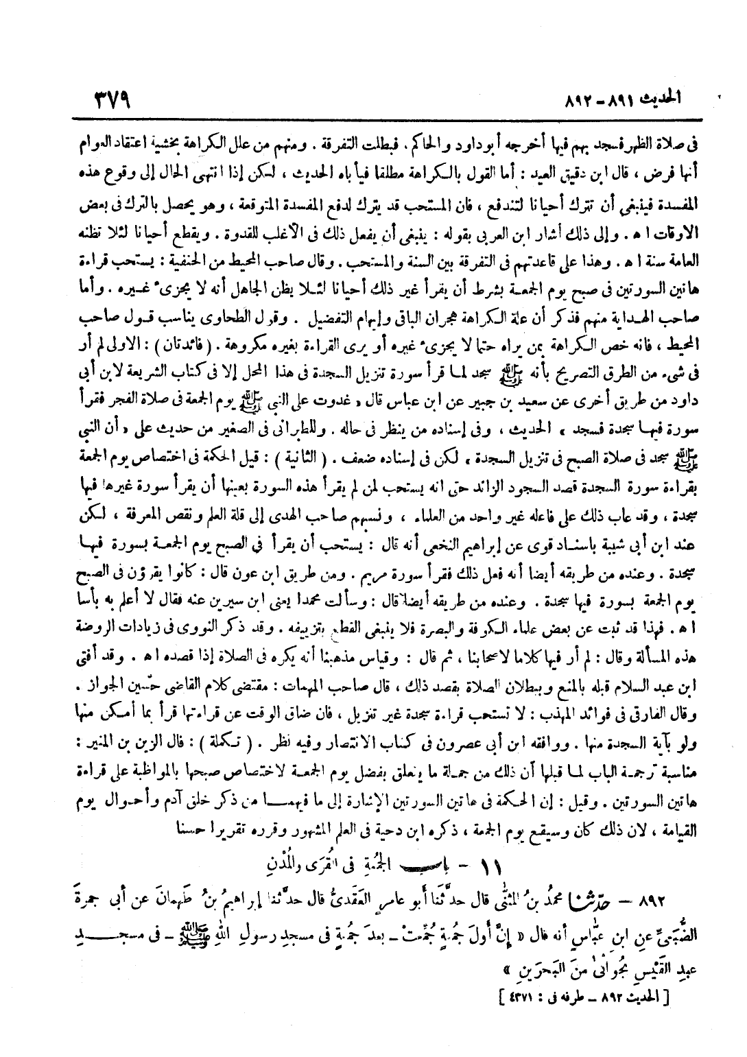 فِي صَلَاةِ الظُّهْرِ فَسَجَدَ بِهِمْ فِيهَا أَخْرَجَهُ أَبُو دَاوُدَ وَالْحَاكِمُ فَبَطَلَتِ التَّفْرِقَةُ وَمِنْهُمْ مَنْ عَلَّلَ الْكَرَاهَةَ بِخَشْيَةِ اعْتِقَادِ الْعَوَامِّ أَنَّهَا فَرْضٌ قَالَ بن دَقِيقِ الْعِيدِ أَمَّا الْقَوْلُ بِالْكَرَاهَةِ مُطْلَقًا فَيَأْبَاهُ الْحَدِيثُ لَكِنْ إِذَا انْتَهَى الْحَالُ إِلَى وُقُوعِ هَذِهِ الْمَفْسَدَةِ فَيَنْبَغِي أَنْ تُتْرَكَ أَحْيَانًا لِتَنْدَفِعَ فَإِنَّ الْمُسْتَحَبَّ قَدْ يُتْرَكُ لِدَفْعِ الْمَفْسَدَةِ الْمُتَوَقَّعَةِ وَهُوَ يَحْصُلُ بِالتَّرْكِ فِي بَعْضِ الْأَوْقَاتِ اه وَإِلَى ذَلِك أَشَارَ بن الْعَرَبِيِّ بِقَوْلِهِ يَنْبَغِي أَنْ يُفْعَلَ ذَلِكَ فِي الْأَغْلَب للقدوة وَيُقْطَعُ أَحْيَانًا لِئَلَّا تَظُنَّهُ الْعَامَّةُ سُنَّةً اه وَهَذَا عَلَى قَاعِدَتِهِمْ فِي التَّفْرِقَةِ بَيْنَ السُّنَّةِ وَالْمُسْتَحَبِّ وَقَالَ صَاحِبُ الْمُحِيطِ مِنَ الْحَنَفِيَّةِ يُسْتَحَبُّ قِرَاءَةُ هَاتَيْنِ السُّورَتَيْنِ فِي صُبْحِ يَوْمِ الْجُمُعَةِ بِشَرْطِ أَنْ يَقْرَأَ غَيْرَ ذَلِكَ أَحْيَانًا لِئَلَّا يَظُنَّ الْجَاهِلُ أَنَّهُ لَا يُجْزِئُ غَيْرُهُ وَأَمَّا صَاحِبُ الْهِدَايَةِ مِنْهُمْ فَذَكَرَ أَنَّ عِلَّةَ الْكَرَاهَةِ هِجْرَانُ الْبَاقِي وَإِيهَامُ التَّفْضِيلِ وَقَوْلُ الطَّحَاوِيِّ يُنَاسِبُ قَوْلَ صَاحِبِ الْمُحِيطِ فَإِنَّهُ خَصَّ الْكَرَاهَةَ بِمَنْ يَرَاهُ حَتْمًا لَا يُجْزِئُ غَيْرُهُ أَوْ يَرَى الْقِرَاءَةَ بِغَيْرِهِ مَكْرُوهَةً فَائِدَتَانِ الْأُولَى لَمْ أَرَ فِي شَيْءٍ مِنَ الطُّرُقِ التَّصْرِيحَ بِأَنَّهُ صَلَّى اللَّهُ عَلَيْهِ وَسَلَّمَ سَجَدَ لَمَّا قَرَأَ سُورَةَ تَنْزِيلٌ السَّجْدَةَ فِي هَذَا الْمَحَلِّ إِلَّا فِي كِتَابِ الشَّرِيعَةِ لِابْنِ أَبِي دَاوُدَ مِنْ طَرِيقٍ أُخْرَى عَنْ سَعِيدِ بْنِ جُبَيْرٍ عَن بن عَبَّاسٍ قَالَ غَدَوْتُ عَلَى النَّبِيِّ صَلَّى اللَّهُ عَلَيْهِ وَسَلَّمَ يَوْمَ الْجُمُعَةِ فِي صَلَاةِ الْفَجْرِ فَقَرَأَ سُورَةً فِيهَا سَجْدَةٌ فَسَجَدَ الْحَدِيثَ وَفِي إِسْنَادِهِ مَنْ يُنْظَرُ فِي حَالِهِ ولِلطَّبَرَانِيِّ فِي الصَّغِيرِ مِنْ حَدِيثِ عَلِيٍّ أَنَّ النَّبِيَّ صَلَّى اللَّهُ عَلَيْهِ وَسَلَّمَ سَجَدَ فِي صَلَاةِ الصُّبْحِ فِي تَنْزِيلٌ السَّجْدَةَ لَكِنْ فِي إِسْنَادِهِ ضَعْفٌ الثَّانِيَةُ قِيلَ الْحِكْمَةُ فِي اخْتِصَاصِ يَوْمِ الْجُمُعَةِ بِقِرَاءَةِ سُورَةِ السَّجْدَةِ قَصْدُ السُّجُودِ الزَّائِدِ حَتَّى أَنَّهُ يُسْتَحَبُّ لِمَنْ لَمْ يَقْرَأْ هَذِهِ السُّورَةَ بِعَيْنِهَا أَنْ يَقْرَأَ سُورَةً غَيْرَهَا فِيهَا سَجْدَةٌ وَقَدْ عَابَ ذَلِكَ عَلَى فَاعِلِهِ غَيْرُ وَاحِدٍ مِنَ الْعُلَمَاءِ وَنَسَبَهُمْ صَاحِبُ الْهَدْيِ إِلَى قِلَّةِ الْعلم وَنقص الْمعرفَة لَكِن عِنْد بن أَبِي شَيْبَةَ بِإِسْنَادٍ قَوِيٍّ عَنْ إِبْرَاهِيمَ النَّخَعِيِّ أَنَّهُ قَالَ يُسْتَحَبُّ أَنْ يَقْرَأَ فِي الصُّبْحِ يَوْمَ الْجُمُعَةِ بِسُورَةٍ فِيهَا سَجْدَةٌ وَعِنْدَهُ مِنْ طَرِيقِهِ أَيْضًا أَنَّهُ فَعَلَ ذَلِكَ فَقَرَأَ سُورَةَ مَرْيَم وَمن طَرِيق بن عون قَالَ كَانُوا يقرؤون فِي الصُّبْحِ يَوْمَ الْجُمُعَةِ بِسُورَةٍ فِيهَا سَجْدَةٌ وَعِنْدَهُ مِنْ طَرِيقِهِ أَيْضًا قَالَ وَسَأَلْتُ مُحَمَّدًا يَعْنِي بن سِيرِينَ عَنْهُ فَقَالَ لَا أَعْلَمُ بِهِ بَأْسًا اه فَهَذَا قَدْ ثَبَتَ عَنْ بَعْضِ عُلَمَاءِ الْكُوفَةِ وَالْبَصْرَةِ فَلَا يَنْبَغِي الْقَطْعُ بِتَزْيِيفِهِ وَقَدْ ذَكَرَ النَّوَوِيُّ فِي زِيَادَاتِ الرَّوْضَةِ هَذِهِ الْمَسْأَلَةَ وَقَالَ لَمْ أَرَ فِيهَا كَلَامًا لِأَصْحَابِنَا ثُمَّ قَالَ وَقِيَاسُ مَذْهَبِنَا أَنَّهُ يُكْرَهُ فِي الصَّلَاةِ إِذا 