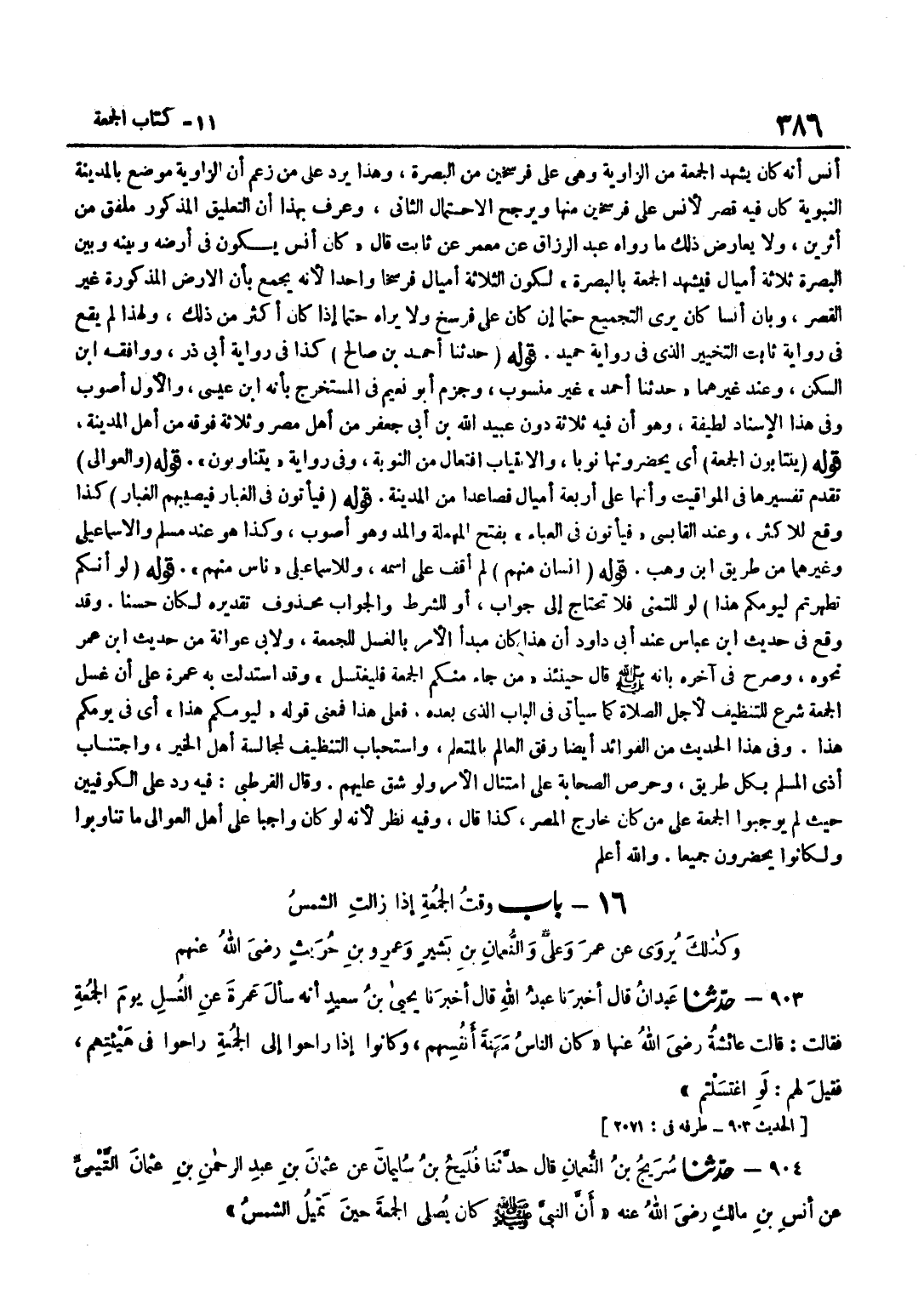 [902] قَوْلُهُ حَدَّثَنَا أَحْمَدُ بْنُ صَالِحٍ كَذَا فِي رِوَايَةِ أَبِي ذَرٍّ وَوَافَقَهُ بن السكن وَعند غَيْرِهِمَا حَدَّثَنَا أَحْمَدُ غَيْرُ مَنْسُوبٍ وَجَزَمَ أَبُو نُعَيْمٍ فِي الْمُسْتَخْرَجِ بِأَنَّهُ بن عِيسَى وَالْأَوَّلُ أَصْوَبُ وَفِي هَذَا الْإِسْنَادِ لَطِيفَةٌ وَهُوَ أَنَّ فِيهِ ثَلَاثَةً دُونَ عُبَيْدِ اللَّهِ بْنِ أَبِي جَعْفَرٍ مِنْ أَهْلِ مِصْرَ وَثَلَاثَةً فَوْقَهُ مِنْ أَهْلِ الْمَدِينَةِ قَوْلُهُ يَنْتَابُونَ الْجُمُعَةَ أَيْ يَحْضُرُونَهَا نَوْبًا وَالِانْتِيَابُ افْتِعَالٌ مِنَ النَّوْبَةِ وَفِي رِوَايَةٍ يَتَنَاوَبُونَ قَوْلُهُ وَالْعَوَالِيَ تَقَدَّمَ تَفْسِيرُهَا فِي الْمَوَاقِيتِ وَأَنَّهَا عَلَى أَرْبَعَةِ أَمْيَالٍ فَصَاعِدًا مِنَ الْمَدِينَةِ قَوْلُهُ فَيَأْتُونَ فِي الْغُبَارِ فَيُصِيبُهُمُ الْغُبَارُ كَذَا وَقَعَ لِلْأَكْثَرِ وَعِنْدَ الْقَابِسِيِّ فَيَأْتُونَ فِي الْعَبَاءِ بِفَتْحِ الْمُهْمَلَةِ وَالْمَدِّ وَهُوَ أَصْوَبُ وَكَذَا هُوَ عِنْدَ مُسْلِمٍ وَالْإِسْمَاعِيلِيِّ وَغَيْرِهِمَا مِنْ طَرِيق بن وهب قَوْله إِنْسَان مِنْهُم لم أَقف علىاسمه وَلِلْإِسْمَاعِيلِيِّ نَاسٌ مِنْهُمْ قَوْلُهُ لَوْ أَنَّكُمْ تَطَهَّرْتُمْ لِيَوْمِكُمْ هَذَا لَوْ لِلتَّمَنِّي فَلَا تَحْتَاجُ إِلَى جَوَابٍ أَوْ لِلشَّرْطِ وَالْجَوَابُ مَحْذُوفٌ تَقْدِيرُهُ لَكَانَ حسنا وَقد وَقع فِي حَدِيث بن عَبَّاسٍ عِنْدَ أَبِي دَاوُدَ أَنَّ هَذَا كَانَ مَبْدَأَ الْأَمْرِ بِالْغُسْلِ لِلْجُمُعَةِ وَلِأَبِي عَوَانَةَ مِنْ حَدِيث بن عُمَرَ نَحْوُهُ وَصَرَّحَ فِي آخِرِهِ بِأَنَّهُ صَلَّى اللَّهُ عَلَيْهِ وَسَلَّمَ قَالَ حِينَئِذٍ مَنْ جَاءَ مِنْكُمُ الْجُمُعَةَ فَلْيَغْتَسِلْ وَقَدِ اسْتَدَلَّتْ بِهِ عَمْرَةُ عَلَى أَنَّ غُسْلَ الْجُمُعَةِ شُرِعَ لِلتَّنْظِيفِ لِأَجْلِ الصَّلَاةِ كَمَا سَيَأْتِي فِي الْبَابِ الَّذِي بَعْدَهُ فَعَلَى هَذَا فَمَعْنَى قَوْلِهِ لِيَوْمِكُمْ هَذَا أَيْ فِي يَوْمِكُمْ هَذَا وَفِي هَذَا الْحَدِيثِ مِنَ الْفَوَائِدِ أَيْضًا رِفْقُ الْعَالِمِ بِالْمُتَعَلِّمِ وَاسْتِحْبَابُ التَّنْظِيفِ لِمُجَالَسَةِ أَهْلِ الْخَيْرِ وَاجْتِنَابُ أَذَى الْمُسْلِمِ بِكُلِّ طَرِيقٍ وَحِرْصُ الصَّحَابَةِ عَلَى امْتِثَالِ الْأَمْرِ وَلَوْ شَقَّ عَلَيْهِمْ وَقَالَ الْقُرْطُبِيُّ فِيهِ رَدٌّ عَلَى الْكُوفِيِّينَ حَيْثُ لَمْ يُوجِبُوا الْجُمُعَةَ عَلَى مَنْ كَانَ خَارِجَ الْمِصْرِ كَذَا قَالَ وَفِيهِ نَظَرٌ لِأَنَّهُ لَوْ كَانَ وَاجِبًا عَلَى أَهْلِ الْعَوَالِي مَا تَنَاوَبُوا وَلَكَانُوا يَحْضُرُونَ جَمِيعًا وَاللَّهُ أَعْلَمُ