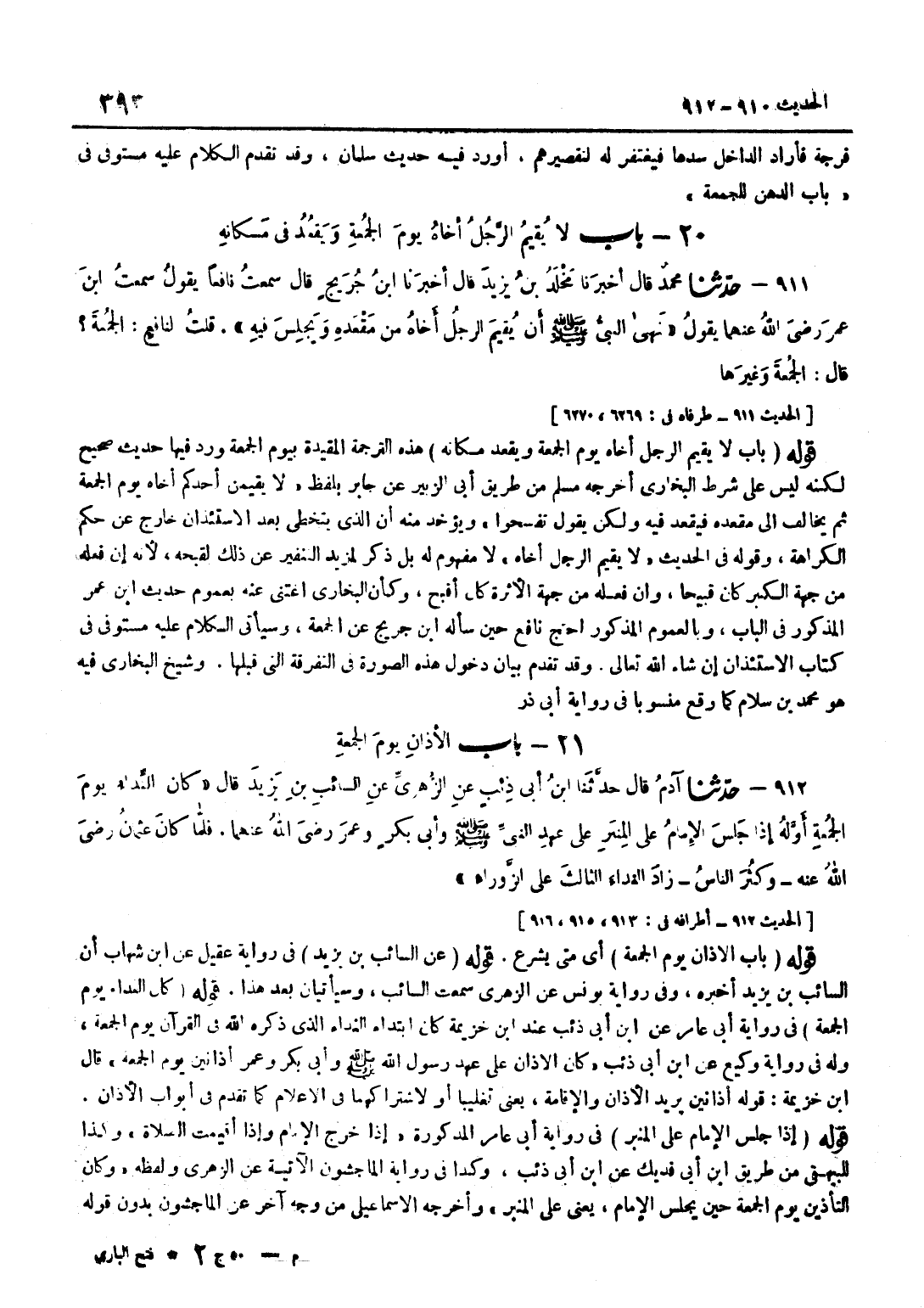 [912] قَوْلُهُ عَنِ السَّائِبِ بْنِ يَزِيدَ فِي رِوَايَة عقيل عَن بن شِهَابٍ أَنَّ السَّائِبَ بْنَ يَزِيدَ أَخْبَرَهُ وَفِي رِوَايَةِ يُونُسَ عَنِ الزُّهْرِيِّ سَمِعْتُ السَّائِبَ وَسَيَأْتِيَانِ بعد هَذَا قَوْله كَانَ كل النِّدَاءُ يَوْمَ الْجُمُعَةِ فِي رِوَايَةِ أَبِي عَامِرٍ عَن بن أبي ذِئْب عِنْد بن خُزَيْمَةَ كَانَ ابْتِدَاءُ النِّدَاءِ الَّذِي ذَكَرَهُ اللَّهُ فِي الْقُرْآنِ يَوْمَ الْجُمُعَةِ وَلَهُ فِي رِوَايَةِ وَكِيع عَن بن أَبِي ذِئْبٍ كَانَ الْأَذَانُ عَلَى عَهْدِ رَسُولِ اللَّهِ صَلَّى اللَّهُ عَلَيْهِ وَسَلَّمَ وَأَبِي بَكْرٍ وَعمر أذانين يَوْم الْجُمُعَة قَالَ بن خُزَيْمَةَ قَوْلُهُ أَذَانَيْنِ يُرِيدُ الْأَذَانَ وَالْإِقَامَةَ يَعْنِي تَغْلِيبًا أَوْ لِاشْتِرَاكِهِمَا فِي الْإِعْلَامِ كَمَا تَقَدَّمَ فِي أَبْوَابِ الْأَذَانِ قَوْلُهُ إِذَا جَلَسَ الْإِمَامُ عَلَى الْمِنْبَرِ فِي رِوَايَةِ أَبِي عَامِرٍ الْمَذْكُورَةِ إِذَا خَرَجَ الْإِمَامُ وَإِذَا أُقِيمَتِ الصَّلَاةُ وَكَذَا للبيهقي من طَرِيق بن أبي فديك عَن بن أَبِي ذِئْبٍ وَكَذَا فِي رِوَايَةِ الْمَاجِشُونِ الْآتِيَةِ عَنِ الزُّهْرِيِّ وَلَفْظُهُ وَكَانَ التَّأْذِينُ يَوْمَ الْجُمُعَةِ حِينَ يَجْلِسُ الْإِمَامُ يَعْنِي عَلَى الْمِنْبَرِ وَأَخْرَجَهُ الْإِسْمَاعِيلِيُّ مِنْ وَجْهٍ آخَرَ عَنِ الْمَاجِشُونِ بِدُونِ قَوْله
