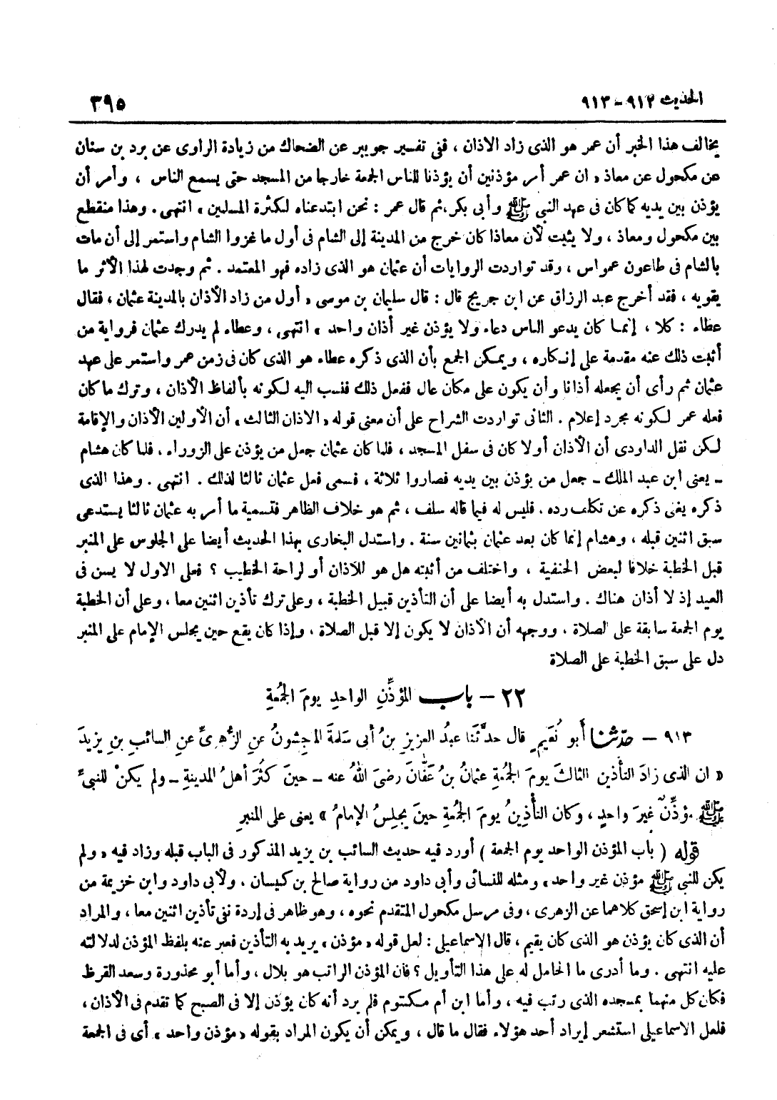 [913] قَوْلَهُ مُؤَذِّنٌ يُرِيدُ بِهِ التَّأْذِينَ فَعَبَّرَ عَنْهُ بِلَفْظِ الْمُؤَذِّنِ لِدَلَالَتِهِ عَلَيْهِ انْتَهَى وَمَا أَدْرَى مَا الْحَامِلُ لَهُ عَلَى هَذَا التَّأْوِيلِ فَإِنَّ الْمُؤَذِّنَ الرَّاتِبَ هُوَ بِلَالٌ وَأَمَّا أَبُو مَحْذُورَةَ وَسَعْدٌ الْقَرَظُ فَكَانَ كُلٌّ مِنْهُمَا بِمَسْجِدِهِ الَّذِي رتب فِيهِ وَأما بن أُمِّ مَكْتُومٍ فَلَمْ يَرِدْ أَنَّهُ كَانَ يُؤَذِّنُ إِلَّا فِي الصُّبْحِ كَمَا تَقَدَّمَ فِي الْأَذَانِ فَلَعَلَّ الْإِسْمَاعِيلِيَّ اسْتَشْعَرَ إِيرَادَ أَحَدِ هَؤُلَاءِ فَقَالَ مَا قَالَ وَيُمْكِنُ أَنْ يَكُونَ الْمُرَادُ بِقَوْلِهِ مُؤَذِّنٌ وَاحِدٌ أَيْ فِي الْجُمُعَةِ فَلَا تَرِدُ الصُّبْحَ مَثَلًا وَعُرِفَ بِهَذَا الرَّدِّ عَلَى مَا ذكر بن حَبِيبٍ أَنَّهُ صَلَّى اللَّهُ عَلَيْهِ وَسَلَّمَ كَانَ إِذَا رَقِيَ الْمِنْبَرَ وَجَلَسَ أَذَّنَ الْمُؤَذِّنُونَ وَكَانُوا ثَلَاثَةً وَاحِدٌ بَعْدَ وَاحِدٌ فَإِذَا فَرَغَ الثَّالِثُ قَامَ فَخَطَبَ فَإِنَّهُ دَعْوَى تَحْتَاجُ لِدَلِيلٍ وَلَمْ يَرِدْ ذَلِكَ صَرِيحًا مِنْ طَرِيقٍ مُتَّصِلَةٍ يُثْبِتُ مِثْلَهَا ثُمَّ وَجَدْتُهُ فِي مُخْتَصَرِ الْبُوَيْطِيِّ عَنِ الشَّافِعِي
