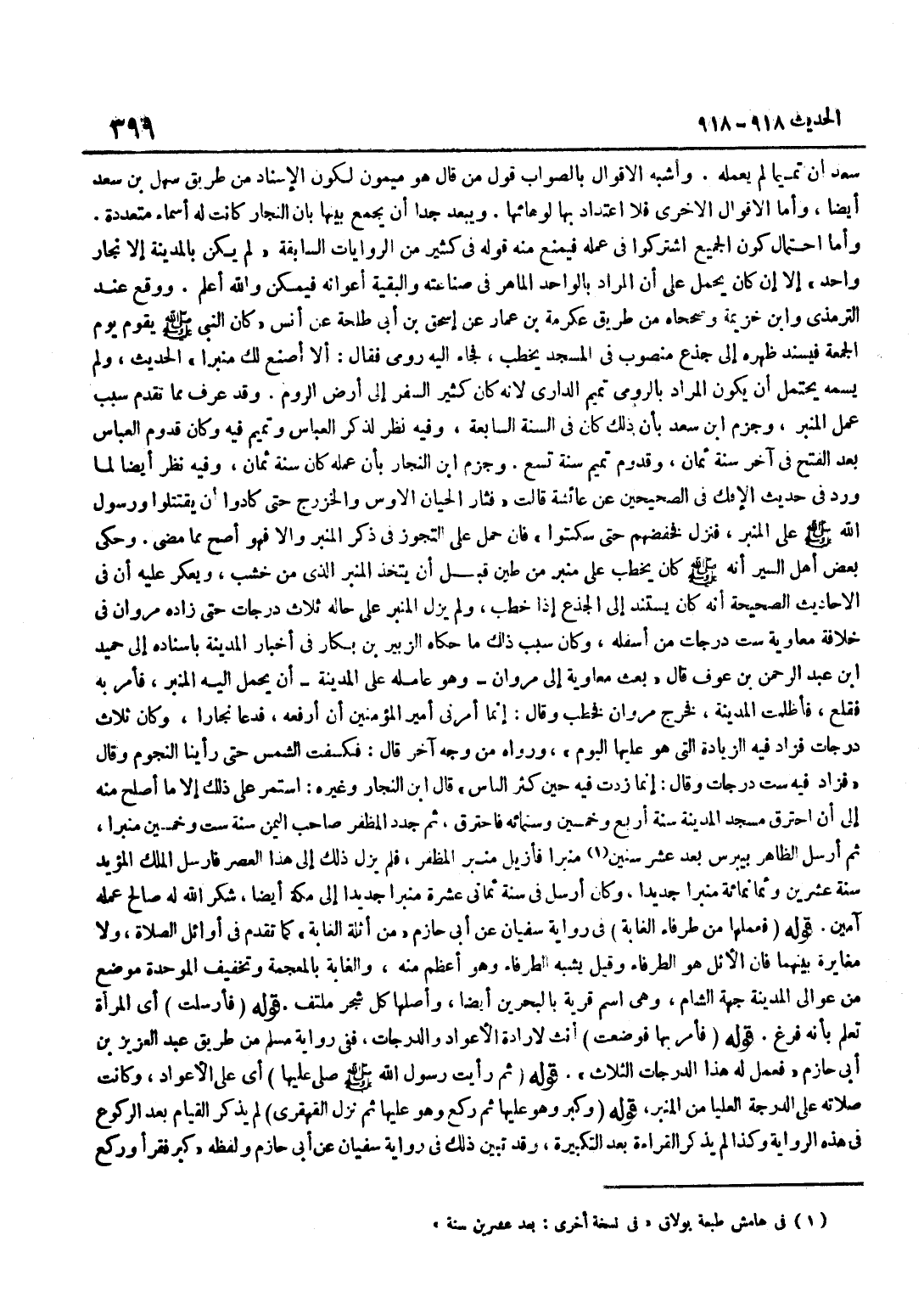 سَعْدٍ أَنَّ تَمِيمًا لَمْ يَعْمَلْهُ وَأَشْبَهُ الْأَقْوَالِ بِالصَّوَابِ قَوْلُ مَنْ قَالَ هُوَ مَيْمُونٌ لِكَوْنِ الْإِسْنَادِ مِنْ طَرِيقِ سَهْلِ بْنِ سَعْدٍ أَيْضًا وَأَمَّا الْأَقْوَالُ الْأُخْرَى فَلَا اعْتِدَادَ بِهَا لِوَهَائِهَا وَيَبْعُدُ جِدًّا أَنْ يُجْمَعَ بَيْنهَا بِأَنَّ النَّجَّارَ كَانَتْ لَهُ أَسْمَاءٌ مُتَعَدِّدَةٌ وَأَمَّا احْتِمَالُ كَوْنِ الْجَمِيعِ اشْتَرَكُوا فِي عَمَلِهِ فَيَمْنَعُ مِنْهُ قَوْلَهُ فِي كَثِيرٍ مِنَ الرِّوَايَاتِ السَّابِقَةِ لَمْ يَكُنْ بِالْمَدِينَةِ إِلَّا نَجَّارٌ وَاحِدٌ إِلَّا إِنْ كَانَ يُحْمَلُ عَلَى أَنَّ الْمُرَادَ بِالْوَاحِدِ الْمَاهِرُ فِي صِنَاعَتِهِ وَالْبَقِيَّةُ أَعْوَانُهُ فَيُمْكِنُ وَاللَّهُ أَعْلَمُ وَوَقَعَ عِنْد التِّرْمِذِيّ وبن خُزَيْمَةَ وَصَحَّحَاهُ مِنْ طَرِيقِ عِكْرِمَةَ بْنِ عَمَّارٍ عَنْ إِسْحَاقَ بْنِ أَبِي طَلْحَةَ عَنْ أَنَسٍ كَانَ النَّبِيُّ صَلَّى اللَّهُ عَلَيْهِ وَسَلَّمَ يَقُومُ يَوْمَ الْجُمُعَةِ فَيُسْنِدُ ظَهْرُهُ إِلَى جِذْعٍ مَنْصُوبٍ فِي الْمَسْجِدِ يَخْطُبُ فَجَاءَ إِلَيْهِ رُومِيٌّ فَقَالَ أَلَا أَصْنَعُ لَكَ مِنْبَرًا الْحَدِيثَ وَلَمْ يُسَمِّهِ يَحْتَمِلُ أَنْ يَكُونَ الْمُرَادَ بِالرُّومِيِّ تَمِيمٌ الدَّارِيُّ لِأَنَّهُ كَانَ كَثِيرَ السَّفَرِ إِلَى أَرْضِ الرُّومِ وَقَدْ عُرِفَ مِمَّا تَقَدَّمَ سَبَبُ عَمَلِ الْمِنْبَرِ وَجزم بن سَعْدٍ بِأَنَّ ذَلِكَ كَانَ فِي السَّنَةِ السَّابِعَةِ وَفِيهِ نَظَرٌ لِذِكْرِ الْعَبَّاسِ وَتَمِيمٍ فِيهِ وَكَانَ قُدُومُ الْعَبَّاسِ بَعْدَ الْفَتْحِ فِي آخِرِ سَنَةِ ثَمَان وقدوم تَمِيم سنة تسع وَجزم بن النَّجَّارِ بِأَنَّ عَمَلَهُ كَانَ سَنَةَ ثَمَانٍ وَفِيهِ نَظَرٌ أَيْضًا لِمَا وَرَدَ فِي حَدِيثِ الْإِفْكِ فِي الصَّحِيحَيْنِ عَنْ عَائِشَةَ قَالَتْ فَثَارَ الْحَيَّانِ الْأَوْسُ وَالْخَزْرَجُ حَتَّى كَادُوا أَنْ يَقْتَتِلُوا وَرَسُولُ اللَّهِ صَلَّى اللَّهُ عَلَيْهِ وَسَلَّمَ عَلَى الْمِنْبَرِ فَنَزَلَ فَخَفَّضَهُمْ حَتَّى سَكَتُوا فَإِنْ حُمِلَ عَلَى التَّجَوُّزِ فِي ذِكْرِ الْمِنْبَرِ وَإِلَّا فَهُوَ أَصَحُّ مِمَّا مَضَى وَحَكَى بَعْضُ أَهْلِ السِّيَرِ أَنَّهُ صَلَّى اللَّهُ عَلَيْهِ وَسَلَّمَ كَانَ يَخْطُبُ عَلَى مِنْبَرٍ مِنْ طِينٍ قَبْلَ أَنْ يَتَّخِذَ الْمِنْبَرَ الَّذِي مِنْ خَشَبٍ وَيُعَكِّرُ عَلَيْهِ أَنَّ فِي الْأَحَادِيثِ الصَّحِيحَةِ أَنَّهُ كَانَ يَسْتَنِدُ إِلَى الْجِذْعِ إِذَا خَطَبَ وَلَمْ يَزَلِ الْمِنْبَرُ عَلَى حَالِهِ ثَلَاثَ دَرَجَاتٍ حَتَّى زَادَهُ مَرْوَانُ فِي خِلَافَةِ مُعَاوِيَةَ سِتَّ دَرَجَاتٍ مِنْ أَسْفَلِهِ وَكَانَ سَبَبُ ذَلِكَ مَا حَكَاهُ الزُّبَيْرُ بْنُ بَكَّارٍ فِي أَخْبَارِ الْمَدِينَةِ بِإِسْنَادِهِ إِلَى حُمَيْدِ بْنِ عَبْدِ الرَّحْمَنِ بْنِ عَوْفٍ قَالَ بَعَثَ مُعَاوِيَةُ إِلَى مَرْوَانَ وَهُوَ عَامِلُهُ عَلَى الْمَدِينَةِ أَنْ يَحْمِلَ إِلَيْهِ الْمِنْبَرَ فَأَمَرَ بِهِ فَقُلِعَ فَأَظْلَمَتِ الْمَدِينَةُ فَخَرَجَ مَرْوَانُ فَخَطَبَ وَقَالَ إِنَّمَا أَمَرَنِي أَمِيرُ الْمُؤْمِنِينَ أَنْ أَرْفَعَهُ فَدَعَا نَجَّارًا وَكَانَ ثَلَاثَ دَرَجَات فَزَاد فِيهِ الزِّيَادَة الَّتِي هُوَ عَلَيْهَا الْيَوْمَ وَرَوَاهُ مِنْ وَجْهٍ آخَرَ قَالَ فَكَسَفَتِ الشَّمْسُ حَتَّى رَأَيْنَا النُّجُومَ وَقَالَ فَزَادَ فِيهِ سِتَّ دَرَجَاتٍ وَقَالَ إِنَّمَا زِدْتُ فِيهِ حِين كثر النَّاس قَالَ بن النَّجَّارِ وَغَيْرُهُ اسْتَمَرَّ عَلَى ذَلِكَ إِلَّا مَا أُصْلِحَ مِنْهُ إِلَى أَنِ احْتَرَقَ مَسْجِدُ الْمَدِينَةِ سَنَةَ أَرْبَعٍ وَخَمْسِينَ وَسِتِّمِائَةٍ فَاحْتَرَقَ ثُمَّ جَدَّدَ الْمُظَفَّرُ صَاحِبُ ال