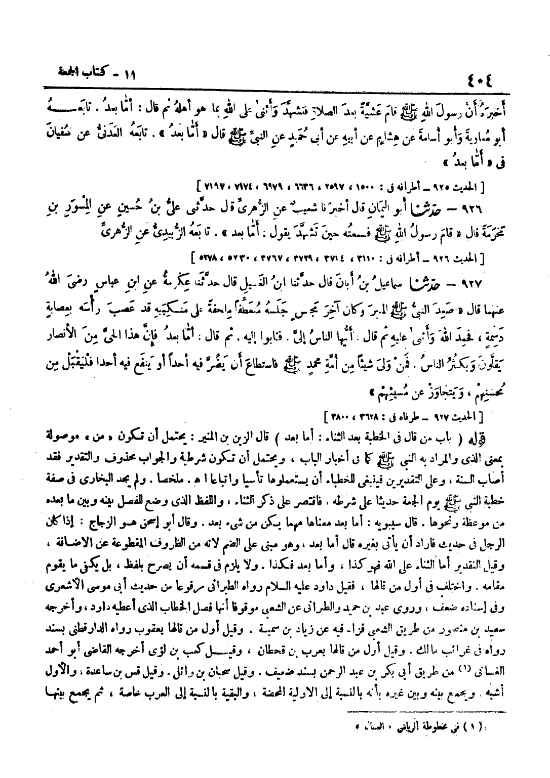 قَالَ الزَّيْنُ بْنُ الْمُنِيرِ يَحْتَمِلُ أَنْ تَكُونَ مَنْ مَوْصُولَةً بِمَعْنَى الَّذِي وَالْمُرَادُ بِهِ النَّبِيُّ صَلَّى اللَّهُ عَلَيْهِ وَسَلَّمَ كَمَا فِي أَخْبَارِ الْبَابِ وَيَحْتَمِلُ أَنْ تَكُونَ شَرْطِيَّةً وَالْجَوَابُ مَحْذُوفٌ وَالتَّقْدِيرُ فَقَدْ أَصَابَ السُّنَّةَ وَعَلَى التَّقْدِيرَيْنِ فَيَنْبَغِي لِلْخُطَبَاءِ أَنْ يَسْتَعْمِلُوهَا تَأَسِّيًا وَاتِّبَاعًا اه مُلَخَّصًا وَلَمْ يَجِدِ الْبُخَارِيُّ فِي صِفَةِ خُطْبَةِ النَّبِيِّ صَلَّى اللَّهُ عَلَيْهِ وَسَلَّمَ يَوْمَ الْجُمُعَةِ حَدِيثًا عَلَى شَرْطِهِ فَاقْتَصَرَ عَلَى ذِكْرِ الثَّنَاءِ وَاللَّفْظُ الَّذِي وُضِعَ لِلْفَصْلِ بَيْنَهُ وَبَيْنَ مَا بَعْدَهُ مِنْ مَوْعِظَةٍ وَنَحْوِهَا قَالَ سِيبَوَيْهِ أَمَّا بَعْدُ مَعْنَاهَا مَهْمَا يَكُنْ مِنْ شَيْءٍ بَعْدُ وَقَالَ أَبُو إِسْحَاقَ هُوَ الزَّجَّاجُ إِذَا كَانَ الرَّجُلُ فِي حَدِيثٍ فَأَرَادَ أَنْ يَأْتِيَ بِغَيْرِهِ قَالَ أَمَّا بَعْدُ وَهُوَ مَبْنِيٌّ عَلَى الضَّمِّ لِأَنَّهُ مِنَ الظُّرُوفِ الْمَقْطُوعَةِ عَنِ الْإِضَافَةِ وَقِيلَ التَّقْدِيرُ أَمَّا الثَّنَاءُ عَلَى اللَّهِ فَهُوَ كَذَا وَأَمَّا بَعْدُ فَكَذَا وَلَا يَلْزَمُ فِي قَسْمِهِ أَنْ يُصَرِّحَ بِلَفْظٍ بَلْ يَكْفِي مَا يَقُومُ مَقَامَهُ وَاخْتُلِفَ فِي أَوَّلِ مَنْ قَالَهَا فَقِيلَ دَاوُدُ عَلَيْهِ السَّلَامُ رَوَاهُ الطَّبَرَانِيُّ مَرْفُوعًا مِنْ حَدِيثِ أَبِي مُوسَى الْأَشْعَرِيِّ وَفِي إِسْنَادِهِ ضَعْفٌ وَرَوَى عَبْدُ بْنُ حُمَيْدٍ وَالطَّبَرَانِيُّ عَنِ الشَّعْبِيِّ مَوْقُوفًا أَنَّهَا فَصْلُ الْخِطَابِ الَّذِي أُعْطِيهِ دَاوُدُ وَأَخْرَجَهُ سَعِيدُ بْنُ مَنْصُورٍ مِنْ طَرِيقِ الشَّعْبِيِّ فَزَادَ فِيهِ عَنْ زِيَادِ بْنِ سُمَيَّةَ وَقِيلَ أَوَّلُ مَنْ قَالَهَا يَعْقُوبُ رَوَاهُ الدَّارَقُطْنِيُّ بِسَنَدٍ رَوَاهُ فِي غَرَائِبِ مَالِكٍ وَقِيلَ أَوَّلُ مَنْ قَالَهَا يَعْرُبُ بْنُ قَحْطَانَ وَقِيلَ كَعْبُ بْنُ لُؤَيٍّ أَخْرَجَهُ الْقَاضِي أَبُو أَحْمَدَ الْغَسَّانِيُّ مِنْ طَرِيقِ أَبِي بَكْرِ بْنِ عَبْدِ الرَّحْمَنِ بِسَنَدٍ ضَعِيفٍ وَقِيلَ سَحْبَانُ بْنُ وَائِلٍ وَقِيلَ قُسُّ بْنُ سَاعِدَةَ وَالْأَوَّلُ أَشْبَهُ وَيُجْمَعُ بَيْنَهُ وَبَيْنَ غَيْرِهِ بِأَنَّهُ بِالنِّسْبَةِ إِلَى الْأَوَّلِيَّةِ الْمَحْضَةِ وَالْبَقِيَّةُ بِالنِّسْبَةِ إِلَى الْعَرَبِ خَاصَّةً ثُمَّ يجمع بَينهَا