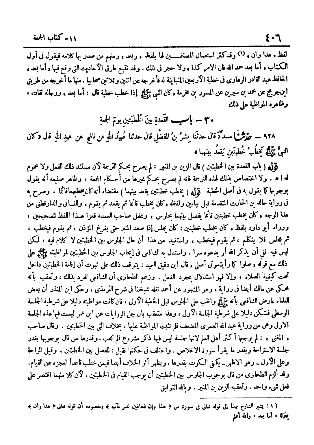 [928] قَوْلُهُ يَخْطُبُ خُطْبَتَيْنِ يَقْعُدُ بَينهمَا مُقْتَضَاهُ أَنه كَانَ يخطبها قَائِمًا وَصَرَّحَ بِهِ فِي رِوَايَةِ خَالِدِ بْنِ الْحَارِثِ الْمُتَقَدِّمَةِ قَبْلُ بِبَابَيْنِ وَلَفْظُهُ كَانَ يَخْطُبُ قَائِمًا ثُمَّ يَقْعُدُ ثُمَّ يَقُومُ وَلِلنَّسَائِيِّ وَالدَّارَقُطْنِيِّ مِنْ هَذَا الْوَجْهِ كَانَ يَخْطُبُ خُطْبَتَيْنِ قَائِمًا يَفْصِلُ بَيْنَهُمَا بِجُلُوسٍ وَغَفَلَ صَاحِبُ الْعُمْدَةِ فَعَزَا هَذَا اللَّفْظَ لِلصَّحِيحَيْنِ وَرَوَاهُ أَبُو دَاوُدَ بِلَفْظِ كَانَ يَخْطُبُ خُطْبَتَيْنِ كَانَ يَجْلِسُ إِذَا صَعِدَ الْمِنْبَرَ حَتَّى يَفْرُغَ الْمُؤَذِّنُ ثُمَّ يَقُومُ فَيَخْطُبُ ثُمَّ يَجْلِسُ فَلَا يَتَكَلَّمُ ثُمَّ يَقُومُ فَيَخْطُبُ وَاسْتُفِيدَ مِنْ هَذَا أَنَّ حَالَ الْجُلُوسِ بَيْنَ الْخُطْبَتَيْنِ لَا كَلَامَ فِيهِ لَكِنْ لَيْسَ فِيهِ نَفْيُ أَنْ يَذْكُرَ اللَّهَ أَوْ يَدْعُوَهُ سِرًّا وَاسْتَدَلَّ بِهِ الشَّافِعِيُّ فِي إِيجَابِ الْجُلُوسِ بَيْنَ الْخُطْبَتَيْنِ لِمُوَاظَبَتِهِ صَلَّى اللَّهُ عَلَيْهِ وَسَلَّمَ عَلَى ذَلِكَ مَعَ قَوْلِهِ صَلُّوا كَمَا رَأَيْتُمُونِي أُصَلِّي قَالَ بن دَقِيقِ الْعِيدِ يَتَوَقَّفُ ذَلِكَ عَلَى ثُبُوتِ أَنَّ إِقَامَةَ الْخُطْبَتَيْنِ دَاخِلٌ تَحْتَ كَيْفِيَّةِ الصَّلَاةِ وَإِلَّا فَهُوَ اسْتِدْلَالٌ بِمُجَرَّدِ الْفِعْلِ وَزَعَمَ الطَّحَاوِيُّ أَنَّ الشَّافِعِيَّ تَفَرَّدَ بِذَلِكَ وَتُعُقِّبَ بِأَنَّهُ مَحْكِيٌّ عَنْ مَالِكٍ أَيْضًا فِي رِوَايَةٍ وَهُوَ الْمَشْهُورُ عَنْ أَحْمَدَ نَقَلَهُ شَيْخُنَا فِي شَرْحِ التِّرْمِذِيِّ وَحَكَى بن الْمُنْذِرِ أَنَّ بَعْضَ الْعُلَمَاءِ عَارَضَ الشَّافِعِيَّ بِأَنَّهُ صَلَّى اللَّهُ عَلَيْهِ وَسَلَّمَ وَاظَبَ عَلَى الْجُلُوسِ قَبْلَ الْخُطْبَةِ الْأُولَى فَإِنْ كَانَتْ مُوَاظَبَتُهُ دَلِيلًا عَلَى شَرْطِيَّةِ الْجِلْسَةِ الْوُسْطَى فَلْتَكُنْ دَلِيلًا عَلَى شَرْطِيَّةِ الْجِلْسَةِ الْأُولَى وَهَذَا مُتَعَقَّبٌ بِأَنَّ جُلَّ الرِّوَايَات عَن بن عُمَرَ لَيْسَتْ فِيهَا هَذِهِ الْجِلْسَةُ الْأُولَى وَهِيَ مِنْ رِوَايَةِ عَبْدِ اللَّهِ الْعُمَرِيِّ الْمُضَعَّفِ فَلَمْ تَثْبُتِ الْمُوَاظَبَةُ عَلَيْهَا بِخِلَافِ الَّتِي بَيْنَ الْخُطْبَتَيْنِ وَقَالَ صَاحِبُ الْمُغْنِي لَمْ يُوجِبْهَا أَكْثَرُ أَهْلِ الْعِلْمِ لِأَنَّهَا جِلْسَةٌ لَيْسَ فِيهَا ذِكْرٌ مَشْرُوعٌ فَلَمْ تَجِبْ وَقَدَّرَهَا مَنْ قَالَ بِوُجُوبِهَا بِقَدْرِ جِلْسَةِ الِاسْتِرَاحَةِ وَبِقَدْرِ مَا يَقْرَأُ سُورَةَ الْإِخْلَاصِ وَاخْتُلِفَ فِي حِكْمَتِهَا فَقِيلَ لِلْفَصْلِ بَيْنَ الْخُطْبَتَيْنِ وَقِيلَ لِلرَّاحَةِ وَعَلَى الْأَوَّلِ وَهُوَ الْأَظْهَرُ يَكْفِي السُّكُوتُ بِقَدْرِهَا وَيَظْهَرُ أَثَرُ الْخِلَافِ أَيْضًا فِيمَنْ خَطَبَ قَاعِدًا لِعَجْزِهِ عَنِ الْقِيَامِ وَقَدْ أَلْزَمَ الطَّحَاوِيُّ مَنْ قَالَ بِوُجُوبِ الْجُلُوسِ بَيْنَ الْخُطْبَتَيْنِ أَنْ يُوجِبَ الْقِيَامَ فِي الْخُطْبَتَيْنِ لِأَنَّ كُلًّا مِنْهُمَا اقْتَصَرَ عَلَى فِعْلِ شَيْءٍ وَاحِدٍ وَتَعَقَّبَهُ الزين بن الْمُنِير وَبِاللَّهِ التَّوْفِيق