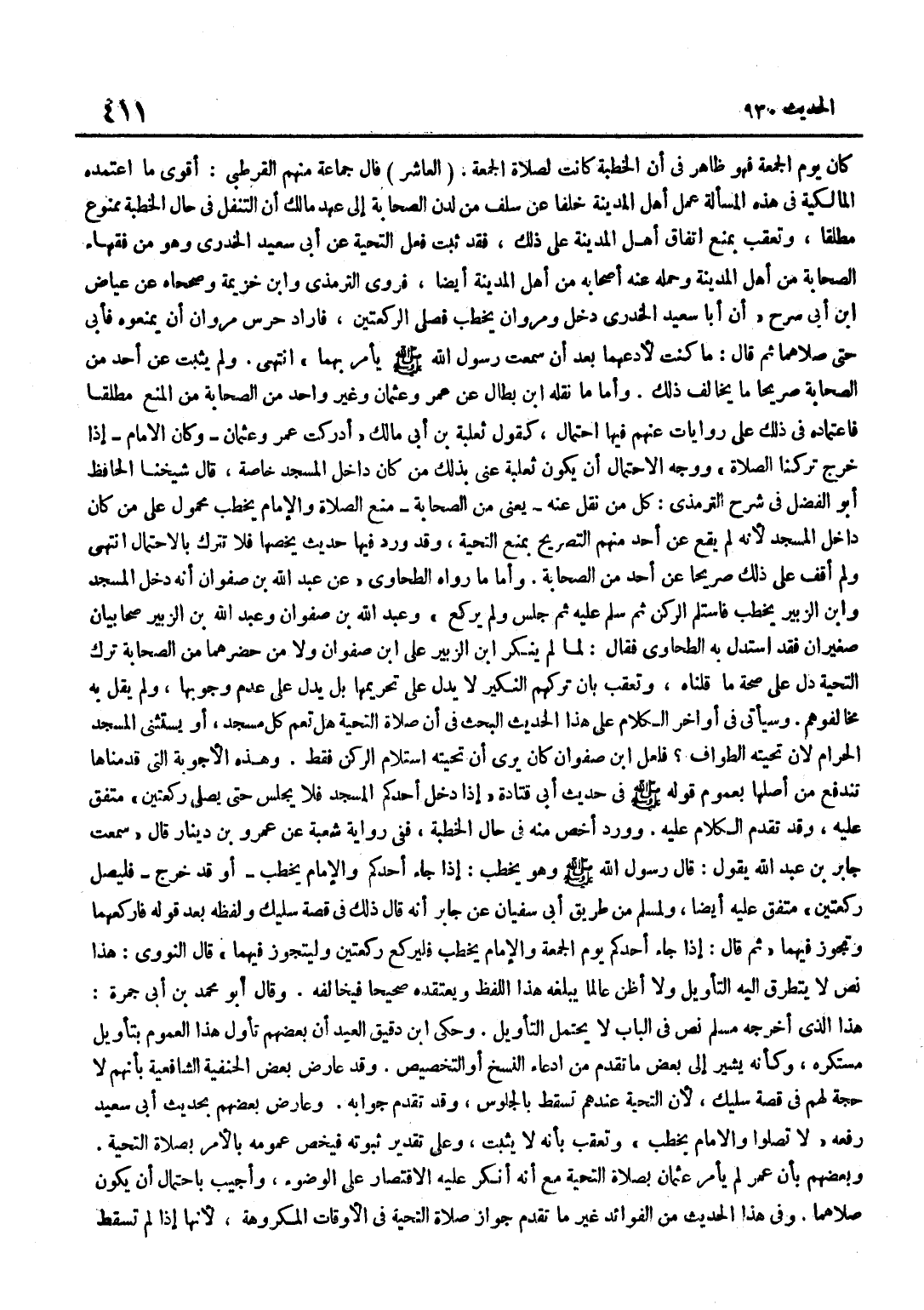 كَانَ يَوْمَ الْجُمُعَةِ فَهُوَ ظَاهِرٌ فِي أَنَّ الْخُطْبَةَ كَانَتْ لِصَلَاةِ الْجُمُعَةِ الْعَاشِرُ قَالَ جَمَاعَةٌ مِنْهُمْ الْقُرْطُبِيُّ أَقْوَى مَا اعْتَمَدَهُ الْمَالِكِيَّةُ فِي هَذِهِ الْمَسْأَلَةِ عَمَلُ أَهْلِ الْمَدِينَةِ خَلَفًا عَنْ سَلَفٍ مِنْ لَدُنْ الصَّحَابَةِ إِلَى عَهْدِ مَالِكٍ أَنَّ التَّنَفُّلَ فِي حَالِ الْخُطْبَةِ مَمْنُوعٌ مُطْلَقًا وَتُعُقِّبَ بِمَنْعِ اتِّفَاقِ أَهْلِ الْمَدِينَةِ عَلَى ذَلِكَ فَقَدْ ثَبَتَ فِعْلُ التَّحِيَّةِ عَنْ أَبِي سَعِيدٍ الْخُدْرِيِّ وَهُوَ مِنْ فُقَهَاءِ الصَّحَابَةِ مِنْ أَهْلِ الْمَدِينَةِ وَحَمَلَهُ عَنْهُ أَصْحَابُهُ مِنْ أَهْلِ الْمَدِينَةِ أَيْضا فروى التِّرْمِذِيّ وبن خُزَيْمَةَ وَصَحَّحَاهُ عَنْ عِيَاضِ بْنِ أَبِي سَرْحٍ أَنَّ أَبَا سَعِيدٍ الْخُدْرِيَّ دَخَلَ وَمَرْوَانُ يَخْطُبُ فَصَلَّى الرَّكْعَتَيْنِ فَأَرَادَ حَرَسُ مَرْوَانَ أَنْ يَمْنَعُوهُ فَأَبَى حَتَّى صَلَّاهُمَا ثُمَّ قَالَ مَا كُنْتُ لِأَدَعَهُمَا بَعْدَ أَنْ سَمِعْتُ رَسُولَ اللَّهِ صَلَّى اللَّهُ عَلَيْهِ وَسَلَّمَ يَأْمُرُ بِهِمَا انْتَهَى وَلَمْ يَثْبُتْ عَنْ أَحَدٍ مِنَ الصَّحَابَةِ صَرِيحًا مَا يُخَالف ذَلِك وَأما مَا نَقله بن بَطَّالٍ عَنْ عُمَرَ وَعُثْمَانَ وَغَيْرِ وَاحِدٍ مِنَ الصَّحَابَةِ مِنَ الْمَنْعِ مُطْلَقًا فَاعْتِمَادُهُ فِي ذَلِكَ عَلَى رِوَايَاتٍ عَنْهُمْ فِيهَا احْتِمَالٌ كَقَوْلِ ثَعْلَبَةَ بْنِ أَبِي مَالِكٍ أَدْرَكْتُ عُمَرَ وَعُثْمَانَ وَكَانَ الْإِمَامُ إِذَا خَرَجَ تَرَكْنَا الصَّلَاةَ وَوَجْهُ الِاحْتِمَالِ أَنْ يَكُونَ ثَعْلَبَةُ عَنَى بِذَلِكَ مَنْ كَانَ دَاخِلَ الْمَسْجِدِ خَاصَّةً قَالَ شَيْخُنَا الْحَافِظُ أَبُو الْفَضْلِ فِي شَرْحِ التِّرْمِذِيِّ كُلُّ مَنْ نُقِلَ عَنْهُ يَعْنِي مِنَ الصَّحَابَةِ مَنْعُ الصَّلَاةِ وَالْإِمَامُ يَخْطُبُ مَحْمُولٌ عَلَى مَنْ كَانَ دَاخِلَ الْمَسْجِدِ لِأَنَّهُ لَمْ يَقَعْ عَنْ أَحَدٍ مِنْهُمُ التَّصْرِيحُ بِمَنْعِ التَّحِيَّةِ وَقَدْ وَرَدَ فِيهَا حَدِيثٌ يَخُصُّهَا فَلَا تُتْرَكُ بِالِاحْتِمَالِ انْتَهَى وَلَمْ أَقِفْ عَلَى ذَلِكَ صَرِيحًا عَنْ أَحَدٍ مِنَ الصَّحَابَةِ وَأَمَّا مَا رَوَاهُ الطَّحَاوِيُّ عَنْ عَبْدِ اللَّهِ بْنِ صَفْوَان أَنه دخل الْمَسْجِد وبن الزُّبَيْرِ يَخْطُبُ فَاسْتَلَمَ الرُّكْنَ ثُمَّ سَلَّمَ عَلَيْهِ ثُمَّ جَلَسَ وَلَمْ يَرْكَعْ وَعَبْدُ اللَّهِ بْنُ صَفْوَانَ وَعَبْدُ اللَّهِ بْنُ الزُّبَيْرَ صَحَابِيَّانِ صَغِيرَانِ فَقَدْ اسْتَدَلَّ بِهِ الطَّحَاوِيُّ فَقَالَ لَمَّا لَمْ يُنكر بن الزبير على بن صَفْوَانَ وَلَا مَنْ حَضَرَهُمَا مِنَ الصَّحَابَةِ تَرْكَ التَّحِيَّةِ دَلَّ عَلَى صِحَّةِ مَا قُلْنَاهُ وَتُعُقِّبَ بِأَنَّ تَرْكَهُمُ النَّكِيرَ لَا يَدُلُّ عَلَى تَحْرِيمِهَا بَلْ يَدُلُّ عَلَى عَدَمِ وُجُوبِهَا وَلَمْ يَقُلْ بِهِ مُخَالِفُوهُمْ وَسَيَأْتِي فِي أَوَاخِرِ الْكَلَامِ عَلَى هَذَا الْحَدِيثِ الْبَحْثُ فِي أَنَّ صَلَاةَ التَّحِيَّةِ هَلْ تَعُمُّ كُلَّ مَسْجِدٍ أَوْ يُسْتَثْنَى الْمَسْجِدُ الْحَرَام لِأَن تحيته الطّواف فَلَعَلَّ بن صَفْوَانَ كَانَ يَرَى أَنَّ تَحِيَّتَهُ اسْتِلَامُ الرُّكْنِ فَقَط وَهَذِه الْأَجْوِبَة الَّتِي قَدَّمْنَاهَا تَنْدَفِعُ مِنْ أَصْلِهَا بِعُمُومِ قَوْلِهِ صَلَّى اللَّهُ عَلَيْهِ وَسَلَّمَ فِي حَدِيثِ أَبِي قَتَادَةَ إِذَا دَخَلَ أَحَدُكُمُ الْمَسْجِدَ فَلَا يَجْلِسْ حَتَّى يُصَلِّيَ رَكْعَتَيْنِ مُتَّفَقُ عَلَيْهِ وَقَدْ تَقَدَّمَ الْكَلَامُ عَلَيْهِ وَوَرَدَ أَخَصُّ مِنْهُ فِي حَالِ الْخُطْبَةِ فَفِي رِوَايَةِ شُعْبَةَ عَنْ عَمْرِو بْنِ دِينَارٍ قَالَ سَمِعْتُ جَابِرَ بْنَ عَبْدِ الل