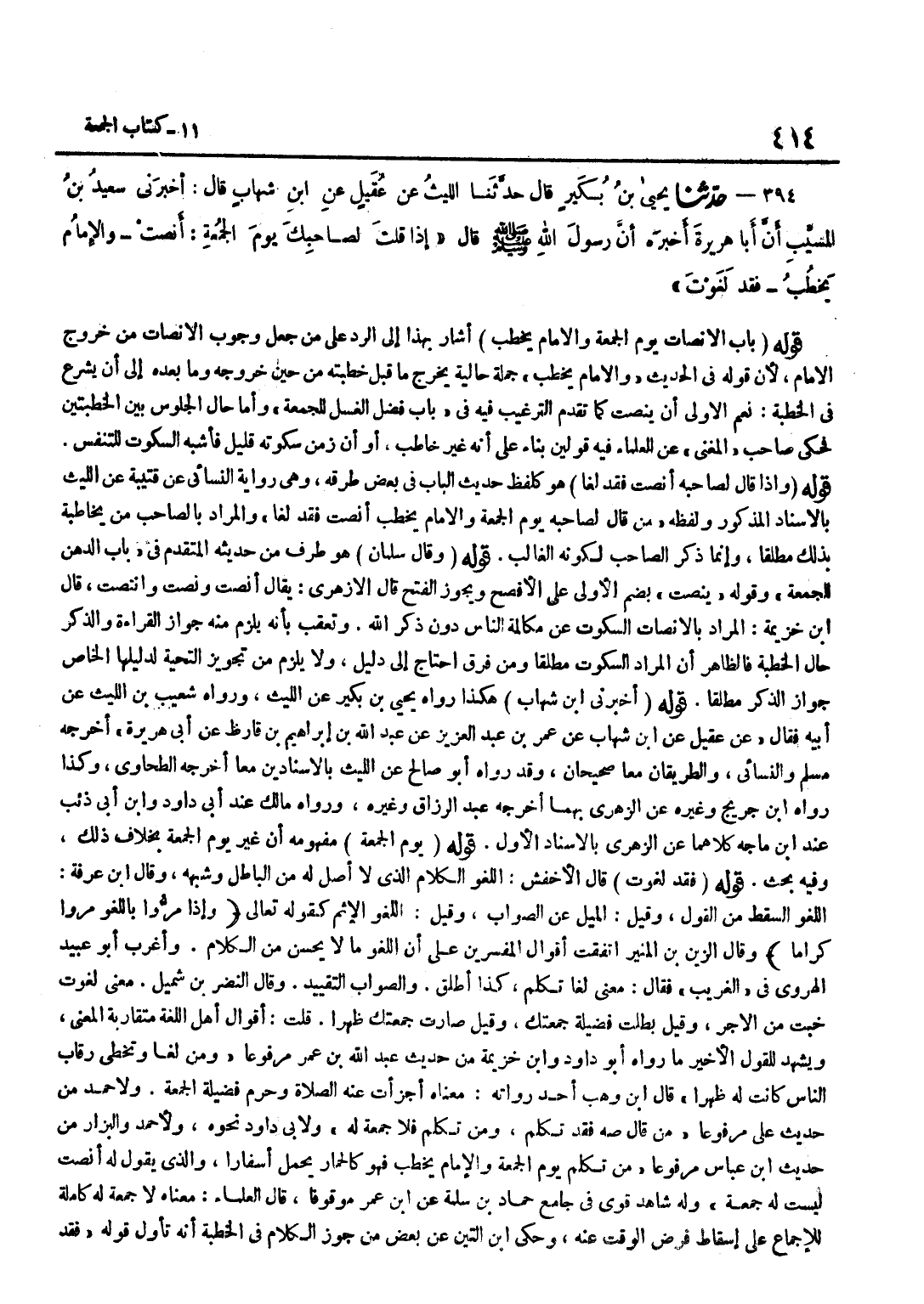 [934] قَوْلَهُ فِي الْحَدِيثِ وَالْإِمَامُ يَخْطُبُ جُمْلَةٌ حَالِيَّةٌ يُخْرِجُ مَا قَبْلَ خُطْبَتِهِ مِنْ حِينِ خُرُوجِهِ وَمَا بَعْدَهُ إِلَى أَنْ يَشْرَعَ فِي الْخُطْبَةِ نَعَمِ الْأَوْلَى أَنْ يُنْصِتَ كَمَا تَقَدَّمَ التَّرْغِيبُ فِيهِ فِي بَابِ فَضْلِ الْغُسْلِ لِلْجُمُعَةِ وَأَمَّا حَالُ الْجُلُوسِ بَيْنَ الْخُطْبَتَيْنِ فَحَكَى صَاحِبُ الْمُغْنِي عَنِ الْعُلَمَاءِ فِيهِ قَوْلَيْنِ بِنَاءً عَلَى أَنَّهُ غَيْرُ خَاطِبٍ أَوْ أَنَّ زَمَنَ سُكُوتِهِ قَلِيلٌ فَأَشْبَهَ السُّكُوتَ لِلتَّنَفُّسِ قَوْلُهُ وَإِذَا قَالَ لِصَاحِبِهِ أَنْصِتْ فَقَدْ لَغَا هُوَ كَلَفْظِ حَدِيثِ الْبَابِ فِي بَعْضِ طُرُقِهِ وَهِيَ رِوَايَةُ النَّسَائِيِّ عَنْ قُتَيْبَةَ عَنِ اللَّيْثِ بِالْإِسْنَادِ الْمَذْكُورِ وَلَفْظُهُ مَنْ قَالَ لِصَاحِبِهِ يَوْمَ الْجُمُعَةِ وَالْإِمَامُ يَخْطُبُ أَنْصِتْ فَقَدْ لَغَا وَالْمُرَادُ بِالصَّاحِبِ مَنْ يُخَاطِبُهُ بِذَلِكَ مُطْلَقًا وَإِنَّمَا ذَكَرَ الصَّاحِبَ لِكَوْنِهِ الْغَالِبَ قَوْلُهُ وَقَالَ سَلْمَانُ هُوَ طَرَفٌ مِنْ حَدِيثِهِ الْمُتَقَدِّمِ فِي بَابِ الدَّهْنِ لِلْجُمُعَةِ وَقَوْلُهُ يُنْصِتُ بِضَمِّ الْأُولَى عَلَى الْأَفْصَحِ وَيَجُوزُ الْفَتْحُ قَالَ الْأَزْهَرِيُّ يُقَالُ أنصت ونصت وانتصت قَالَ بن خُزَيْمَةَ الْمُرَادُ بِالْإِنْصَاتِ السُّكُوتُ عَنْ مُكَالَمَةِ النَّاسِ دُونَ ذِكْرِ اللَّهِ وَتُعُقِّبَ بِأَنَّهُ يَلْزَمُ مِنْهُ جَوَازُ الْقِرَاءَةِ وَالذِّكْرِ حَالَ الْخُطْبَةِ فَالظَّاهِرُ أَنَّ الْمُرَادَ السُّكُوتُ مُطْلَقًا وَمَنْ فَرَّقَ احْتَاجَ إِلَى دَلِيلٍ وَلَا يَلْزَمُ مِنْ تَجْوِيزِ التَّحِيَّةِ لِدَلِيلِهَا الْخَاص جَوَاز الذّكر مُطلقًا قَوْله أَخْبرنِي بن شِهَابٍ هَكَذَا رَوَاهُ يَحْيَى بْنُ بُكَيْرٍ عَنِ اللَّيْثِ وَرَوَاهُ شُعَيْبُ بْنُ اللَّيْثِ عَنْ أَبِيهِ فَقَالَ عَن عقيل عَن بن شِهَابٍ عَنْ عُمَرَ بْنِ عَبْدِ الْعَزِيزِ عَنْ عَبْدِ اللَّهِ بْنِ إِبْرَاهِيمَ بْنِ قَارِظٍ عَنْ أَبِي هُرَيْرَةَ أَخْرَجَهُ مُسْلِمٌ وَالنَّسَائِيُّ وَالطَّرِيقَانِ مَعًا صَحِيحَانِ وَقَدْ رَوَاهُ أَبُو صَالِحٍ عَنِ اللَّيْثِ بالإسنادين مَعًا أخرجه الطَّحَاوِيّ وَكَذَا رَوَاهُ بن جُرَيْجٍ وَغَيْرُهُ عَنْ الزُّهْرِيِّ بِهِمَا أَخْرَجَهُ عَبْدُ الرَّزَّاقِ وَغَيْرُهُ وَرَوَاهُ مَالِكٌ عِنْدَ أَبِي دَاوُدَ وبن أبي ذِئْب عِنْد بن مَاجَهْ كِلَاهُمَا عَنِ الزُّهْرِيِّ بِالْإِسْنَادِ الْأَوَّلِ قَوْلُهُ يَوْمَ الْجُمُعَةِ مَفْهُومُهُ أَنَّ غَيْرَ يَوْمِ الْجُمُعَةِ بِخِلَافِ ذَلِكَ وَفِيهِ بَحْثٌ قَوْلُهُ فَقَدْ لَغَوْتَ قَالَ الْأَخْفَشُ اللَّغْوُ الْكَلَامُ الَّذِي لَا أَصْلَ لَهُ من الْبَاطِل وَشبهه وَقَالَ بن عَرَفَةَ اللَّغْوُ السَّقْطُ مِنَ الْقَوْلِ وَقِيلَ الْمَيْلُ عَنِ الصَّوَابِ وَقِيلَ اللَّغْوُ الْإِثْمُ كَقولِهِ تَعَالَى وَإِذا مروا بِاللَّغْوِ مروا كراما وَقَالَ الزَّيْنُ بْنُ الْمُنِيرِ اتَّفَقَتْ أَقْوَالُ الْمُفَسِّرِينَ عَلَى أَنَّ اللَّغْوَ مَا لَا يَحْسُنُ مِنَ الْكَلَامِ وَأَغْرَبَ أَبُو عُبَيْدٍ الْهَرَوِيُّ فِي الْغَرِيبِ فَقَالَ مَعْنَى لَغَا تَكَلَّمَ كَذَا أَطْلَقَ وَالصَّوَابُ التَّقْيِيدُ وَقَالَ النَّضْرُ بْنُ شُمَيْلٍ مَعْنَى لَغَوْتُ خِبْتُ مِنَ الْأَجْرِ وَقِيلَ بَطَلَتْ فَضِيلَةُ جُمُعَتِكَ وَقِيلَ صَارَتْ جُمُعَتُكَ ظُهْرًا قُلْتُ أَقْوَالُ أَهْلِ اللُّغَةِ مُتَقَارِبَةُ الْمَعْنَى وَيَشْهَدُ لِلْقَوْلِ الْأَخِيرِ مَا رَوَاهُ أَبُو دَاوُد وبن خُزَيْمَةَ مِنْ حَدِيثِ عَبْدِ اللَّهِ بْنِ عُمَرَ مَرْفُوعًا وَمَنْ لَغَا وَتَخَطَّى رِقَابَ النَّاسِ كَانَتْ لَهُ ظهرا قَالَ بن وَهْبٍ أَحَد
