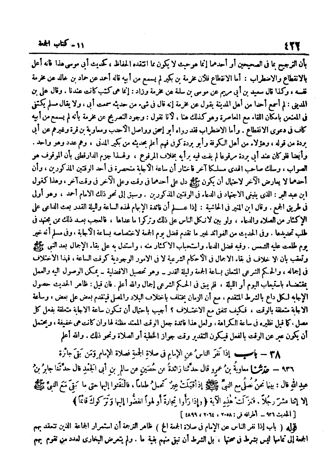 بِأَنَّ التَّرْجِيحَ بِمَا فِي الصَّحِيحَيْنِ أَوْ أَحَدِهِمَا إِنَّمَا هُوَ حَيْثُ لَا يَكُونُ مِمَّا انْتَقَدَهُ الْحُفَّاظُ كَحَدِيثِ أَبِي مُوسَى هَذَا فَإِنَّهُ أُعِلَّ بِالِانْقِطَاعِ وَالِاضْطِرَابِ أَمَّا الِانْقِطَاعُ فَلِأَنَّ مَخْرَمَةَ بْنَ بُكَيْرٍ لَمْ يَسْمَعْ مِنْ أَبِيهِ قَالَهُ أَحْمَدُ عَنْ حَمَّادِ بْنِ خَالِدٍ عَنْ مَخْرَمَةَ نَفْسِهِ وَكَذَا قَالَ سَعِيدُ بْنُ أَبِي مَرْيَمَ عَنْ مُوسَى بْنِ سَلَمَةَ عَنْ مَخْرَمَةَ وَزَادَ إِنَّمَا هِيَ كُتُبٌ كَانَتْ عِنْدَنَا وَقَالَ عَلِيُّ بْنُ الْمَدِينِيِّ لَمْ أَسْمَعْ أَحَدًا مِنْ أَهْلِ الْمَدِينَةِ يَقُولُ عَنْ مَخْرَمَةَ إِنَّهُ قَالَ فِي شَيْءٍ مِنْ حَدِيثِهِ سَمِعْتُ أَبِي وَلَا يُقَالُ مُسْلِمٌ يَكْتَفِي فِي الْمُعَنْعَنِ بِإِمْكَانِ اللِّقَاءِ مَعَ الْمُعَاصَرَةِ وَهُوَ كَذَلِكَ هُنَا لِأَنَّا نَقُولُ وُجُودُ التَّصْرِيحِ عَنْ مَخْرَمَةَ بِأَنَّهُ لَمْ يَسْمَعْ مِنْ أَبِيهِ كَافٍ فِي دَعْوَى الِانْقِطَاعِ وَأَمَّا الِاضْطِرَابُ فَقَدْ رَوَاهُ أَبُو إِسْحَاقَ وَوَاصِلٌ الْأَحْدَبُ وَمُعَاوِيَةُ بْنُ قُرَّةَ وَغَيْرُهُمْ عَنْ أَبِي بُرْدَةَ مِنْ قَوْلِهِ وَهَؤُلَاءِ مِنْ أَهْلِ الْكُوفَةِ وَأَبُو بُرْدَةَ كُوفِيٌّ فَهُمْ أَعْلَمُ بِحَدِيثِهِ مِنْ بُكَيْرٍ الْمَدَنِيِّ وَهُمْ عَدَدٌ وَهُوَ وَاحِدٌ وَأَيْضًا فَلَوْ كَانَ عِنْدَ أَبِي بُرْدَةَ مَرْفُوعًا لَمْ يُفْتِ فِيهِ بِرَأْيهِ بِخِلَافِ الْمَرْفُوعِ وَلِهَذَا جَزَمَ الدَّارَقُطْنِيُّ بِأَنَّ الْمَوْقُوفَ هُوَ الصَّوَابُ وَسَلَكَ صَاحِبُ الْهُدَى مَسْلَكًا آخَرَ فَاخْتَارَ أَنَّ سَاعَةَ الْإِجَابَةِ مُنْحَصِرَةً فِي أَحَدِ الْوَقْتَيْنِ الْمَذْكُورَيْنِ وَأَنَّ أَحَدَهُمَا لَا يُعَارِضُ الْآخَرَ لِاحْتِمَالِ أَنْ يَكُونَ صَلَّى اللَّهُ عَلَيْهِ وَسَلَّمَ دَلَّ عَلَى أَحَدِهِمَا فِي وَقْتٍ وَعَلَى الْآخَرِ فِي وَقت آخر وَهَذَا كَقَوْل بن عَبْدِ الْبَرِّ الَّذِي يَنْبَغِي الِاجْتِهَادُ فِي الدُّعَاءِ فِي الْوَقْتَيْنِ الْمَذْكُورَيْنِ وَسَبَقَ إِلَى نَحْوِ ذَلِكَ الْإِمَامُ أَحْمَدُ وَهُوَ أَوْلَى فِي طَرِيقِ الْجَمْعِ وَقَالَ بن الْمُنِيرِ فِي الْحَاشِيَةِ إِذَا عُلِمَ أَنَّ فَائِدَةَ الْإِبْهَامِ لِهَذِهِ السَّاعَةِ وَلِلَيْلَةِ الْقَدْرِ بَعْثُ الدَّاعِي عَلَى الْإِكْثَارِ مِنَ الصَّلَاةِ وَالدُّعَاءِ وَلَوْ بَيَّنَ لَاتَّكَلَ النَّاسُ عَلَى ذَلِكَ وَتَرَكُوا مَا عَدَاهَا فَالْعَجَبُ بَعْدَ ذَلِكَ مِمَّنْ يَجْتَهِدُ فِي طَلَبِ تَحْدِيدِهَا وَفِي الْحَدِيثِ مِنَ الْفَوَائِدِ غَيْرِ مَا تَقَدَّمَ فَضْلُ يَوْمِ الْجُمُعَةِ لِاخْتِصَاصِهِ بِسَاعَةِ الْإِجَابَةِ وَفِي مُسْلِمٍ أَنَّهُ خَيْرُ يَوْمٍ طَلَعَتْ عَلَيْهِ الشَّمْسُ وَفِيهِ فَضْلُ الدُّعَاءِ وَاسْتِحْبَابُ الْإِكْثَارِ مِنْهُ وَاسْتُدِلَّ بِهِ عَلَى بَقَاءِ الْإِجْمَالِ بَعْدَ النَّبِيِّ صَلَّى اللَّهُ عَلَيْهِ وَسَلَّمَ وَتُعُقِّبَ بِأَنَّ الِاخْتِلَاف فِي بَقَاءِ الْإِجْمَالِ فِي الْأَحْكَامِ الشَّرْعِيَّةِ لَا فِي الْأُمُورِ الْوُجُودِيَّةِ كَوَقْتِ السَّاعَةِ فَهَذَا الِاخْتِلَافُ فِي إِجْمَالِهِ وَالْحُكْمُ الشَّرْعِيُّ الْمُتَعَلِّقُ بِسَاعَةِ الْجُمُعَةِ وَلَيْلَةِ الْقَدْرِ وَهُوَ تَحْصِيلُ الْأَفْضَلِيَّةِ يُمْكِنُ الْوُصُولُ إِلَيْهِ وَالْعَمَلُ بِمُقْتَضَاهُ بِاسْتِيعَابِ الْيَوْمِ أَوِ اللَّيْلَةِ فَلَمْ يَبْقَ فِي الْحُكْمِ الشَّرْعِيِّ إِجْمَالٌ وَاللَّهُ أَعْلَمُ فَإِنْ قِيلَ ظَاهِرُ الْحَدِيثِ حُصُولُ الْإِجَابَةِ لِكُلِّ دَاعٍ بِالشَّرْطِ الْمُتَقَدِّمِ مَعَ أَنَّ الزَّمَانَ يَخْتَلِفُ بِاخْتِلَافِ الْبِلَادِ وَالْمُصَلِّي فَيَتَقَ