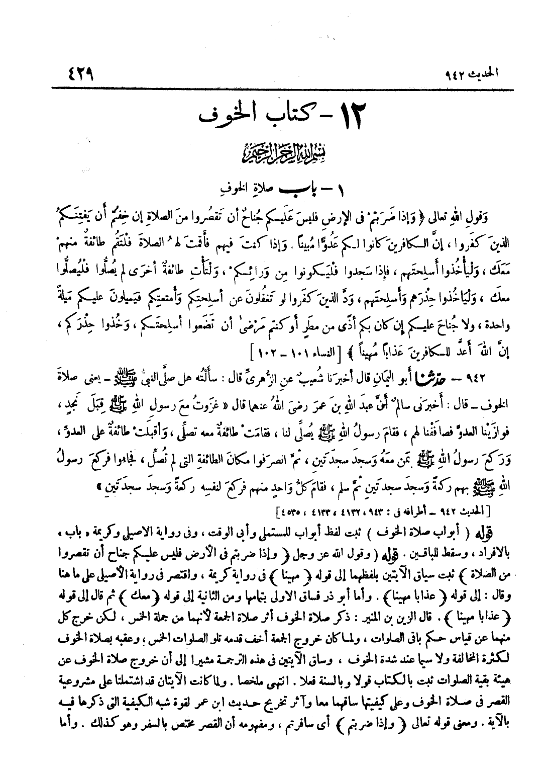 ثَبَتَ لَفْظُ أَبْوَابٍ لِلْمُسْتَمْلِي وَأَبِي الْوَقْتِ وَفِي رِوَايَةِ الْأَصِيلِيِّ وَكَرِيمَةَ بَابٌ بِالْإِفْرَادِ وَسَقَطَ لِلْبَاقِينَ قَوْلُهُ وَقَوْلُ اللَّهِ عَزَّ وَجَلَّ وَإِذَا ضَرَبْتُمْ فِي الْأَرْضِ فَلَيْسَ عَلَيْكُمْ جُنَاحٌ أَنْ تَقْصُرُوا مِنَ الصَّلَاةِ ثَبَتَ سِيَاقُ الْآيَتَيْنِ بِلَفْظِهِمَا إِلَى قَوْلِهِ مَهِينًا فِي رِوَايَةِ كَرِيمَةَ وَاقْتَصَرَ فِي رِوَايَةِ الْأَصِيلِيِّ عَلَى مَا هُنَا وَقَالَ إِلَى قَوْلِهِ عَذَابًا مهينا وَأَمَّا أَبُو ذَرٍّ فَسَاقَ الْأُولَى بِتَمَامِهَا وَمِنَ الثَّانِيَةِ إِلَى قَوْلِهِ مَعَكَ ثُمَّ قَالَ إِلَى قَوْله عذَابا مهينا قَالَ الزَّيْنُ بْنُ الْمُنِيرِ ذَكَرَ صَلَاةَ الْخَوْفِ إثْرَ صَلَاةَ الْجُمُعَةِ لِأَنَّهُمَا مِنْ جُمْلَةِ الْخَمْسِ لَكِنْ خَرَجَ كُلٌّ مِنْهُمَا عَنْ قِيَاسِ حُكْمِ بَاقِي الصَّلَوَاتِ وَلَمَّا كَانَ خُرُوجُ الْجُمُعَةِ أَخَفَّ قَدَّمَهُ تِلْوَ الصَّلَوَاتِ الْخَمْسَ وَعَقَّبَهُ بِصَلَاةِ الْخَوْفِ لِكَثْرَةِ الْمُخَالَفَةِ وَلَا سِيَّمَا عِنْدَ شِدَّةِ الْخَوْفِ وَسَاقَ الْآيَتَيْنِ فِي هَذِهِ التَّرْجَمَةِ مُشِيرًا إِلَى أَنَّ خُرُوجَ صَلَاةِ الْخَوْفِ عَنْ هَيْئَةِ بَقِيَّةِ الصَّلَوَاتِ ثَبَتَ بِالْكِتَابِ قَوْلًا وَبِالسُّنَّةِ فِعْلًا انْتَهَى مُلَخَّصًا وَلَمَّا كَانَتِ الْآيَتَانِ قَدِ اشْتَمَلَتَا عَلَى مَشْرُوعِيَّةِ الْقَصْرِ فِي صَلَاةِ الْخَوْفِ وَعَلَى كَيْفِيَّتِهَا ساقهما مَعًا وآثر تَخْرِيج حَدِيث بن عُمَرَ لِقُوَّةِ شَبَهِ الْكَيْفِيَّةِ الَّتِي ذَكَرَهَا فِيهِ بِالْآيَةِ وَمعنى قَوْله تَعَالَى وَإِذا ضَرَبْتُمْ أَيْ سَافَرْتُمْ وَمَفْهُومُهُ أَنَّ الْقَصْرَ مُخْتَصٌّ بِالسَّفَرِ وَهُوَ كَذَلِك وَأما