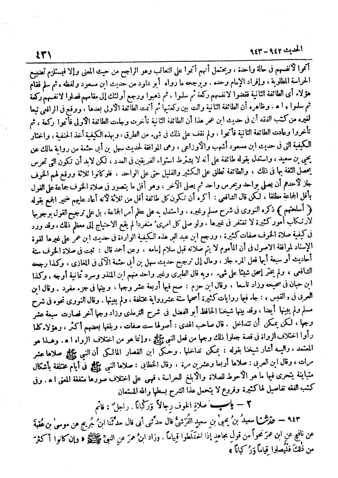 أَتَمُّوا لِأَنْفُسِهِمْ فِي حَالَةٍ وَاحِدَةٍ وَيُحْتَمَلُ أَنَّهُمْ أَتَمُّوا عَلَى التَّعَاقُبِ وَهُوَ الرَّاجِحُ مِنْ حَيْثُ الْمَعْنَى وَإِلَّا فَيَسْتَلْزِمُ تَضْيِيعَ الْحِرَاسَةِ الْمَطْلُوبَةِ وَإِفْرَادَ الْإِمَامِ وَحْدَهُ وَيُرَجِّحُهُ مَا رَوَاهُ أَبُو دَاوُدَ من حَدِيث بن مَسْعُودٍ وَلَفْظُهُ ثُمَّ سَلَّمَ فَقَامَ هَؤُلَاءِ أَيِ الطَّائِفَةُ الثَّانِيَةُ فَقَضَوْا لِأَنْفُسِهِمْ رَكْعَةً ثُمَّ سَلَّمُوا ثُمَّ ذَهَبُوا وَرَجَعَ أُولَئِكَ إِلَى مَقَامِهِمْ فَصَلَّوْا لِأَنْفُسِهِمْ رَكْعَةً ثُمَّ سَلَّمُوا اه وَظَاهِرُهُ أَنَّ الطَّائِفَة الثَّانِيَة والت بَيْنَ رَكْعَتَيْهَا ثُمَّ أَتَمَّتِ الطَّائِفَةُ الْأُولَى بَعْدَهَا وَوَقَعَ فِي الرَّافِعِيِّ تَبَعًا لِغَيْرِهِ مِنْ كُتُبِ الْفِقْه أَن فِي حَدِيث بن عُمَرَ هَذَا أَنَّ الطَّائِفَةَ الثَّانِيَةَ تَأَخَّرَتْ وَجَاءَتِ الطَّائِفَةُ الْأُولَى فَأَتَمُّوا رَكْعَةً ثُمَّ تَأَخَّرُوا وَعَادَتِ الطَّائِفَةُ الثَّانِيَةُ فَأَتَمُّوا وَلَمْ نَقِفْ عَلَى ذَلِكَ فِي شَيْءٍ مِنَ الطُّرُقِ وَبِهَذِهِ الْكَيْفِيَّةِ أَخَذَ الْحَنَفِيَّة وَاخْتَارَ الْكَيْفِيَّة الَّتِي فِي حَدِيث بن مَسْعُودٍ أَشْهَبُ وَالْأَوْزَاعِيُّ وَهِيَ الْمُوَافِقَةُ لِحَدِيثِ سَهْلِ بْنِ أَبِي حَثْمَةَ مِنْ رِوَايَةِ مَالِكٍ عَنْ يَحْيَى بْنِ سَعِيدٍ وَاسْتَدَلَّ بِقَوْلِهِ طَائِفَةٌ عَلَى أَنَّهُ لَا يُشْتَرَطُ اسْتِوَاءُ الْفَرِيقَيْنِ فِي الْعَدَدِ لَكِنْ لَا بُدَّ أَنْ تَكُونَ الَّتِي تَحْرُسُ يَحْصُلُ الثِّقَةُ بِهَا فِي ذَلِكَ وَالطَّائِفَةُ تُطْلَقُ عَلَى الْكَثِيرِ وَالْقَلِيلِ حَتَّى عَلَى الْوَاحِدِ فَلَوْ كَانُوا ثَلَاثَةً وَوَقَعَ لَهُمْ الْخَوْفُ جَازَ لِأَحَدِهِمْ أَنْ يُصَلِّيَ بِوَاحِدٍ وَيَحْرُسَ وَاحِدٌ ثُمَّ يُصَلِّيَ الْآخَرُ وَهُوَ أَقَلُّ مَا يُتَصَوَّرُ فِي صَلَاةِ الْخَوْفِ جَمَاعَةٌ عَلَى الْقَوْلِ بِأَقَلِّ الْجَمَاعَةِ مُطْلَقًا لَكِنْ قَالَ الشَّافِعِيُّ أَكْرَهُ أَنْ تَكُونَ كُلُّ طَائِفَةٍ أَقَلَّ مِنْ ثَلَاثَةٍ لِأَنَّهُ أَعَادَ عَلَيْهِمْ ضَمِيرَ الْجَمْعِ بِقَوْلِهِ أَسْلِحَتَهُمْ ذَكَرَهُ النَّوَوِيُّ فِي شَرْحِ مُسْلِمٍ وَغَيْرِهِ وَاسْتَدَلَّ بِهِ عَلَى عِظَمِ أَمْرِ الْجَمَاعَةِ بَلْ عَلَى تَرْجِيحِ الْقَوْلِ بِوُجُوبِهَا لِارْتِكَابِ أُمُورٍ كَثِيرَةٍ لَا تُغْتَفَرُ فِي غَيْرِهَا وَلَوْ صَلَّى كُلُّ امْرِئٍ مُنْفَرِدًا لَمْ يَقَعْ الِاحْتِيَاجُ إِلَى مُعْظَمِ ذَلِكَ وَقَدْ وَرَدَ فِي كَيْفيَّة صَلَاة الْخَوْف صِفَات كَثِيرَة وَرجح بن عَبْدِ الْبَرِّ هَذِهِ الْكَيْفِيَّةَ الْوَارِدَةَ فِي حَدِيثِ بن عُمَرَ عَلَى غَيْرِهَا لِقُوَّةِ الْإِسْنَادِ لِمُوَافَقَةِ الْأُصُولِ فِي أَنَّ الْمَأْمُومَ لَا يُتِمُّ صِلَاتَهُ قَبْلَ سَلَامِ إِمَامِهِ وَعَنْ أَحْمَدَ قَالَ ثَبَتَ فِي صَلَاةِ الْخَوْفِ سِتَّةُ أَحَادِيثَ أَوْ سَبْعَةٌ أَيُّهَا فَعَلَ الْمَرْءُ جَازَ وَمَالَ إِلَى تَرْجِيحِ حَدِيثِ سَهْلِ بْنِ أَبِي حَثْمَةَ الْآتِي فِي الْمَغَازِي وَكَذَا رَجَّحَهُ الشَّافِعِيُّ وَلَمْ يَخْتَرْ إِسْحَاقُ شَيْئًا عَلَى شَيْءٍ وَبِهِ قَالَ الطَّبَرِيُّ وَغَيْرُ وَاحِدٍ مِنْهُم بن الْمُنْذر وسرد ثَمَانِيَة أوجه وَكَذَا بن حبَان فِي صَحِيحه وَزَاد تاسعا وَقَالَ بن حَزْمٍ صَحَّ فِيهَا أَرْبَعَةَ عَشَرَ وَجْهًا وَبَيَّنَهَا فِي جُزْء مُفْرد وَقَالَ بن الْعَرَبِيِّ فِي الْقَبَسِ جَاءَ فِيهَا رِوَايَاتٌ كَثِيرَةٌ أَصَحُّهَا سِتَّةَ عَشَرَ رِوَايَةً مُخْتَلِفَةً وَلَمْ يُبَيِّنْهَا وَقَالَ النَّوَوِيُّ نَحْوَهُ فِي شَرْحِ مُسْلِمٍ وَلَمْ يُبَيِّنْهَا أَيْضًا وَقَدْ بَيَّنَهَا شَيْخُنَا ا
