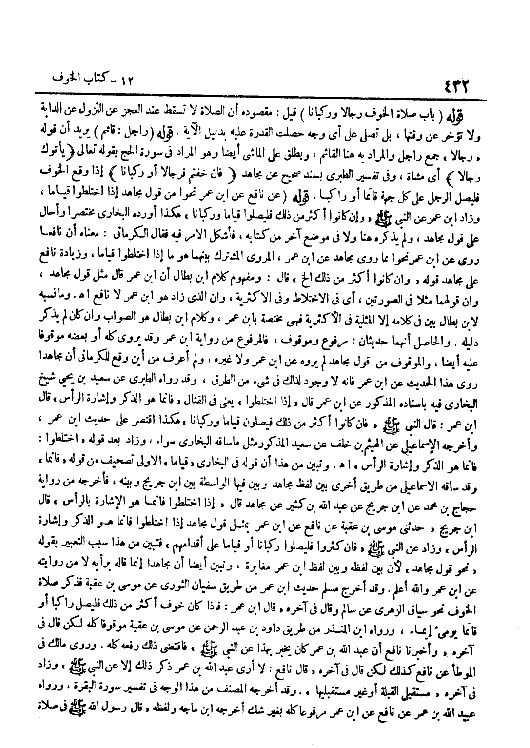 [943] قَوْلُهُ عَنْ نَافِعٍ عَن بن عُمَرَ نَحْوًا مِنْ قَوْلِ مُجَاهِدٍ إِذَا اخْتَلَطُوا قيَاما وَزَاد بْنِ عُمَرَ عَنِ النَّبِيِّ صَلَّى اللَّهُ عَلَيْهِ وَسَلَّمَ وَإِنْ كَانُوا أَكْثَرَ مِنْ ذَلِكَ فَلْيُصَلُّوا قِيَامًا وَرُكْبَانًا هَكَذَا أَوْرَدَهُ الْبُخَارِيُّ مُخْتَصَرًا وَأَحَالَ عَلَى قَوْلِ مُجَاهِدٍ وَلَمْ يَذْكُرْهُ هُنَا وَلَا فِي مَوْضِعٍ آخَرَ مِنْ كِتَابِهِ فَأَشْكَلَ الْأَمْرُ فِيهِ فَقَالَ الْكِرْمَانِيُّ مَعْنَاهُ أَنْ نَافِعًا رَوَى عَنِ بن عمر نَحوا مِمَّا روى مُجَاهِد عَن بن عُمَرَ الْمَرْوِيُّ الْمُشْتَرَكُ بَيْنَهُمَا هُوَ مَا إِذَا اخْتَلَطُوا قِيَامًا وَزِيَادَةُ نَافِعٍ عَلَى مُجَاهِدٍ قَوْلُهُ وَإِنْ كَانُوا أَكْثَرَ مِنْ ذَلِكَ إِلَخْ قَالَ وَمَفْهُوم كَلَام بن بطال أَن بن عُمَرَ قَالَ مِثْلَ قَوْلِ مُجَاهِدٍ وَأَنَّ قَوْلَهُمَا مَثَلًا فِي الصُّورَتَيْنِ أَيْ فِي الِاخْتِلَاطِ وَفِي الاكثرية وَأَن الَّذِي زَاد هُوَ بن عُمَرَ لَا نَافِعٌ اه وَمَا نَسَبَهُ لِابْنِ بَطَّالٍ بَيِّنٌ فِي كَلَامِهِ إِلَّا الْمِثْلِيَّةَ فِي الأكثرية فَهِيَ مُخْتَصَّة بِابْن عمر وَكَلَام بن بَطَّالٍ هُوَ الصَّوَابُ وَإِنْ كَانَ لَمْ يَذْكُرْ دَلِيلَهُ وَالْحَاصِلُ أَنَّهُمَا حَدِيثَانِ مَرْفُوعٌ وَمَوْقُوفٌ فَالْمَرْفُوعُ من رِوَايَة بن عُمَرَ وَقَدْ يُرْوَى كُلُّهُ أَوْ بَعْضُهُ مَوْقُوفًا عَلَيْهِ أَيْضًا وَالْمَوْقُوفُ مِنْ قَوْلِ مُجَاهِدٍ لَمْ يروه عَن بن عُمَرَ وَلَا غَيْرِهِ وَلَمْ أَعْرِفْ مِنْ أَيْنَ وَقَعَ لِلْكِرْمَانِيِّ أَنَّ مُجَاهِدًا رَوَى هَذَا الْحَدِيثَ عَن بن عُمَرَ فَإِنَّهُ لَا وُجُودَ لِذَلِكَ فِي شَيْءٍ مِنَ الطُّرُقِ وَقَدْ رَوَاهُ الطَّبَرِيُّ عَنْ سَعِيدِ بْنِ يَحْيَى شَيْخِ الْبُخَارِيِّ فِيهِ بِإِسْنَادِهِ الْمَذْكُورِ عَن بن عُمَرَ قَالَ إِذَا اخْتَلَطُوا يَعْنِي فِي الْقِتَالِ فَإِنَّمَا هُوَ الذّكر وَإِشَارَة الرَّأْس قَالَ بن عُمَرَ قَالَ النَّبِيُّ صَلَّى اللَّهُ عَلَيْهِ وَسَلَّمَ فَإِنْ كَانُوا أَكْثَرَ مِنْ ذَلِكَ فَيُصَلُّونَ قِيَامًا وركبانا هَكَذَا اقْتصر على حَدِيث بن عُمَرَ وَأَخْرَجَهُ الْإِسْمَاعِيلِيُّ عَنِ الْهَيْثَمِ بْنِ خَلَفٍ عَنْ سَعِيدٍ الْمَذْكُورِ مِثْلَ مَا سَاقَهُ الْبُخَارِيُّ سَوَاءً وَزَادَ بَعْدَ قَوْلِهِ اخْتَلَطُوا فَإِنَّمَا هُوَ الذِّكْرُ وَإِشَارَةُ الرَّأْسِ اه وَتَبَيَّنَ مِنْ هَذَا أَنَّ قَوْلَهُ فِي الْبُخَارِيِّ قِيَامًا الْأُولَى تَصْحِيفٌ مِنْ قَوْلِهِ فَإِنَّمَا وَقَدْ سَاقَهُ الْإِسْمَاعِيلِيُّ مِنْ طَرِيقٍ أُخْرَى بَيْنَ لَفْظِ مُجَاهِدٍ وَبَيَّنَ فِيهَا الْوَاسِطَة بَين بن جُرَيْجٍ وَبَيْنَهُ فَأَخْرَجَهُ مِنْ رِوَايَةِ حَجَّاجِ بْنِ مُحَمَّد عَن بن جُرَيْجٍ عَنْ عَبْدِ اللَّهِ بْنِ كَثِيرٍ عَنْ مُجَاهِدٍ قَالَ إِذَا اخْتَلَطُوا فَإِنَّمَا هُوَ الْإِشَارَةُ بِالرَّأْسِ قَالَ بن جُرَيْجٍ حَدَّثَنِي مُوسَى بْنُ عُقْبَةَ عَنْ نَافِعٍ عَن بن عُمَرَ بِمِثْلِ قَوْلِ مُجَاهِدٍ إِذَا اخْتَلَطُوا فَإِنَّمَا هُوَ الذِّكْرُ وَإِشَارَةُ الرَّأْسِ وَزَادَ عَنِ النَّبِيِّ صَلَّى اللَّهُ عَلَيْهِ وَسَلَّمَ فَإِنْ كَثُرُوا فَلْيُصَلُّوا رُكْبَانًا أَوْ قِيَامًا عَلَى أَقْدَامِهِمْ فَتَبَيَّنَ مِنْ هَذَا سَبَبُ التَّعْبِيرِ بِقَوْلِهِ نَحْوَ قَوْلِ مُجَاهِدٍ لِأَن بَين لَفظه وَبَين لفظ بن عُمَرَ مُغَايَرَةً وَتَبَيَّنَ أَيْضًا أَنَّ مُجَاهِدًا إِنَّمَا قَالَه بِرَأْيهِ لَا من رِوَايَته عَن بن عُمَرَ وَاللَّهُ أَعْلَمُ وَقَدْ أَخْرَجَ مُسْلِمٌ حَدِيثَ بن عُمَرَ مِنْ طَرِيقِ سُفْيَانَ الثَّوْرِيِّ عَنْ مُوسَى بْنِ عُقْبَةَ فَذَكَرَ صَلَاةَ الْخَوْفِ نَحْوَ سِيَاقِ الزُّهْرِيِّ عَنْ 