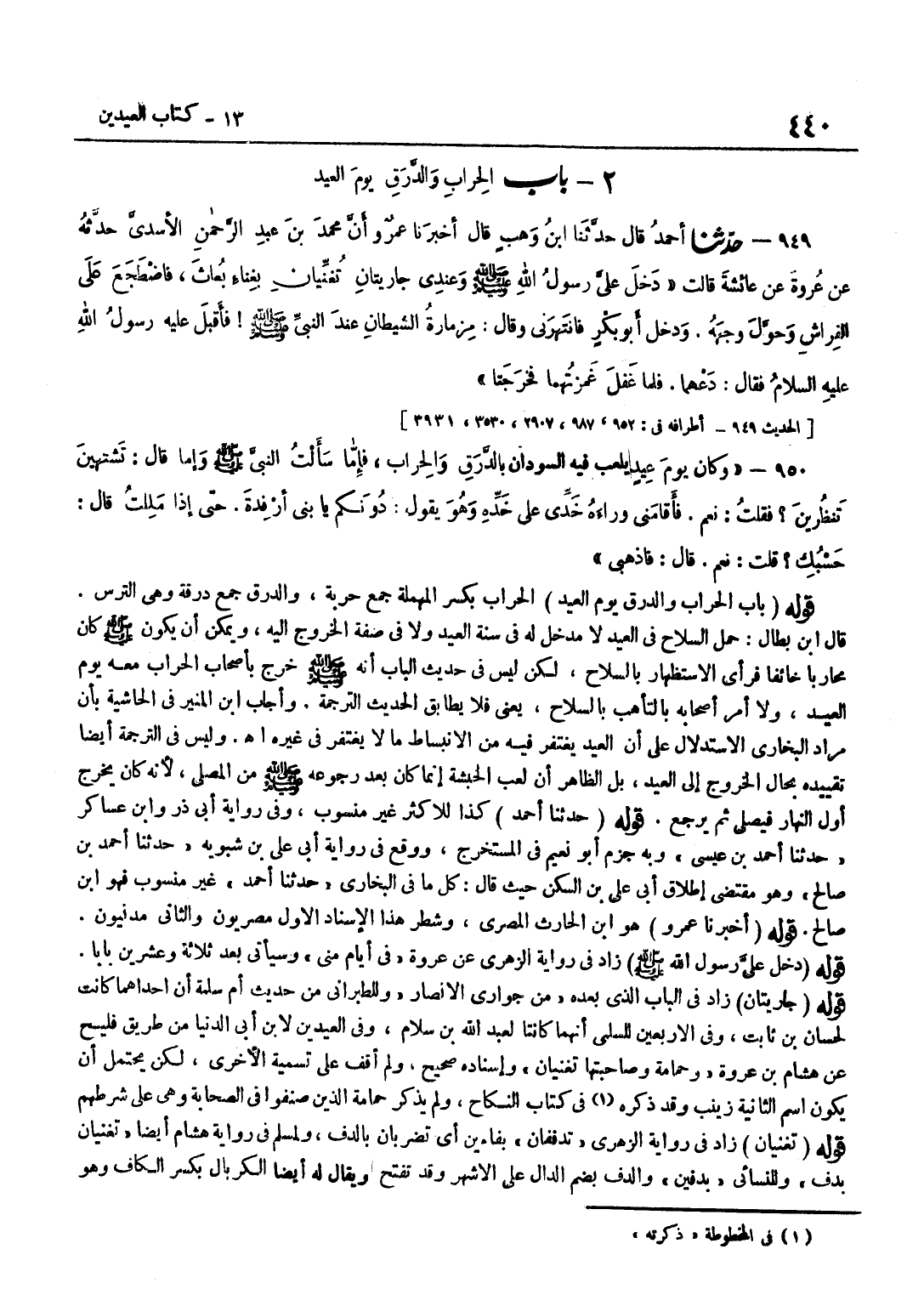 [949] قَوْلُهُ حَدَّثَنَا أَحْمَدُ كَذَا لِلْأَكْثَرِ غَيْرُ مَنْسُوبٍ وَفِي رِوَايَةِ أَبِي ذَرٍّ وبن عَسَاكِرَ حَدَّثَنَا أَحْمَدُ بْنُ عِيسَى وَبِهِ جَزَمَ أَبُو نُعَيْمٍ فِي الْمُسْتَخْرَجِ وَوَقْعَ فِي رِوَايَةِ أَبِي عَلِيِّ بْنِ شَبُّوَيْهِ حَدَّثَنَا أَحْمَدُ بْنُ صَالِحٍ وَهُوَ مُقْتَضَى إِطْلَاقِ أَبِي عَلِيِّ بْنِ السَّكَنِ حَيْثُ قَالَ كُلُّ مَا فِي الْبُخَارِيِّ حَدثنَا أَحْمد غير مَنْسُوب فَهُوَ بن صَالح قَوْله أخبرنَا عَمْرو هُوَ بن الْحَارِثِ الْمِصْرِيُّ وَشَطْرُ هَذَا الْإِسْنَادِ الْأَوَّلِ مِصْرِيُّونَ وَالثَّانِي مَدَنِيُّونَ قَوْلُهُ دَخَلَ عَلَى رَسُولِ اللَّهِ صَلَّى اللَّهُ عَلَيْهِ وَسَلَّمَ زَادَ فِي رِوَايَةِ الزُّهْرِيِّ عَنْ عُرْوَةَ فِي أَيَّامِ مِنًى وَسَيَأْتِي بَعْدَ ثَلَاثَةٍ وَعِشْرِينَ بَابًا قَوْلُهُ جَارِيَتَانِ زَادَ فِي الْبَابِ الَّذِي بَعْدَهُ مِنْ جَوَارِي الْأَنْصَارِ وَلِلطَّبَرَانِيِّ مِنْ حَدِيثِ أُمِّ سَلَمَةَ أَنَّ إِحْدَاهُمَا كَانَتْ لِحَسَّانَ بْنِ ثَابِتٍ وَفِي الْأَرْبَعِينَ لِلسُّلَمِيِّ أَنَّهُمَا كَانَتَا لِعَبْدِ اللَّهِ بْنِ سَلَامٍ وَفِي الْعِيدَيْنِ لِابْنِ أَبِي الدُّنْيَا مِنْ طَرِيقِ فُلَيْحٍ عَنْ هِشَامِ بْنِ عُرْوَةَ وَحَمَامَةَ وَصَاحِبَتِهَا تُغَنِّيَانِ وَإِسْنَادُهُ صَحِيحٌ وَلَمْ أَقِفْ عَلَى تَسْمِيَةِ الْأُخْرَى لَكِنْ يُحْتَمَلُ أَنْ يَكُونَ اسْمُ الثَّانِيَةِ زَيْنَبَ وَقَدْ ذَكَرَهُ فِي كِتَابِ النِّكَاحِ وَلَمْ يَذْكُرْ حَمَامَةَ الَّذِينَ صَنَّفُوا فِي الصَّحَابَةِ وَهِيَ عَلَى شَرْطِهِمْ قَوْلُهُ تُغَنِّيَانِ زَادَ فِي رِوَايَةِ الزُّهْرِيِّ تُدَفِّفَانِ بِفَاءَيْنِ أَيْ تَضْرِبَانِ بِالدُّفِّ وَلِمُسْلِمٍ فِي رِوَايَةِ هِشَامٍ أَيْضًا تُغَنِّيَانِ بِدُفٍّ وَلِلنَّسَائِيِّ بِدُفَّيْنِ وَالدُّفُّ بِضَمِّ الدَّالِ عَلَى الْأَشْهَرِ وَقَدْ تُفْتَحُ وَيُقَالُ لَهُ أَيْضًا الْكِرْبَالُ بِكَسْرِ الْكَافِ وَهُوَ