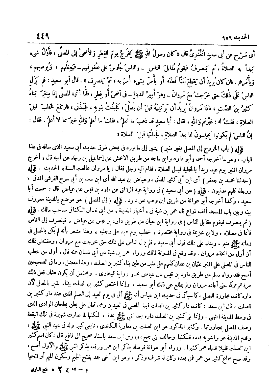 [956] قَوْلُهُ عَنْ أَبِي سَعِيدٍ فِي رِوَايَةِ عَبْدِ الرَّزَّاقِ عَنْ دَاوُدَ بْنِ قَيْسٍ عَنْ عِيَاضٍ قَالَ سَمِعْتُ أَبَا سَعِيدٍ وَكَذَا أخرجه أَبُو عوَانَة من طَرِيق بن وَهْبٍ عَنْ دَاوُدَ قَوْلُهُ إِلَى الْمُصَلَّى هُوَ مَوْضِعٌ بِالْمَدِينَةِ مَعْرُوفٌ بَيْنَهُ وَبَيْنَ بَابِ الْمَسْجِدِ أَلْفُ ذِرَاعٍ قَالَهُ عُمَرُ بْنُ شَبَّةَ فِي أَخْبَارِ الْمَدِينَةِ عَنْ أَبِي غَسَّانَ الْكِنَانِيِّ صَاحِبِ مَالك قَوْلُهُ ثُمَّ يَنْصَرِفُ فَيَقُومُ مُقَابِلَ النَّاسِ فِي رِوَايَة بن حِبَّانَ مِنْ طَرِيقِ دَاوُدَ بْنِ قَيْسٍ عَنْ عِيَاضٍ فَيَنْصَرِفُ إِلَى النَّاسِ قَائِمًا فِي مُصَلَّاهُ وَلِابْنِ خُزَيْمَةَ فِي رِوَايَةٍ مُخْتَصَرَةٍ خَطَبَ يَوْمَ عِيدٍ عَلَى رِجْلَيْهِ وَهَذَا مُشْعِرٌ بِأَنَّهُ لَمْ يَكُنْ بِالْمُصَلَّى فِي زَمَانِهِ صَلَّى اللَّهُ عَلَيْهِ وَسَلَّمَ مِنْبَرٌ وَيَدُلُّ عَلَى ذَلِكَ قَوْلُ أَبِي سَعِيدٍ فَلَمْ يَزَلِ النَّاسُ عَلَى ذَلِكَ حَتَّى خَرَجْتُ مَعَ مَرْوَانَ وَمُقْتَضَى ذَلِكَ أَنَّ أَوَّلَ مَنِ اتَّخَذَهُ مَرْوَانُ وَقَدْ وَقَعَ فِي الْمُدَوَّنَةِ لِمَالِكٍ وَرَوَاهُ عُمَرُ بْنُ شَبَّةَ عَنْ أَبِي غَسَّانَ عَنْهُ قَالَ أَوَّلُ مَنْ خَطَبَ النَّاسَ فِي الْمُصَلَّى عَلَى الْمِنْبَرِ عُثْمَانُ بْنُ عَفَّانَ كَلَّمَهُمْ عَلَى مِنْبَرٍ مِنْ طِينٍ بَنَاهُ كَثِيرُ بْنُ الصَّلْتِ وَهَذَا مُعْضِلٌ وَمَا فِي الصَّحِيحَيْنِ أَصَحُّ فَقَدْ رَوَاهُ مُسْلِمٌ مِنْ طَرِيقِ دَاوُدَ بْنِ قَيْسٍ عَنْ عِيَاضٍ نَحْوَ رِوَايَةِ الْبُخَارِيِّ وَيُحْتَمَلُ أَنْ يَكُونَ عُثْمَانُ فَعَلَ ذَلِكَ مَرَّةً ثُمَّ تَرَكَهُ حَتَّى أَعَادَهُ مَرْوَانُ وَلَمْ يَطَّلِعْ عَلَى ذَلِكَ أَبُو سَعِيدٍ وَإِنَّمَا اخْتَصَّ كَثِيرُ بْنُ الصَّلْتِ بِبِنَاءِ الْمِنْبَرِ بِالْمُصَلَّى لِأَنَّ دَارَهُ كَانَتْ مُجَاوِرَةً لِلْمُصَلَّى كَمَا سَيَأْتِي فِي حَدِيثِ بن عَبَّاسٍ أَنَّهُ صَلَّى اللَّهُ عَلَيْهِ وَسَلَّمَ أَتَى فِي يَوْمِ الْعِيدِ إِلَى الْعَلَمَ الَّذِي عِنْدَ دَارِ كَثِيرِ بْنِ الصَّلْتِ قَالَ بن سَعْدٍ كَانَتْ دَارُ كَثِيرِ بْنِ الصَّلْتِ قِبْلَةَ الْمُصَلَّى فِي الْعِيدَيْنِ وَهِيَ تُطِلُّ عَلَى بَطْنِ بَطَحَانِ الْوَادِي الَّذِي فِي وَسَطِ الْمَدِينَةِ انْتَهَى وَإِنَّمَا بَنَى كَثِيرُ بْنُ الصَّلْتِ دَارَهُ بَعْدَ النَّبِيِّ صَلَّى اللَّهُ عَلَيْهِ وَسَلَّمَ بِمُدَّةٍ لَكِنَّهَا لَمَّا صَارَتْ شَهِيرَةً فِي تِلْكَ الْبُقْعَةِ وُصِفَ الْمُصَلِّي بمجاورتها وَكثير الْمَذْكُور هُوَ بن الصَّلْتِ بْنُ مُعَاوِيَةَ الْكِنْدِيُّ تَابِعِيٌّ كَبِيرٌ وُلِدَ فِي عَهْدِ النَّبِيِّ صَلَّى اللَّهُ عَلَيْهِ وَسَلَّمَ وَقَدِمَ الْمَدِينَةَ هُوَ وَأَخَوَيْهِ بَعْدَهُ فَسَكَنَهَا وَحَالَفَ بني جمح وروى بن سَعْدٍ بِإِسْنَادٍ صَحِيحٍ إِلَى نَافِعٍ قَالَ كَانَ اسْمُ كَثِيرِ بْنِ الصَّلْتِ قَلِيلًا فَسَمَّاهُ عُمَرُ كثيرا وَرَوَاهُ أَبُو عوَانَة فوصله بِذكر بن عُمَرَ وَرَفَعَهُ بِذِكْرِ النَّبِيِّ صَلَّى اللَّهُ عَلَيْهِ وَسَلَّمَ وَالْأَوَّلُ أَصَحُّ وَقَدْ صَحَّ سَمَاعُ كَثِيرٍ مِنْ عُمَرَ فَمَنْ بَعْدَهُ وَكَانَ لَهُ شَرَفٌ وَذكر وَهُوَ بن أَخِي جَمْدٍ بِفَتْحِ الْجِيمِ وَسُكُونِ الْمِيمِ أَوْ فتحهَا
