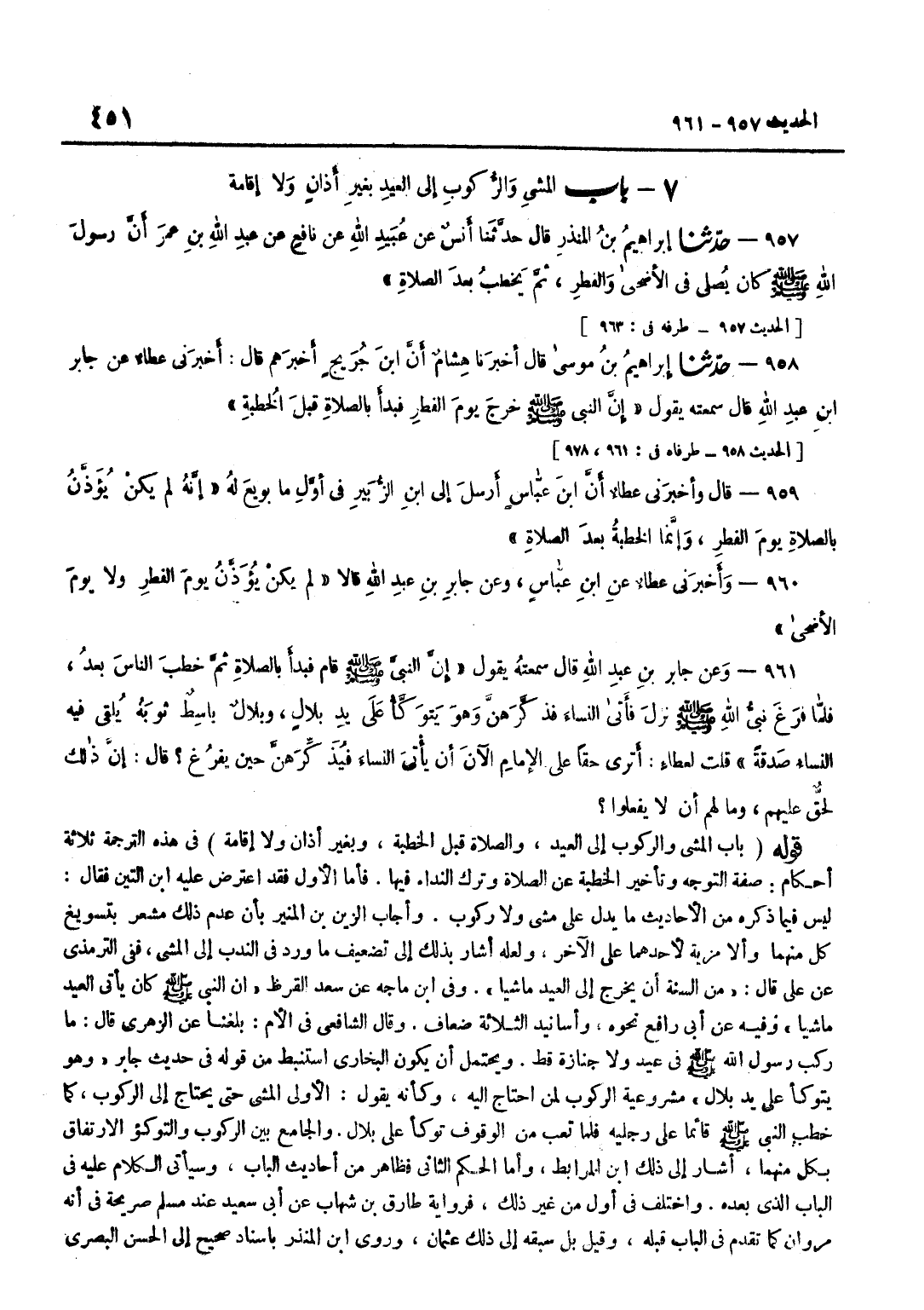فِي هَذِهِ التَّرْجَمَةِ ثَلَاثَةُ أَحْكَامٍ صِفَةُ التَّوَجُّهِ وَتَأْخِيرُ الْخُطْبَةِ عَنِ الصَّلَاةِ وَتَرْكُ النِّدَاءِ فِيهَا فَأَمَّا الأول فقد اعْترض عَلَيْهِ بن التِّينِ فَقَالَ لَيْسَ فِيمَا ذَكَرَهُ مِنَ الْأَحَادِيثِ مَا يَدُلُّ عَلَى مَشْيٍ وَلَا رُكُوبٍ وَأَجَابَ الزَّيْنُ بْنُ الْمُنِيرِ بِأَنَّ عَدَمَ ذَلِكَ مُشْعِرٌ بِتَسْوِيغِ كُلٍّ مِنْهُمَا وَأَلَّا مَزِيَّةَ لِأَحَدِهِمَا عَلَى الْآخَرِ وَلَعَلَّهُ أَشَارَ بِذَلِكَ إِلَى تَضْعِيفِ مَا وَرَدَ فِي النَّدْبِ إِلَى الْمَشْيِ فَفِي التِّرْمِذِيِّ عَنْ عَلِيٍّ قَالَ مِنَ السُّنَّةِ أَنْ يَخْرُجَ إِلَى الْعِيد مَاشِيا وَفِي بن مَاجَهْ عَنْ سَعْدِ الْقَرَظِ أَنَّ النَّبِيَّ صَلَّى اللَّهُ عَلَيْهِ وَسَلَّمَ كَانَ يَأْتِي الْعِيدَ مَاشِيًا وَفِيهِ عَنْ أَبِي رَافِعٍ نَحْوُهُ وَأَسَانِيدُ الثَّلَاثَةِ ضِعَافٌ وَقَالَ الشَّافِعِيُّ فِي الْأُمِّ بَلَغَنَا عَنِ الزُّهْرِيِّ قَالَ مَا رَكِبَ رَسُولُ اللَّهِ صَلَّى اللَّهُ عَلَيْهِ وَسَلَّمَ فِي عِيدٍ وَلَا جِنَازَةٍ قَطُّ وَيُحْتَمَلُ أَنْ يَكُونَ الْبُخَارِيُّ اسْتَنْبَطَ مِنْ قَوْلِهِ فِي حَدِيثِ جَابِرٍ وَهُوَ يَتَوَكَّأُ عَلَى يَدِ بِلَالٍ مَشْرُوعِيَّةَ الرُّكُوبِ لِمَنِ احْتَاجَ إِلَيْهِ وَكَأَنَّهُ يَقُولُ الْأَوْلَى الْمَشْيُ حَتَّى يَحْتَاجَ إِلَى الرُّكُوبِ كَمَا خَطَبَ النَّبِيُّ صَلَّى اللَّهُ عَلَيْهِ وَسَلَّمَ قَائِمًا عَلَى رِجْلَيْهِ فَلَمَّا تَعِبَ مِنَ الْوُقُوفِ تَوَكَّأَ عَلَى بِلَالٍ وَالْجَامِعُ بَيْنَ الرُّكُوبِ وَالتَّوَكُّؤِ الِارْتِفَاقُ بِكُلٍّ مِنْهُمَا أَشَارَ إِلَى ذَلِكَ بن الْمُرَابِطِ وَأَمَّا الْحُكْمُ الثَّانِي فَظَاهِرٌ مِنْ أَحَادِيثِ الْبَابِ وَسَيَأْتِي الْكَلَامُ عَلَيْهِ فِي الْبَابِ الَّذِي بَعْدَهُ وَاخْتُلِفَ فِي أَوَّلِ مَنْ غَيَّرَ ذَلِكَ فَرِوَايَةُ طَارِقِ بْنِ شِهَابٍ عَنْ أَبِي سَعِيدٍ عِنْدَ مُسْلِمٍ صَرِيحَةٌ فِي أَنَّهُ مَرْوَانُ كَمَا تَقَدَّمَ فِي الْبَابِ قَبْلَهُ وَقِيلَ بَلْ سَبَقَهُ إِلَى ذَلِك عُثْمَان وروى بن الْمُنْذِرِ بِإِسْنَادٍ صَحِيحٍ إِلَى الْحَسَنِ الْبَصْرِيِّ