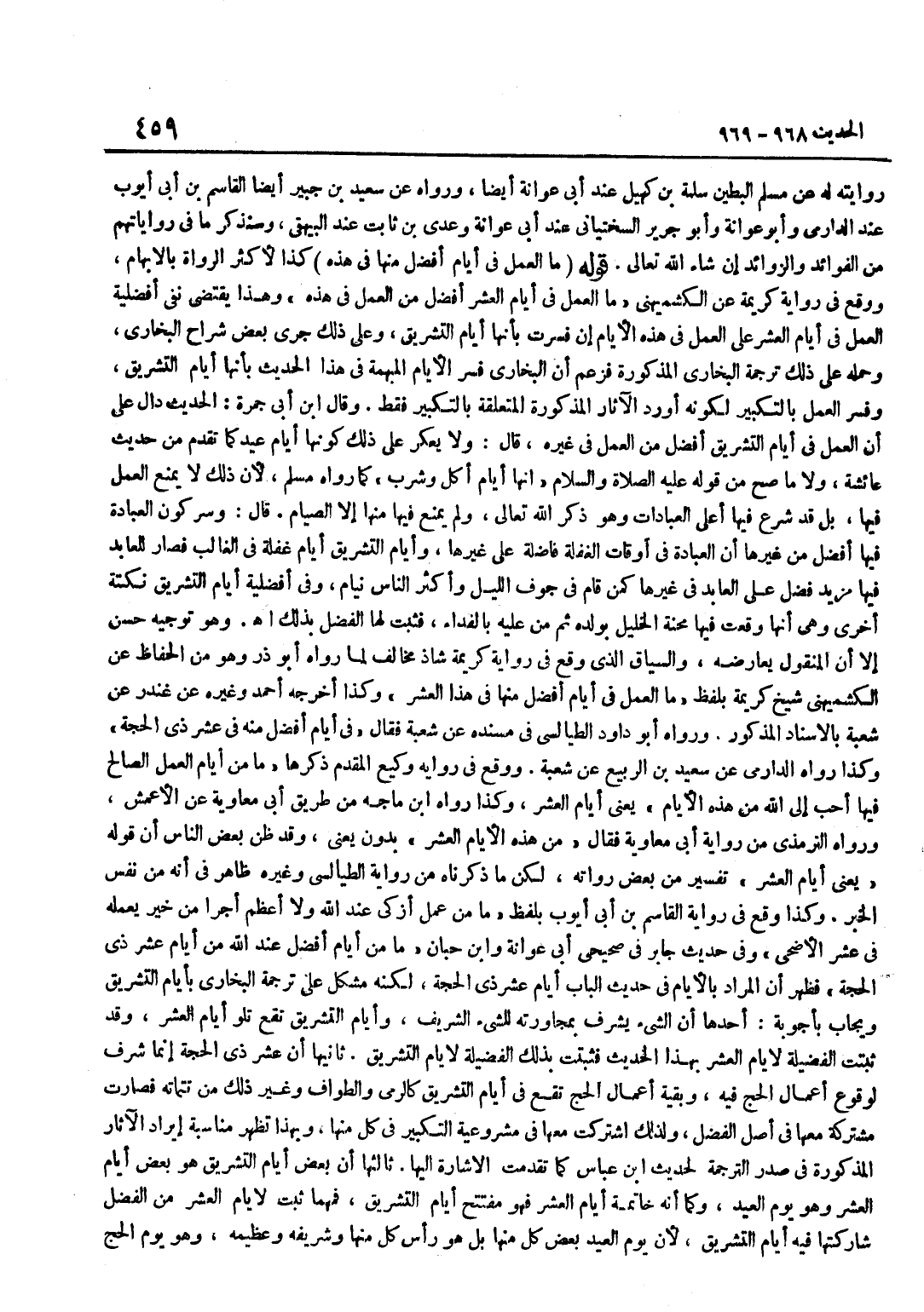 رِوَايَتِهِ لَهُ عَنْ مُسْلِمٍ الْبَطِينِ سَلَمَةَ بْنِ كُهَيْلٍ عِنْدَ أَبِي عَوَانَةَ أَيْضًا وَرَوَاهُ عَنْ سَعِيدِ بْنِ جُبَيْرٍ أَيْضًا الْقَاسِمُ بْنُ أَبِي أَيُّوبَ عِنْدَ الدَّارِمِيِّ وَأَبُو عَوَانَةَ وَأَبُو جَرِيرٍ السِّخْتِيَانِيُّ عِنْدَ أَبِي عَوَانَةَ وَعَدِيِّ بْنِ ثَابِتٍ عِنْدَ الْبَيْهَقِيِّ وَسَنَذْكُرُ مَا فِي رِوَايَاتِهِمْ مِنَ الْفَوَائِدِ وَالزَّوَائِدِ إِنْ شَاءَ اللَّهُ تَعَالَى قَوْلُهُ مَا الْعَمَلُ فِي أَيَّامٍ أَفْضَلَ مِنْهَا فِي هَذِهِ كَذَا لِأَكْثَرِ الرُّوَاةِ بِالْإِبْهَامِ وَوَقَعَ فِي رِوَايَةِ كَرِيمَةَ عَنِ الْكُشْمِيهَنِيِّ مَا الْعَمَلُ فِي أَيَّامِ الْعَشْرِ أَفْضَلَ مِنَ الْعَمَلِ فِي هَذِهِ وَهَذَا يَقْتَضِي نَفْيَ أَفْضَلِيَّةِ الْعَمَلِ فِي أَيَّامِ الْعَشْرِ عَلَى الْعَمَلِ فِي هَذِهِ الْأَيَّامِ إِنْ فُسِّرَتْ بِأَنَّهَا أَيَّامُ التَّشْرِيقِ وَعَلَى ذَلِكَ جَرَى بَعْضُ شُرَّاحِ الْبُخَارِيِّ وَحَمَلَهُ عَلَى ذَلِكَ تَرْجَمَةُ الْبُخَارِيِّ الْمَذْكُورَةُ فَزَعَمَ أَنَّ الْبُخَارِيَّ فَسَّرَ الْأَيَّامَ الْمُبْهَمَةَ فِي هَذَا الْحَدِيثِ بِأَنَّهَا أَيَّامُ التَّشْرِيقِ وَفَسَّرَ الْعَمَلَ بِالتَّكْبِيرِ لِكَوْنِهِ أَوْرَدَ الْآثَارَ الْمَذْكُورَةَ الْمُتَعَلّقَة بِالتَّكْبِيرِ فَقَط وَقَالَ بن أَبِي جَمْرَةَ الْحَدِيثُ دَالٌّ عَلَى أَنَّ الْعَمَلَ فِي أَيَّامِ التَّشْرِيقِ أَفْضَلُ مِنَ الْعَمَلِ فِي غَيْرِهِ قَالَ وَلَا يُعَكِّرُ عَلَى ذَلِكَ كَوْنُهَا أَيَّامَ عِيدٍ كَمَا تَقَدَّمَ مِنْ حَدِيثِ عَائِشَةَ وَلَا مَا صَحَّ مِنْ قَوْلِهِ عَلَيْهِ الصَّلَاةُ وَالسَّلَامُ أَنَّهَا أَيَّامُ أَكْلٍ وَشُرْبٍ كَمَا رَوَاهُ مُسْلِمٌ لِأَنَّ ذَلِكَ لَا يَمْنَعُ الْعَمَلَ فِيهَا بَلْ قَدْ شَرَعَ فِيهَا أَعْلَى الْعِبَادَاتِ وَهُوَ ذِكْرُ اللَّهِ تَعَالَى وَلَمْ يُمْنَعْ فِيهَا مِنْهَا إِلَّا الصِّيَامُ قَالَ وَسِرُّ كَوْنِ الْعِبَادَةِ فِيهَا أَفْضَلُ مِنْ غَيْرِهَا أَنَّ الْعِبَادَةَ فِي أَوْقَاتِ الْغَفْلَةِ فَاضِلَةٌ عَلَى غَيْرِهَا وَأَيَّامُ التَّشْرِيقِ أَيَّامُ غَفْلَةٍ فِي الْغَالِبِ فَصَارَ لِلْعَابِدِ فِيهَا مَزِيدُ فَضْلٍ عَلَى الْعَابِدِ فِي غَيْرِهَا كَمَنْ قَامَ فِي جَوْفِ اللَّيْلِ وَأَكْثَرُ النَّاسِ نِيَامٌ وَفِي أَفْضَلِيَّةِ أَيَّامِ التَّشْرِيقِ نُكْتَةٌ أُخْرَى وَهِيَ أَنَّهَا وَقَعَتْ فِيهَا مِحْنَةُ الْخَلِيلِ بِوَلَدِهِ ثُمَّ مُنَّ عَلَيْهِ بِالْفِدَاءِ فَثَبَتَ لَهَا الْفَضْلُ بِذَلِكَ اه وَهُوَ تَوْجِيهٌ حَسَنٌ إِلَّا أَنَّ الْمَنْقُولَ يُعَارِضُهُ وَالسِّيَاقُ الَّذِي وَقَعَ فِي رِوَايَةِ كَرِيمَةَ شَاذٌّ مُخَالِفٌ لِمَا رَوَاهُ أَبُو ذَرٍّ وَهُوَ مِنَ الْحُفَّاظِ عَنِ الْكُشْمِيهَنِيِّ شَيْخِ كَرِيمَةَ بِلَفْظِ مَا الْعَمَلُ فِي أَيَّامٍ أَفْضَلَ مِنْهَا فِي هَذَا الْعَشْرِ وَكَذَا أَخْرَجَهُ أَحْمَدُ وَغَيْرُهُ عَنْ غُنْدَرٍ عَنْ شُعْبَةَ بِالْإِسْنَادِ الْمَذْكُورِ وَرَوَاهُ أَبُو دَاوُدَ الطَّيَالِسِيُّ فِي مُسْنَدِهِ عَنْ شُعْبَةَ فَقَالَ فِي أَيَّامٍ أَفْضَلَ مِنْهُ فِي عَشْرِ ذِي الْحِجَّةِ وَكَذَا رَوَاهُ الدَّارِمِيُّ عَنْ سَعِيدِ بْنِ الرَّبِيعِ عَنْ شُعْبَةَ وَوَقَعَ فِي رِوَايَةِ وَكِيعٍ الْمُقَدَّمِ ذِكْرُهَا مَا مِنْ أَيَّامٍ الْعَمَلُ الصَّالِحُ فِيهَا أَحَبُّ إِلَى اللَّهِ مِنْ هَذِهِ الْأَيَّامِ يَعْنِي أَيَّام الْعشْر وَكَذَا رَوَاهُ بن مَاجَهْ مِنْ طَرِيقِ أَبِي مُعَاوِيَةَ عَنِ الْأَعْمَشِ وَرَوَاهُ التِّرْمِذِيّ من رِوَايَةِ أَبِي مُعَاوِيَةَ فَقَالَ مِنْ هَذِهِ الْأَيَّامِ الْعَشْرِ بِدُونِ يَعْنِي وَقَدْ ظَنَّ بَعْضُ النَّاسِ أَنَّ قَوْلَهُ ي