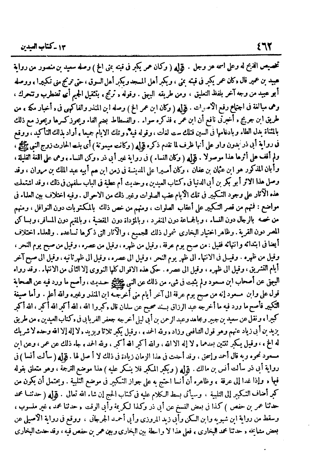 تَخْصِيصِ الذَّبْحِ لَهُ وَعَلَى اسْمِهِ عَزَّ وَجَلَّ قَوْلُهُ وَكَانَ عُمَرُ يُكَبِّرُ فِي قُبَّتِهِ بِمِنًى إِلَخْ وَصَلَهُ سَعِيدُ بْنُ مَنْصُورٍ مِنْ رِوَايَةِ عُبَيْدِ بْنِ عُمَيْرٍ قَالَ كَانَ عُمَرُ يُكَبِّرُ فِي قُبَّتِهِ بِمِنًى وَيُكَبِّرُ أَهْلُ الْمَسْجِدِ وَيُكَبِّرُ أَهْلُ السُّوقِ حَتَّى تَرْتَجَّ مِنًى تَكْبِيرًا وَوَصَلَهُ أَبُو عُبَيْدٍ مِنْ وَجْهٍ آخَرَ بِلَفْظِ التَّعْلِيقِ وَمِنْ طَرِيقِهِ الْبَيْهَقِيُّ وَقَوْلُهُ تَرْتَجُّ بِتَثْقِيلِ الْجِيمِ أَيْ تَضْطَرِبُ وَتَتَحَرَّكُ وَهِيَ مُبَالَغَةٌ فِي اجْتِمَاعِ رفع الْأَصْوَات قَوْله وَكَانَ بن عمر الخ وَصله بن الْمُنْذِرِ وَالْفَاكِهِيُّ فِي أَخْبَارِ مَكَّةَ مِنْ طَرِيقِ بن جريج أَخْبرنِي نَافِع أَن بن عُمَرَ فَذِكْرُهُ سَوَاءٌ وَالْفُسْطَاطُ بِضَمِّ الْفَاءِ وَيَجُوزُ كسرهَا وَيجوز مَعَ ذَلِكَ بِالْمُثَنَّاةِ بَدَلَ الطَّاءِ وَبِإِدْغَامِهَا فِي السِّينِ فَتِلْكَ سِتُّ لُغَاتٍ وَقَوْلُهُ فِيهِ وَتِلْكَ الْأَيَّامُ جَمِيعًا أَرَادَ بِذَلِكَ التَّأْكِيدَ وَوَقَعَ فِي رِوَايَةِ أَبِي ذَرٍّ بِدُونِ وَاوٍ عَلَى أَنَّهَا ظَرْفٌ لِمَا تَقَدَّمَ ذِكْرُهُ قَوْلُهُ وَكَانَتْ مَيْمُونَةُ أَيْ بِنْتُ الْحَارِثِ زَوْجُ النَّبِيِّ صَلَّى اللَّهُ عَلَيْهِ وَسَلَّمَ وَلَمْ أَقِفْ عَلَى أَثَرِهَا هَذَا مَوْصُولًا قَوْلُهُ وَكَانَ النِّسَاءُ فِي رِوَايَةِ غَيْرِ أَبِي ذَرٍّ وَكُنَّ النِّسَاءُ وَهِيَ عَلَى اللُّغَةِ الْقَلِيلَةِ وَأَبَان الْمَذْكُور هُوَ بن عُثْمَانَ بْنِ عَفَّانَ وَكَانَ أَمِيرًا عَلَى الْمَدِينَةِ فى زمن بن عَمِّ أَبِيهِ عَبْدِ الْمَلِكِ بْنِ مَرْوَانَ وَقَدْ وَصَلَ هَذَا الْأَثَرَ أَبُو بَكْرِ بْنُ أَبِي الدُّنْيَا فِي كِتَابِ الْعِيدَيْنِ وَحَدِيثُ أُمِّ عَطِيَّةَ فِي الْبَابِ سَلَفُهُنَّ فِي ذَلِكَ وَقَدِ اشْتَمَلَتْ هَذِهِ الْآثَارُ عَلَى وُجُودِ التَّكْبِيرِ فِي تِلْكَ الْأَيَّامِ عَقِبَ الصَّلَوَاتِ وَغَيْرِ ذَلِكَ مِنَ الْأَحْوَالِ وَفِيهِ اخْتِلَافٌ بَيْنَ الْعُلَمَاءِ فِي مَوَاضِعَ فَمِنْهُمْ مَنْ قَصَرَ التَّكْبِيرَ عَلَى أَعْقَابِ الصَّلَوَاتِ وَمِنْهُمْ مَنْ خَصَّ ذَلِكَ بِالْمَكْتُوبَاتِ دُونَ النَّوَافِلِ وَمِنْهُمْ مَنْ خَصَّهُ بِالرِّجَالِ دُونَ النِّسَاءِ وَبِالْجَمَاعَةِ دُونَ الْمُنْفَرِدِ وَبِالْمُؤَدَّاةِ دُونَ الْمَقْضِيَّةِ وَبِالْمُقِيمِ دُونَ الْمُسَافِرِ وَبِسَاكِنِ الْمِصْرِ دُونَ الْقَرْيَةِ وَظَاهِرُ اخْتِيَارِ الْبُخَارِيِّ شُمُولُ ذَلِكَ لِلْجَمِيعِ وَالْآثَارُ الَّتِي ذَكَرَهَا تُسَاعِدُهُ وَلِلْعُلَمَاءِ اخْتِلَافٌ أَيْضًا فِي ابْتِدَائِهِ وَانْتِهَائِهِ فَقِيلَ مِنْ صُبْحِ يَوْمِ عَرَفَةَ وَقِيلَ مِنْ ظُهْرِهِ وَقِيلَ مِنْ عَصْرِهِ وَقِيلَ مِنْ صُبْحِ يَوْمِ النَّحْرِ وَقِيلَ مِنْ ظُهْرِهِ وَقِيلَ فِي الِانْتِهَاءِ إِلَى ظُهْرِ يَوْمِ النَّحْرِ وَقِيلَ إِلَى عَصْرِهِ وَقِيلَ إِلَى ظُهْرِ ثَانِيهِ وَقِيلَ إِلَى صُبْحِ آخِرِ أَيَّامِ التَّشْرِيقِ وَقِيلَ إِلَى ظُهْرِهِ وَقِيلَ إِلَى عَصْرِهِ حَكَى هَذِهِ الْأَقْوَالَ كُلَّهَا النَّوَوِيُّ إِلَّا الثَّانِيَ مِنَ الِانْتِهَاءِ وَقَدْ رَوَاهُ الْبَيْهَقِيُّ عَن أَصْحَاب بن مَسْعُودٍ وَلَمْ يَثْبُتْ فِي شَيْءٍ مِنْ ذَلِكَ عَنِ النَّبِيِّ صَلَّى اللَّهُ عَلَيْهِ وَسَلَّمَ حَدِيثٌ وَأَصَحُّ مَا وَرَدَ فِيهِ عَنِ الصَّحَابَةِ قَوْلُ على وبن مَسْعُود إِنَّه من صبح يَوْم عَرَفَة إِلَى آخر أَيَّام منى أخرجه بن الْمُنْذِرِ وَغَيْرُهُ وَاللَّهُ أَعْلَمُ وَأَمَّا صِيغَةُ التَّكْبِيرِ فَأَصَحُّ مَا وَرَدَ فِيهِ مَا أَخْرَجَهُ عَبْدُ الرَّزَّاقِ بِسَنَدٍ صَحِيحٍ عَنْ سَلْمَانَ قَالَ كَبِّرُوا الل