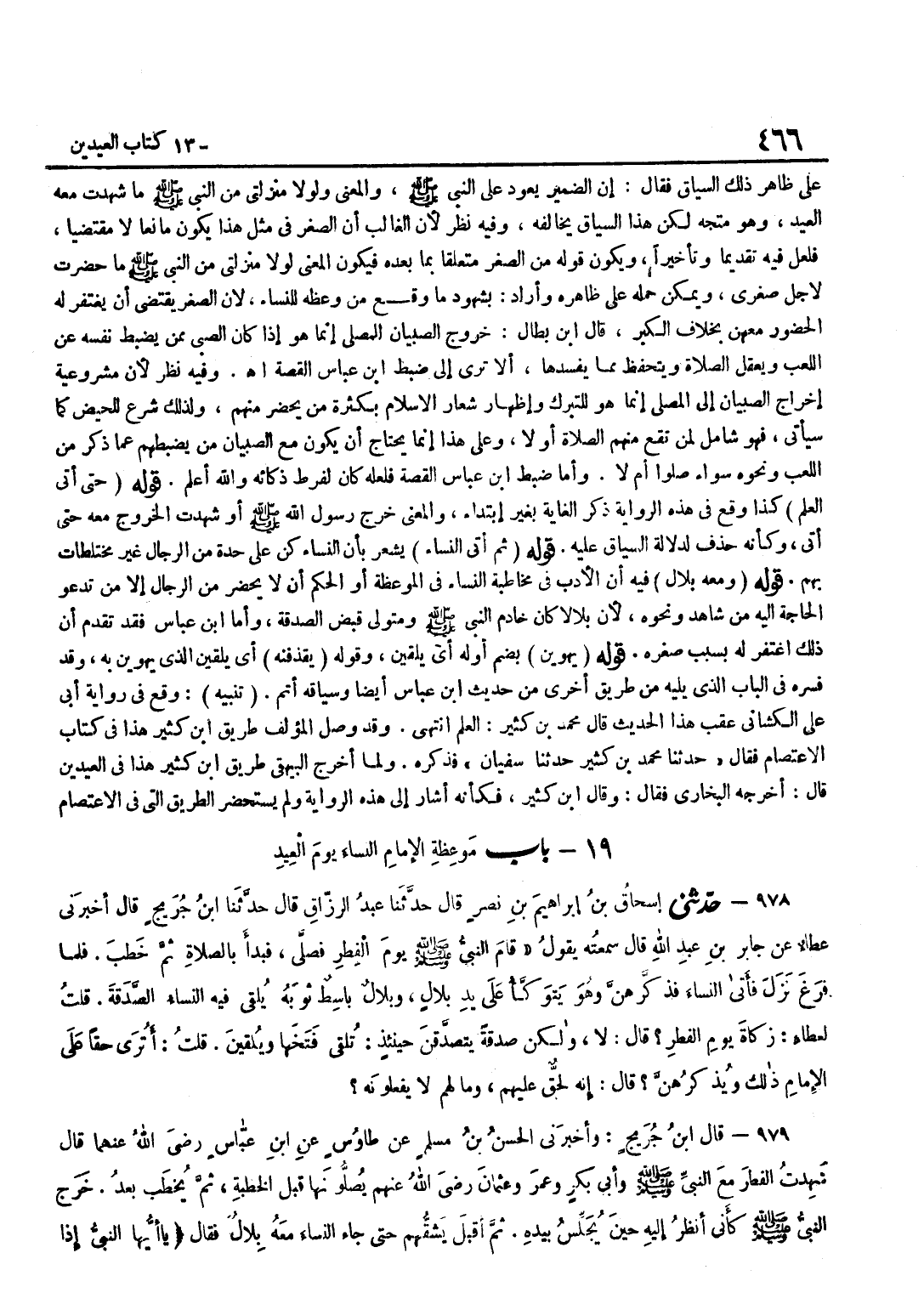[977] قَوْلُهُ حَتَّى أَتَى الْعَلَمَ كَذَا وَقَعَ فِي هَذِهِ الرِّوَايَةِ ذِكْرُ الْغَايَةِ بِغَيْرِ ابْتِدَاءٍ وَالْمَعْنَى خَرَجَ رَسُولِ اللَّهِ صَلَّى اللَّهُ عَلَيْهِ وَسَلَّمَ أَوْ شَهِدْتُ الْخُرُوجَ مَعَهُ حَتَّى أَتَى وَكَأَنَّهُ حُذِفَ لِدَلَالَةِ السِّيَاقِ عَلَيْهِ قَوْلُهُ ثُمَّ أَتَى النِّسَاءَ يُشْعِرُ بِأَنَّ النِّسَاءَ كُنَّ عَلَى حِدَةٍ مِنَ الرِّجَالِ غَيْرَ مُخْتَلِطَاتٍ بِهِمْ قَوْلُهُ وَمَعَهُ بِلَالٌ فِيهِ أَنَّ الْأَدَبَ فِي مُخَاطَبَةِ النِّسَاءِ فِي الْمَوْعِظَةِ أَوِ الْحِكَمِ أَنْ لَا يَحْضُرَ مِنَ الرِّجَالِ إِلَّا مَنْ تَدْعُو الْحَاجَةُ إِلَيْهِ مِنْ شَاهِدٍ وَنَحْوِهِ لِأَنَّ بِلَالًا كَانَ خَادِمَ النَّبِيِّ صَلَّى اللَّهُ عَلَيْهِ وَسَلَّمَ وَمُتَوَلِّيَ قبض الصَّدَقَة وَأما بن عَبَّاسٍ فَقَدْ تَقَدَّمَ أَنَّ ذَلِكَ اغْتُفِرَ لَهُ بِسَبَبِ صِغَرِهِ قَوْلُهُ يُهْوِينَ بِضَمِّ أَوَّلِهِ أَيْ يُلْقِينَ وَقَوْلُهُ يَقْذِفْنَهُ أَيْ يُلْقِينَ الَّذِي يُهْوِينَ بِهِ وَقَدْ فَسَّرَهُ فِي الْبَابِ الَّذِي يَلِيهِ من طَرِيق أُخْرَى من حَدِيث بن عَبَّاسٍ أَيْضًا وَسِيَاقُهُ أَتَمُّ تَنْبِيهٌ وَقَعَ فِي رِوَايَةِ أَبِي عَلِيٍّ الْكَشَانِيِّ عَقِبَ هَذَا الْحَدِيثِ قَالَ مُحَمَّدُ بْنُ كَثِيرٍ الْعَلَمُ انْتَهَى وَقَدْ وصل الْمُؤلف طَرِيق بن كَثِيرٍ هَذَا فِي كِتَابِ الِاعْتِصَامِ فَقَالَ حَدَّثَنَا مُحَمَّدُ بْنُ كَثِيرٍ حَدَّثَنَا سُفْيَانُ فَذَكَرَهُ وَلَمَّا أخرج الْبَيْهَقِيّ طَرِيق بن كَثِيرٍ هَذَا فِي الْعِيدَيْنِ قَالَ أَخْرَجَهُ الْبُخَارِيُّ فَقَالَ وَقَالَ بن كَثِيرٍ فَكَأَنَّهُ أَشَارَ إِلَى هَذِهِ الرِّوَايَةِ وَلَمْ يستحضر الطَّرِيق الَّتِي فِي الِاعْتِصَام