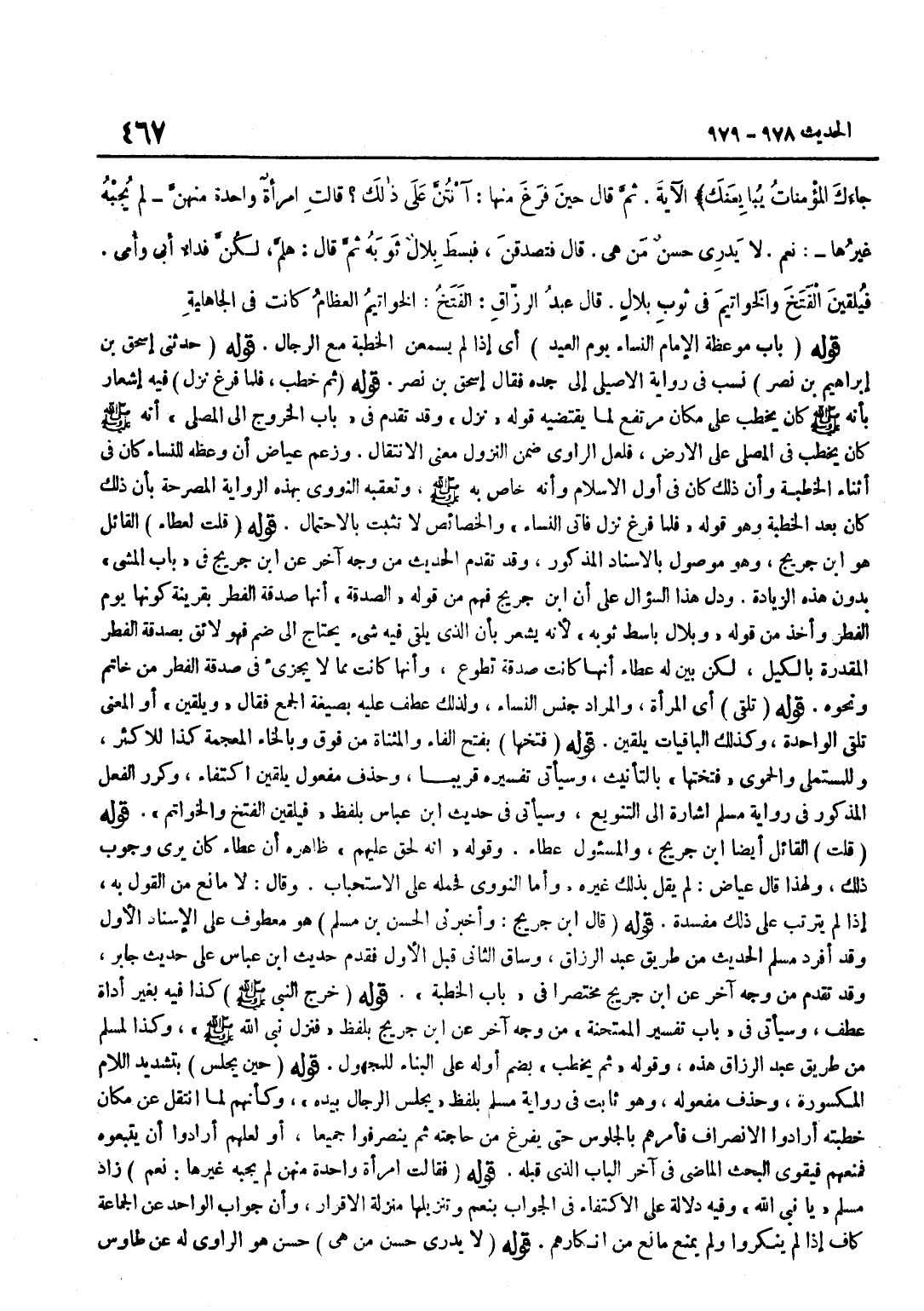 [978] قَوْلُهُ حَدَّثَنِي إِسْحَاقُ بْنُ إِبْرَاهِيمَ بْنِ نَصْرٍ نُسِبَ فِي رِوَايَةِ الْأَصِيلِيِّ إِلَى جَدِّهِ فَقَالَ إِسْحَاقُ بْنُ نَصْرٍ قَوْلُهُ ثُمَّ خَطَبَ فَلَمَّا فَرَغَ نَزَلَ فِيهِ إِشْعَارٌ بِأَنَّهُ صَلَّى اللَّهُ عَلَيْهِ وَسَلَّمَ كَانَ يَخْطُبُ عَلَى مَكَانٍ مُرْتَفِعٍ لِمَا يَقْتَضِيهِ قَوْلُهُ نَزَلَ وَقَدْ تَقَدَّمَ فِي بَابِ الْخُرُوجِ إِلَى الْمُصَلَّى أَنَّهُ صَلَّى اللَّهُ عَلَيْهِ وَسَلَّمَ كَانَ يَخْطُبُ فِي الْمُصَلَّى عَلَى الْأَرْضِ فَلَعَلَّ الرَّاوِيَ ضَمَّنَ النُّزُولَ مَعْنَى الِانْتِقَالِ وَزَعَمَ عِيَاضٌ أَنَّ وَعْظَهُ لِلنِّسَاءِ كَانَ فِي أَثْنَاءِ الْخُطْبَةِ وَأَنَّ ذَلِكَ كَانَ فِي أَوَّلِ الْإِسْلَامِ وَأَنَّهُ خَاصٌّ بِهِ صَلَّى اللَّهُ عَلَيْهِ وَسلم وَتعقبه النَّوَوِيّ بِهَذِهِ الرِّوَايَة الْمُصَرِّحَةِ بِأَنَّ ذَلِكَ كَانَ بَعْدَ الْخُطْبَةِ وَهُوَ قَوْلُهُ فَلَمَّا فَرَغَ نَزَلَ فَأَتَى النِّسَاءَ وَالْخَصَائِصُ لَا تَثْبُتُ بِالِاحْتِمَالِ قَوْلُهُ قُلْتُ لِعَطَاءٍ الْقَائِلُ هُوَ بن جُرَيْجٍ وَهُوَ مَوْصُولٌ بِالْإِسْنَادِ الْمَذْكُورِ وَقَدْ تَقَدَّمَ الحَدِيث من وَجه آخر عَن بن جُرَيْجٍ فِي بَابِ الْمَشْيِ بِدُونِ هَذِهِ الزِّيَادَةِ وَدلّ هَذَا السُّؤَال على أَن بن جُرَيْجٍ فَهِمَ مِنْ قَوْلِهِ الصَّدَقَةَ أَنَّهَا صَدَقَةُ الْفِطْرِ بِقَرِينَةِ كَوْنِهَا يَوْمَ الْفِطْرِ وَأُخِذَ مِنْ قَوْلِهِ وَبِلَالٌ بَاسِطٌ ثَوْبَهُ لِأَنَّهُ يُشْعِرُ بِأَنَّ الَّذِي يلقى فِيهِ شَيْء يَحْتَاجُ إِلَى ضَمٍّ فَهُوَ لَائِقٌ بِصَدَقَةِ الْفِطْرِ الْمُقَدَّرَةِ بِالْكَيْلِ لَكِنْ بَيَّنَ لَهُ عَطَاءٌ أَنَّهَا كَانَتْ صَدَقَةَ تَطَوُّعٍ وَأَنَّهَا كَانَتْ مِمَّا لَا يُجْزِئُ فِي صَدَقَةِ الْفِطْرِ مِنْ خَاتَمٍ وَنَحْوِهِ قَوْلُهُ تُلْقِي أَيِ الْمَرْأَةُ وَالْمُرَادُ جِنْسُ النِّسَاءِ وَلِذَلِكَ عُطِفَ عَلَيْهِ بِصِيغَةِ الْجَمْعِ فَقَالَ وَيُلْقِينَ أَوِ الْمَعْنَى تُلْقِي الْوَاحِدَةُ وَكَذَلِكَ الْبَاقِيَاتُ يُلْقِينَ قَوْلُهُ فَتَخَهَا بِفَتْحِ الْفَاءِ وَالْمُثَنَّاةِ مِنْ فَوْقٍ وَبِالْخَاءِ الْمُعْجَمَةِ كَذَا لِلْأَكْثَرِ وَلِلْمُسْتَمْلِي وَالْحَمَوِيِّ فَتَخَتْهَا بِالتَّأْنِيثِ وَسَيَأْتِي تَفْسِيرُهُ قَرِيبًا وَحُذِفَ مَفْعُولُ يُلْقِينَ اكْتِفَاءً وَكُرِّرَ الْفِعْلُ الْمَذْكُورُ فِي رِوَايَةِ مُسْلِمٍ إِشَارَة إِلَى التنويع وَسَيَأْتِي فِي حَدِيث بن عَبَّاسٍ بِلَفْظِ فَيُلْقِينَ الْفَتَخَ وَالْخَوَاتِمَ قَوْلُهُ قُلْتُ الْقَائِل أَيْضا بن جُرَيْجٍ وَالْمَسْئُولُ عَطَاءٌ وَقَوْلُهُ أَنَّهُ لِحَقٍّ عَلَيْهِمْ ظَاهِرُهُ أَنَّ عَطَاءً كَانَ يَرَى وُجُوبَ ذَلِكَ وَلِهَذَا قَالَ عِيَاضٌ لَمْ يَقُلْ بِذَلِكَ غَيْرُهُ وَأَمَّا النَّوَوِيُّ فَحَمَلَهُ عَلَى الِاسْتِحْبَابِ وَقَالَ لَا مَانِعَ مِنَ الْقَوْلِ بِهِ إِذَا لَمْ يَتَرَتَّبْ على ذَلِك مفْسدَة