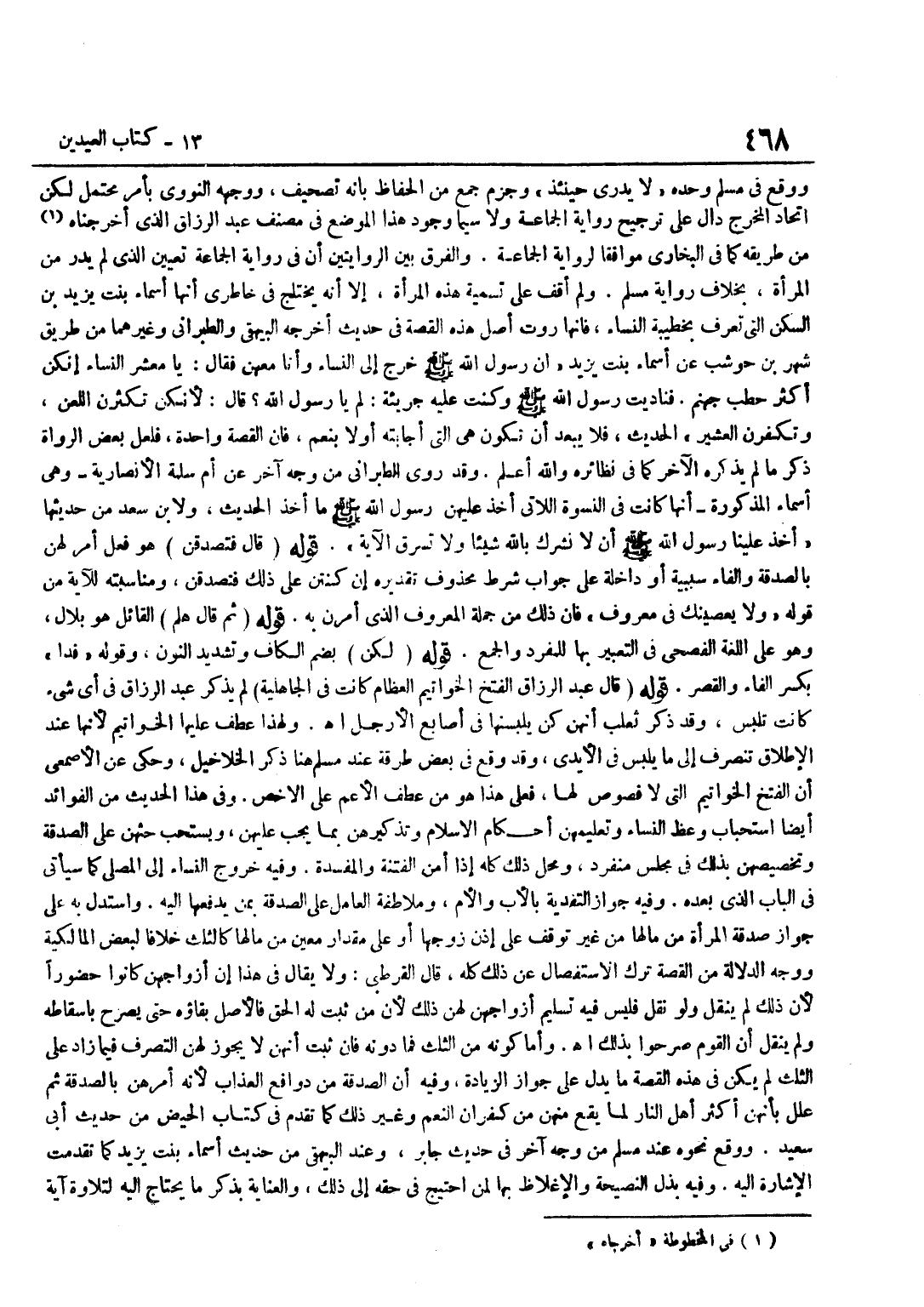 وَوَقَعَ فِي مُسْلِمٍ وَحْدَهُ لَا يَدْرِي حِينَئِذٍ وَجَزَمَ جَمْعٌ مِنَ الْحُفَّاظِ بِأَنَّهُ تَصْحِيفٌ وَوَجَّهَهُ النَّوَوِيُّ بِأَمْرٍ مُحْتَمَلٍ لَكِنَّ اتِّحَادَ الْمَخْرَجِ دَالٌّ عَلَى تَرْجِيحِ رِوَايَةِ الْجَمَاعَةِ وَلَا سِيَّمَا وُجُودُ هَذَا الْمَوْضِعِ فِي مُصَنَّفِ عَبْدِ الرَّزَّاقِ الَّذِي أخرجناه من طَرِيقه كَمَا فِي الْبُخَارِيِّ مُوَافِقًا لِرِوَايَةِ الْجَمَاعَةِ وَالْفَرْقُ بَيْنَ الرِّوَايَتَيْنِ أَنَّ فِي رِوَايَةِ الْجَمَاعَةِ تَعْيِينَ الَّذِي لَمْ يَدْرِ مَنِ الْمَرْأَةُ بِخِلَافِ رِوَايَةِ مُسْلِمٍ وَلَمْ أَقِفْ عَلَى تَسْمِيَةِ هَذِهِ الْمَرْأَةِ إِلَّا أَنَّهُ يَخْتَلِجُ فِي خَاطِرِي أَنَّهَا أَسْمَاءُ بِنْتُ يَزِيدَ بْنِ السَّكَنِ الَّتِي تُعْرَفُ بِخَطِيبَةِ النِّسَاءِ فَإِنَّهَا رَوَتْ أَصْلَ هَذِهِ الْقِصَّةِ فِي حَدِيثٍ أَخْرَجَهُ الْبَيْهَقِيُّ وَالطَّبَرَانِيُّ وَغَيْرُهُمَا مِنْ طَرِيقِ شَهْرِ بْنِ حَوْشَبٍ عَنْ أَسْمَاءَ بِنْتِ يَزِيدَ أَنَّ رَسُولَ اللَّهِ صَلَّى اللَّهُ عَلَيْهِ وَسَلَّمَ خَرَجَ إِلَى النِّسَاءِ وَأَنَا مَعَهُنَّ فَقَالَ يَا مَعْشَرَ النِّسَاءِ إِنَّكُنَّ أَكْثَرَ حَطَبِ جَهَنَّمَ فَنَادَيْتُ رَسُولَ اللَّهِ صَلَّى اللَّهُ عَلَيْهِ وَسَلَّمَ وَكُنْتُ عَلَيْهِ جَرِيئَةً لِمَ يَا رَسُولَ اللَّهِ قَالَ لِأَنَّكُنَّ تُكْثِرْنَ اللَّعْنَ وَتَكْفُرْنَ الْعَشِيرَ الْحَدِيثَ فَلَا يَبْعُدُ أَنْ تَكُونَ هِيَ الَّتِي أَجَابَتْهُ أَوَّلًا بِنَعَمْ فَإِنَّ الْقِصَّةَ وَاحِدَةٌ فَلَعَلَّ بَعْضَ الرُّوَاةِ ذَكَرَ مَا لَمْ يَذْكُرْهُ الْآخَرُ كَمَا فِي نَظَائِرِهِ وَاللَّهُ أَعْلَمُ وَقَدْ رَوَى الطَّبَرَانِيُّ مِنْ وَجْهٍ آخَرَ عَنْ أُمِّ سَلَمَةَ الْأَنْصَارِيَّةِ وَهِيَ أَسْمَاءُ الْمَذْكُورَةُ أَنَّهَا كَانَتْ فِي النِّسْوَةِ اللَّاتِي أَخَذَ عَلَيْهِنَّ رَسُولُ اللَّهِ صَلَّى اللَّهُ عَلَيْهِ وَسَلَّمَ مَا أَخَذَ الْحَدِيثَ وَلِابْنِ سَعْدٍ مِنْ حَدِيثِهَا أَخَذَ عَلَيْنَا رَسُولَ اللَّهِ صَلَّى اللَّهُ عَلَيْهِ وَسَلَّمَ أَنْ لَا نُشْرِكَ بِاللَّهِ شَيْئًا وَلَا نَسْرِقَ الْآيَة قَوْلُهُ قَالَ فَتَصَدَّقْنَ هُوَ فِعْلُ أَمْرٍ لَهُنَّ بِالصَّدَقَةِ وَالْفَاءُ سَبَبِيَّةٌ أَوْ دَاخِلَةٌ عَلَى جَوَابِ شَرْطٍ مَحْذُوفٍ تَقْدِيرُهُ إِنْ كُنْتُنَّ عَلَى ذَلِكَ فَتَصَدَّقْنَ وَمُنَاسَبَتُهُ لِلْآيَةِ مِنْ قَوْلِهِ وَلَا يَعْصِينَكَ فِي مَعْرُوف فَإِنَّ ذَلِكَ مِنْ جُمْلَةِ الْمَعْرُوفِ الَّذِي أُمِرْنَ بِهِ قَوْلُهُ ثُمَّ قَالَ هَلُمَّ الْقَائِلُ هُوَ بِلَالٌ وَهُوَ عَلَى اللُّغَةِ الْفُصْحَى فِي التَّعْبِيرِ بِهَا لِلْمُفْرَدِ وَالْجَمْعِ قَوْلُهُ لَكُنَّ بِضَمِّ الْكَافِ وَتَشْدِيدِ النُّونِ وَقَوْلُهُ فِدَا بِكَسْرِ الْفَاءِ وَالْقَصْرِ قَوْلُهُ قَالَ عَبْدُ الرَّزَّاقِ الْفَتَخُ الْخَوَاتِيمُ الْعِظَامُ كَانَتْ فِي الْجَاهِلِيَّةِ لَمْ يَذْكُرْ عَبْدُ الرَّزَّاقِ فِي أَيِّ شَيْءٍ كَانَتْ تُلْبَسُ وَقَدْ ذَكَرَ ثَعْلَب أَنَّهُنَّ كن يَلْبَسْنَهَا فِي أَصَابِعِ الْأَرْجُلِ اه وَلِهَذَا عَطَفَ عَلَيْهَا الْخَوَاتِيمَ لِأَنَّهَا عِنْدَ الْإِطْلَاقِ تَنْصَرِفُ إِلَى مَا يُلْبَسُ فِي الْأَيْدِي وَقَدْ وَقَعَ فِي بَعْضِ طُرُقِهِ عِنْدَ مُسْلِمٍ هُنَا ذِكْرُ الْخَلَاخِيلِ وَحُكِيَ عَنِ الْأَصْمَعِيِّ أَنَّ الْفَتَخَ الْخَوَاتِيمُ الَّتِي لَا فُصُوصَ لَهَا فَعَلَى هَذَا هُوَ مِنْ عَطْفِ الْأَعَمِّ عَلَى الْأَخَصِّ وَفِي هَذَا الْحَدِيثِ مِنَ الْفَوَائِدِ أَيْضًا اسْتِحْبَابُ وَعْظِ النِّسَاءِ وَتَعْلِيمِهِنَّ أَحْكَامَ الْإِسْلَامِ وَتَذْكِيرِهِنَّ بِمَا يَجِبُ عَلَيْهِنَّ وَيُسْتَحَبُّ حَ