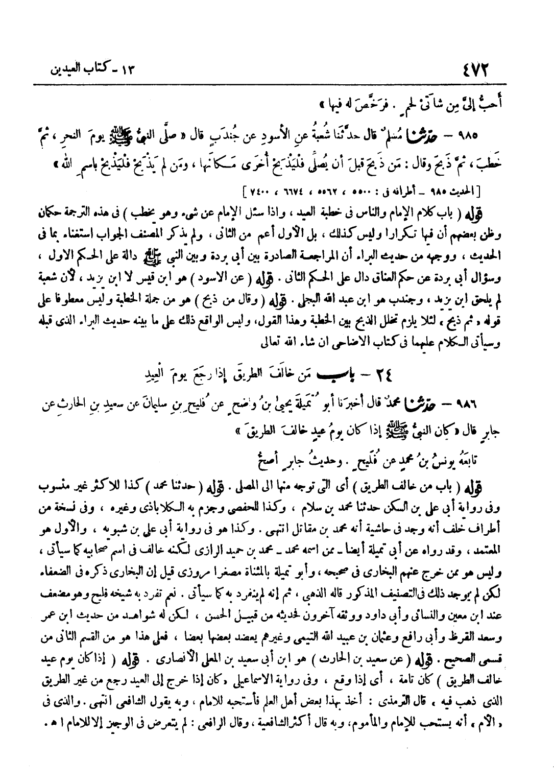 [986] قَوْلُهُ عَنْ سَعِيدِ بْنِ الْحَارِثِ هُوَ بن أَبِي سَعِيدِ بْنِ الْمُعَلَّى الْأَنْصَارِيُّ قَوْلُهُ إِذَا كَانَ يَوْمُ عِيدٍ خَالَفَ الطَّرِيقَ كَانَ تَامَّةٌ أَيْ إِذَا وَقَعَ وَفِي رِوَايَةِ الْإِسْمَاعِيلِيِّ كَانَ إِذَا خَرَجَ إِلَى الْعِيدِ رَجَعَ مِنْ غَيْرِ الطَّرِيقِ الَّذِي ذَهَبَ فِيهِ قَالَ التِّرْمِذِيُّ أَخَذَ بِهَذَا بَعْضُ أَهْلِ الْعِلْمِ فَاسْتَحَبَّهُ لِلْإِمَامِ وَبِهِ يَقُولُ الشَّافِعِيُّ انْتَهَى وَالَّذِي فِي الْأُمِّ أَنَّهُ يُسْتَحَبُّ لِلْإِمَامِ وَالْمَأْمُومِ وَبِهِ قَالَ أَكْثَرُ الشَّافِعِيَّةِ وَقَالَ الرَّافِعِيّ لم يتَعَرَّض فىالوجيز إِلَّا لِلْإِمَامِ اه