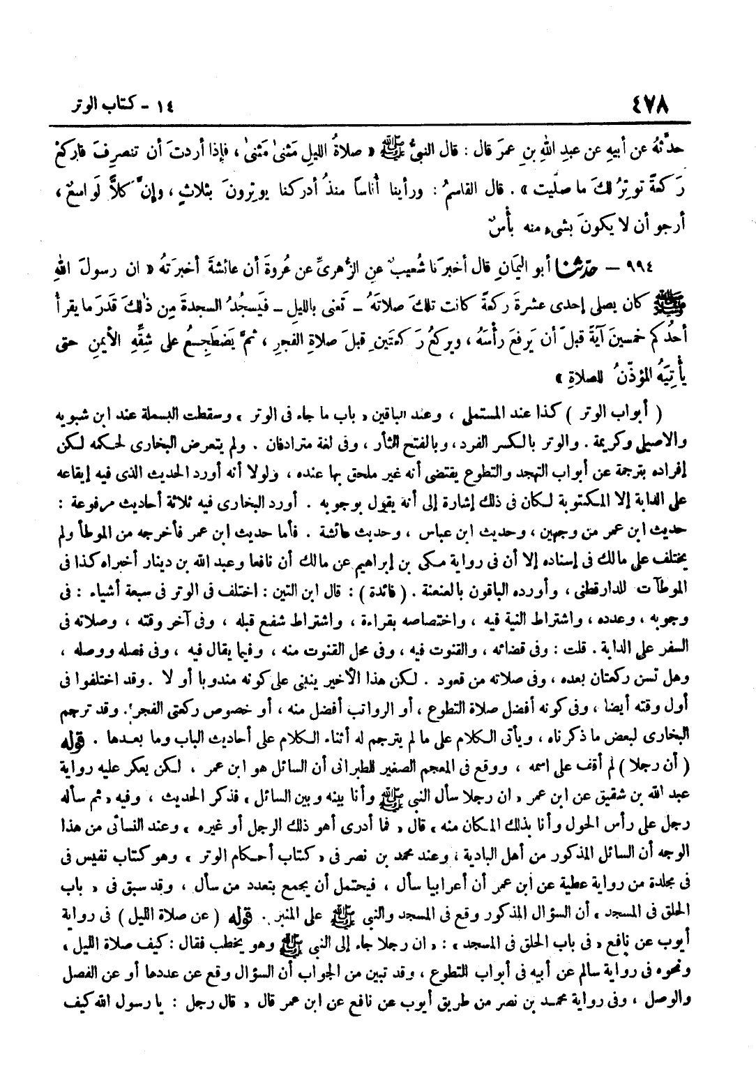 أَبْوَاب الْوتر كَذَا عِنْد الْمُسْتَمْلِي وَعند الْبَاقِينَ بَابُ مَا جَاءَ فِي الْوِتْرِ وَسَقَطَتِ الْبَسْمَلَة عِنْد بن شَبُّوَيْهِ وَالْأَصِيلِيِّ وَكَرِيمَةَ وَالْوِتْرُ بِالْكَسْرِ الْفَرْدُ وَبِالْفَتْحِ للثأر وَفِي لُغَةٍ مُتَرَادِفَانِ وَلَمْ يَتَعَرَّضِ الْبُخَارِيُّ لِحُكْمِهِ لَكِنْ إِفْرَادُهُ بِتَرْجَمَةٍ عَنْ أَبْوَابِ التَّهَجُّدِ وَالتَّطَوُّعِ يَقْتَضِي أَنَّهُ غَيْرُ مُلْحَقٍ بِهَا عِنْدَهُ وَلَوْلَا أَنَّهُ أَوْرَدَ الْحَدِيثَ الَّذِي فِيهِ إِيقَاعُهُ عَلَى الدَّابَّةِ إِلَّا الْمَكْتُوبَةَ لَكَانَ فِي ذَلِكَ إِشَارَةٌ إِلَى أَنَّهُ يَقُولُ بِوُجُوبِهِ أَوْرَدَ الْبُخَارِيُّ فِيهِ ثَلَاثَة أَحَادِيث مَرْفُوعَة حَدِيث بن عمر من وَجْهَيْن وَحَدِيث بن عَبَّاس وَحَدِيث عَائِشَة فَأَما حَدِيث بن عُمَرَ فَأَخْرَجَهُ مِنَ الْمُوَطَّأِ وَلَمْ يَخْتَلِفْ عَلَى مَالِكٍ فِي إِسْنَادِهِ إِلَّا أَنَّ فِي رِوَايَةِ مَكِّيِّ بْنِ إِبْرَاهِيمَ عَنْ مَالِكٍ أَنَّ نَافِعًا وَعَبْدَ اللَّهِ بْنَ دِينَارٍ أَخْبَرَاهُ كَذَا فِي الْمُوَطَّآتِ لِلدَّارَقُطْنِيِّ وَأَوْرَدَهُ الْبَاقُونَ بِالْعَنْعَنَةِ فَائِدَةٌ قَالَ بن التِّينِ اخْتُلِفَ فِي الْوِتْرِ فِي سَبْعَةِ أَشْيَاءَ فِي وُجُوبه وعدده وَاشْتِرَاط النِّيَّة فِيهِ واختصاصه بِقِرَاءَةٍ وَاشْتِرَاطِ شَفْعٍ قَبْلَهُ وَفِي آخِرِ وَقْتِهِ وَصَلَاتِهِ فِي السَّفَرِ عَلَى الدَّابَّةِ قُلْتُ وَفِي قَضَائِهِ وَالْقُنُوتِ فِيهِ وَفِي مَحَلِّ الْقُنُوتِ مِنْهُ وَفِيمَا يُقَالُ فِيهِ وَفِي فَصْلِهِ وَوَصْلِهِ وَهَلْ تُسَنُّ رَكْعَتَانِ بَعْدَهُ وَفِي صَلَاتِهِ مِنْ قُعُودٍ لَكِنْ هَذَا الْأَخِيرُ يَنْبَنِي عَلَى كَوْنِهِ مَنْدُوبًا أَوْ لَا وَقَدِ اخْتَلَفُوا فِي أَوَّلِ وَقْتِهِ أَيْضًا وَفِي كَوْنِهِ أَفْضَلَ صَلَاةِ التَّطَوُّعِ أَوِ الرَّوَاتِبِ أَفْضَلَ مِنْهُ أَوْ خُصُوصِ رَكْعَتَيِ الْفَجْرِ وَقَدْ تَرْجَمَ الْبُخَارِيُّ لِبَعْضِ مَا ذَكَرْنَاهُ وَيَأْتِي الْكَلَامُ عَلَى مَا لَمْ يُتَرْجِمْ لَهُ أَثْنَاءَ الْكَلَامِ عَلَى أَحَادِيثِ الْبَابِ وَمَا بَعْدَهَا