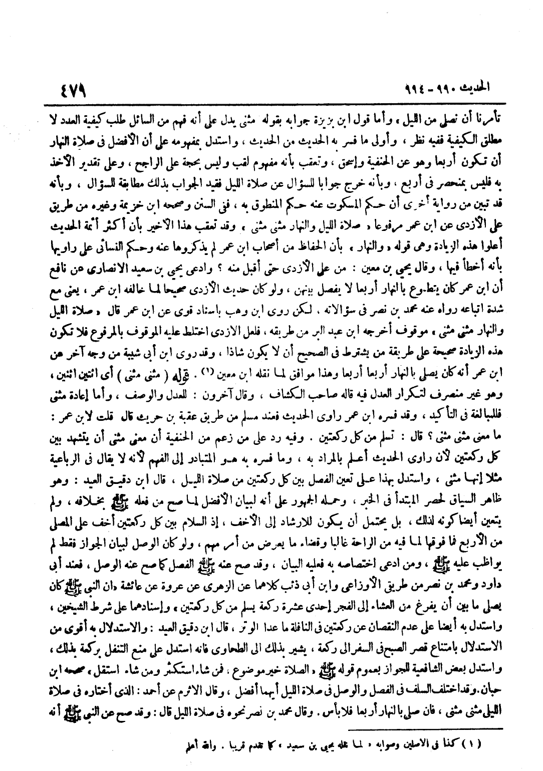 تَأْمُرُنَا أَنْ نُصَلِّيَ مِنَ اللَّيْلِ وَأَمَّا قَوْلُ بن بَزِيزَةَ جَوَابُهُ بِقَوْلِهِ مَثْنَى يَدُلُّ عَلَى أَنَّهُ فُهِمَ مِنَ السَّائِلِ طَلَبُ كَيْفِيَّةِ الْعَدَدِ لَا مُطْلَقُ الْكَيْفِيَّةِ فَفِيهِ نَظَرٌ وَأَوْلَى مَا فُسِّرَ بِهِ الْحَدِيثُ مِنَ الْحَدِيثِ وَاسْتُدِلَّ بِمَفْهُومِهِ عَلَى أَنَّ الْأَفْضَلَ فِي صَلَاةِ النَّهَارِ أَنْ تَكُونَ أَرْبَعًا وَهُوَ عَنِ الْحَنَفِيَّةِ وَإِسْحَاقَ وَتُعُقِّبَ بِأَنَّهُ مَفْهُومُ لَقَبٍ وَلَيْسَ بِحُجَّةٍ عَلَى الرَّاجِحِ وَعَلَى تَقْدِيرِ الْأَخْذِ بِهِ فَلَيْسَ بِمُنْحَصِرٍ فِي أَرْبَعٍ وَبِأَنَّهُ خَرَجَ جَوَابًا لِلسُّؤَالِ عَنْ صَلَاةِ اللَّيْلِ فَقُيِّدَ الْجَوَابُ بِذَلِكَ مُطَابَقَةً لِلسُّؤَالِ وَبِأَنَّهُ قَدْ تبين من رِوَايَةٍ أُخْرَى أَنَّ حُكْمَ الْمَسْكُوتِ عَنْهُ حُكْمُ الْمَنْطُوق بِهِ فَفِي السّنَن وَصَححهُ بن خُزَيْمَةَ وَغَيْرُهُ مِنْ طَرِيقٍ عَلَى الْأَزْدِيِّ عَنِ بن عُمَرَ مَرْفُوعًا صَلَاةُ اللَّيْلِ وَالنَّهَارِ مَثْنَى مَثْنَى وَقَدْ تُعُقِّبَ هَذَا الْأَخِيرُ بِأَنَّ أَكْثَرَ أَئِمَّةِ الْحَدِيثِ أَعَلُّوا هَذِهِ الزِّيَادَةَ وَهِيَ قَوْلُهُ وَالنَّهَارِ بِأَن الْحفاظ من أَصْحَاب بن عُمَرَ لَمْ يَذْكُرُوهَا عَنْهُ وَحَكَمَ النَّسَائِيُّ عَلَى رَاوِيهَا بِأَنَّهُ أَخْطَأَ فِيهَا وَقَالَ يَحْيَى بْنُ معِين من عَلِيٍّ الْأَزْدِيِّ حَتَّى أَقْبَلَ مِنْهُ وَادَّعَى يَحْيَى بن سعيد الْأنْصَارِيّ عَن نَافِع أَن بن عُمَرَ كَانَ يَتَطَوَّعُ بِالنَّهَارِ أَرْبَعًا لَا يَفْصِلُ بَيْنَهُنَّ وَلَوْ كَانَ حَدِيثُ الْأَزْدِيِّ صَحِيحًا لَمَا خَالفه بن عُمَرَ يَعْنِي مَعَ شِدَّةِ اتِّبَاعِهِ رَوَاهُ عَنْهُ مُحَمَّدُ بْنُ نَصْرٍ فِي سُؤَالَاتِهِ لَكِنْ رَوَى بن وهب بِإِسْنَاد قوي عَن بن عُمَرَ قَالَ صَلَاةُ اللَّيْلِ وَالنَّهَارِ مَثْنَى مَثْنَى مَوْقُوف أخرجه بن عَبْدِ الْبَرِّ مِنْ طَرِيقِهِ فَلَعَلَّ الْأَزْدِيَّ اخْتَلَطَ عَلَيْهِ الْمَوْقُوفُ بِالْمَرْفُوعِ فَلَا تَكُونُ هَذِهِ الزِّيَادَةُ صَحِيحَةً عَلَى طَرِيقَةِ مَنْ يَشْتَرِطُ فِي الصَّحِيحِ أَن لَا يكون شاذا وَقد روى بن أبي شيبَة من وَجه آخر عَن بن عُمَرَ أَنَّهُ كَانَ يُصَلِّي بِالنَّهَارِ أَرْبَعًا أَرْبَعًا وَهَذَا مُوَافق لما نَقله بن معِين قَوْلُهُ مَثْنَى مَثْنَى أَيِ اثْنَيْنِ اثْنَيْنِ وَهُوَ غَيْرُ مُنْصَرِفٍ لِتَكْرَارِ الْعَدْلِ فِيهِ قَالَهُ صَاحِبُ الْكَشَّافِ وَقَالَ آخَرُونَ لِلْعَدْلِ وَالْوَصْفِ وَأَمَّا إِعَادَةُ مثنى فللمبالغة فِي التَّأْكِيد وَقد فسره بن عمر رَاوِي الحَدِيث فَعِنْدَ مُسلم من طَرِيقِ عُقْبَةَ بْنِ حُرَيْثٍ قَالَ قُلْتُ لِابْنِ عُمَرَ مَا مَعْنَى مَثْنَى مَثْنَى قَالَ تُسَلِّمُ مِنْ كُلِّ رَكْعَتَيْنِ وَفِيهِ رَدٌّ عَلَى مَنْ زَعَمَ مِنَ الْحَنَفِيَّةِ أَنَّ مَعْنَى مَثْنَى أَنْ يَتَشَهَّدَ بَيْنَ كُلِّ رَكْعَتَيْنِ لِأَنَّ رَاوِيَ الْحَدِيثِ أَعْلَمُ بِالْمُرَادِ بِهِ وَمَا فَسَّرَهُ بِهِ هُوَ الْمُتَبَادَرُ إِلَى الْفَهْمِ لِأَنَّهُ لَا يُقَالُ فِي الرُّبَاعِيَّةِ مَثَلًا إِنَّهَا مَثْنَى وَاسْتُدِلَّ بِهَذَا عَلَى تَعَيُّنِ الْفَصْلِ بَيْنَ كُلِّ رَكْعَتَيْنِ مِنْ صَلَاةِ اللَّيْل قَالَ بن دَقِيقِ الْعِيدِ وَهُوَ ظَاهِرُ السِّيَاقِ لِحَصْرِ الْمُبْتَدَأِ فِي الْخَبَرِ وَحَمَلَهُ الْجُمْهُورُ عَلَى أَنَّهُ لِبَيَانِ الْأَفْضَلِ لِمَا صَحَّ مِنْ فِعْلِهِ صَلَّى اللَّهُ عَلَيْهِ وَسَلَّمَ بِخِلَافِهِ وَلَمْ يَتَعَيَّنْ أَيْضًا كَوْنُهُ لِذَلِكَ بَلْ يُحْتَمَلُ أَنْ يَكُونَ لِلْإِرْشَادِ إِلَى الْأَخَفِّ إِذِ السَّلَامُ بَيْنَ كُلِّ رَكْعَتَيْنِ أَخَفُّ عَلَى الْمُصَلِّي مِنَ الْأَر