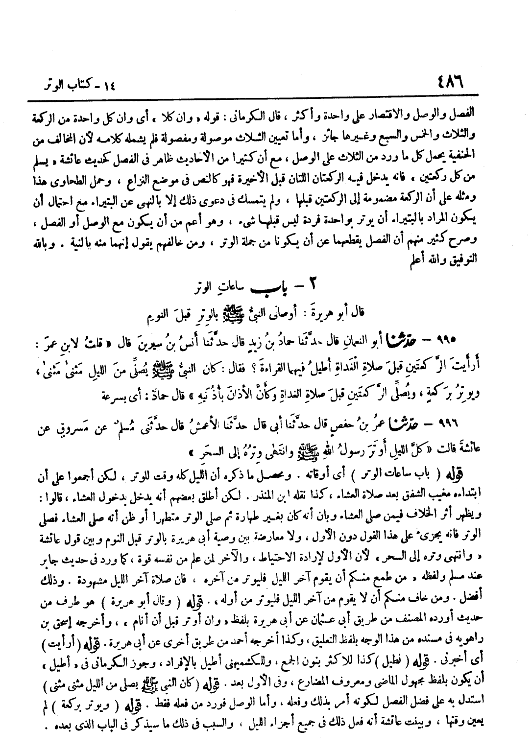 الْفَصْلَ وَالْوَصْلَ وَالِاقْتِصَارَ عَلَى وَاحِدَةٍ وَأَكْثَرَ قَالَ الْكِرْمَانِيُّ قَوْلُهُ وَأَنَّ كُلًّا أَيْ وَأَنَّ كُلَّ وَاحِدَةٍ مِنَ الرَّكْعَةِ وَالثَّلَاثِ وَالْخَمْسِ وَالسَّبْعِ وَغَيْرِهَا جَائِزٌ وَأَمَّا تَعْيِينُ الثَّلَاثِ مَوْصُولَةٍ وَمَفْصُولَةٍ فَلَمْ يَشْمَلْهُ كَلَامُهُ لِأَنَّ الْمُخَالِفَ مِنَ الْحَنَفِيَّةِ يَحْمِلُ كُلَّ مَا وَرَدَ مِنَ الثَّلَاثِ عَلَى الْوَصْلِ مَعَ أَنَّ كَثِيرًا مِنَ الْأَحَادِيثِ ظَاهِرٌ فِي الْفَصْلِ كَحَدِيثِ عَائِشَةَ يُسَلِّمُ مِنْ كُلِّ رَكْعَتَيْنِ فَإِنَّهُ يَدْخُلُ فِيهِ الرَّكْعَتَانِ اللَّتَانِ قَبْلَ الْأَخِيرَةِ فَهُوَ كَالنَّصِّ فِي مَوْضِعِ النِّزَاعِ وَحَمَلَ الطَّحَاوِيُّ هَذَا وَمِثْلَهُ عَلَى أَنَّ الرَّكْعَةَ مَضْمُومَةٌ إِلَى الرَّكْعَتَيْنِ قَبْلَهَا وَلَمْ يَتَمَسَّكْ فِي دَعْوَى ذَلِكَ إِلَّا بِالنَّهْيِ عَنِ الْبُتَيْرَاءِ مَعَ احْتِمَالِ أَنْ يَكُونَ الْمُرَادُ بِالْبُتَيْرَاءِ أَنْ يُوتِرَ بِوَاحِدَةٍ فَرْدَةٍ لَيْسَ قَبْلَهَا شَيْءٌ وَهُوَ أَعَمُّ مِنْ أَنْ يكون مَعَ الْوَصْلَ أَوِ الْفَصْلَ وَصَرَّحَ كَثِيرٌ مِنْهُمْ أَنَّ الْفَصْلَ يَقْطَعُهُمَا عَنْ أَنْ يَكُونَا مِنْ جُمْلَةِ الْوِتْرِ وَمَنْ خَالَفَهُمْ يَقُولُ إِنَّهُمَا مِنْهُ بِالنِّيَّةِ وَبِاللَّهِ التَّوْفِيق وَالله أعلم