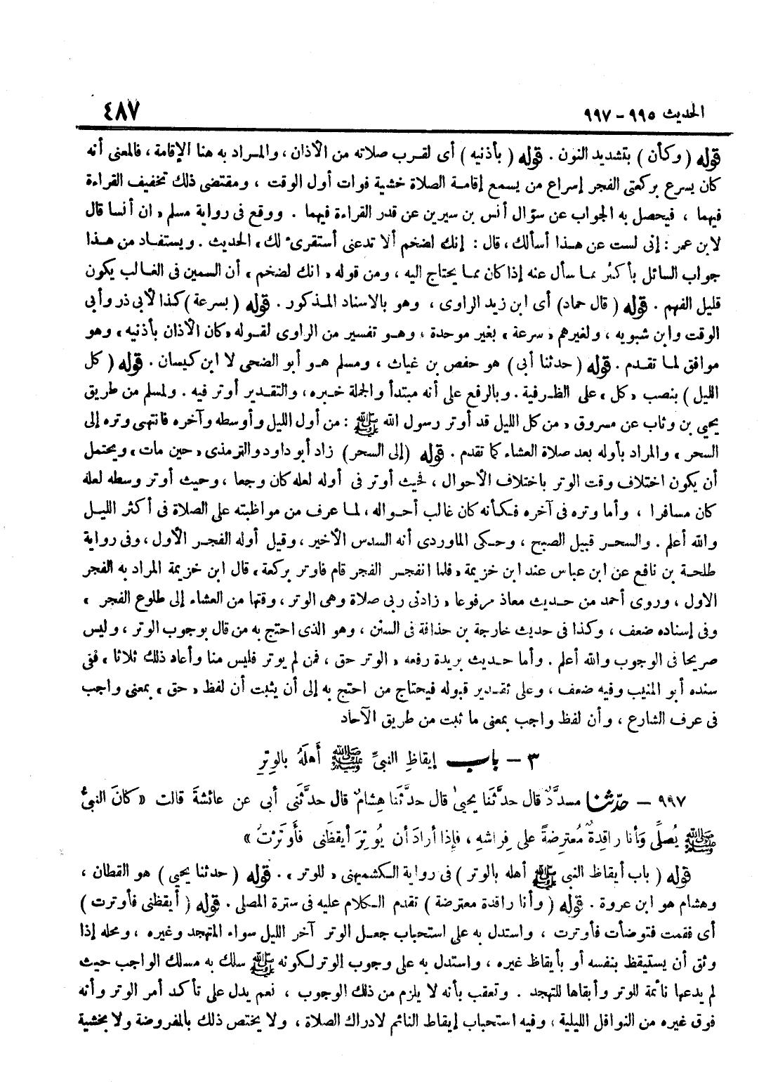 [997] قَوْلُهُ حَدَّثَنَا يَحْيَى هُوَ الْقَطَّانُ وَهِشَامٌ هُوَ بن عُرْوَةَ قَوْلُهُ وَأَنَا رَاقِدَةٌ مُعْتَرِضَةٌ تَقَدَّمَ الْكَلَامُ عَلَيْهِ فِي سُتْرَةِ الْمُصَلِّي قَوْلُهُ أَيْقَظَنِي فَأَوْتَرْتُ أَيْ فَقُمْتُ فَتَوَضَّأْتُ فَأَوْتَرْتُ وَاسْتُدِلَّ بِهِ عَلَى اسْتِحْبَابِ جَعْلِ الْوِتْرِ آخِرَ اللَّيْلِ سَوَاءٌ الْمُتَهَجِّدُ وَغَيْرُهُ وَمَحَلُّهُ إِذَا وَثِقَ أَنْ يَسْتَيْقِظَ بِنَفْسِهِ أَوْ بِإِيقَاظِ غَيْرِهِ وَاسْتُدِلَّ بِهِ عَلَى وُجُوبِ الْوِتْرِ لِكَوْنِهِ صَلَّى اللَّهُ عَلَيْهِ وَسَلَّمَ سَلَكَ بِهِ مَسْلَكَ الْوَاجِبِ حَيْثُ لَمْ يَدَعْهَا نَائِمَةً لِلْوِتْرِ وَأَبْقَاهَا لِلتَّهَجُّدِ وَتُعُقِّبَ بِأَنَّهُ لَا يَلْزَمُ مِنْ ذَلِكَ الْوُجُوبُ نَعَمْ يَدُلُّ عَلَى تَأَكُّدِ أَمْرِ الْوِتْرِ وَأَنَّهُ فَوْقَ غَيْرِهِ مِنَ النَّوَافِلِ اللَّيْلِيَّةِ وَفِيهِ اسْتِحْبَابُ إِيقَاظِ النَّائِمِ لِإِدْرَاكِ الصَّلَاةِ وَلَا يَخْتَصُّ ذَلِكَ بِالْمَفْرُوضَةِ وَلَا بِخَشْيَةِ