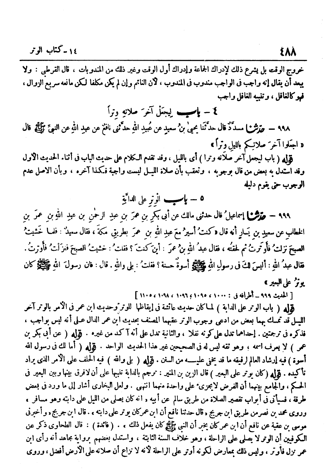 [999] قَوْلُهُ عَنْ أَبِي بَكْرِ بْنِ عُمَرَ لَا يُعْرَفُ اسْمُهُ وَهُوَ ثِقَةٌ لَيْسَ لَهُ فِي الصَّحِيحَيْنِ غَيْرُ هَذَا الْحَدِيثِ الْوَاحِدِ قَوْلُهُ أَمَا لَكَ فِي رَسُولِ اللَّهِ أُسْوَةٌ فِيهِ إِرْشَادُ الْعَالِمِ لِرَفِيقِهِ مَا قَدْ يَخْفَى عَلَيْهِ مِنَ السُّنَنِ قَوْلُهُ بَلَى وَاللَّهِ فِيهِ الْحَلِفُ عَلَى الْأَمْرِ الَّذِي يُرَادُ تَأْكِيدُهُ قَوْلُهُ كَانَ يُوتِرُ عَلَى الْبَعِيرِ قَالَ الزَّيْنُ بْنُ الْمُنِيرِ تُرْجِمَ بِالدَّابَّةِ تَنْبِيهًا عَلَى أَنْ لَا فَرْقَ بَيْنَهَا وَبَيْنَ الْبَعِيرِ فِي الْحُكْمِ وَالْجَامِعُ بَيْنَهُمَا أَنَّ الْفَرْضَ لَا يُجْزِئُ عَلَى وَاحِدَةٍ مِنْهُمَا انْتَهَى وَلَعَلَّ الْبُخَارِيَّ أَشَارَ إِلَى مَا وَرَدَ فِي بَعْضِ طُرُقِهِ فَسَيَأْتِي فِي أَبْوَابِ تَقْصِيرِ الصَّلَاةِ مِنْ طَرِيقِ سَالِمٍ عَنْ أَبِيهِ أَنَّهُ كَانَ يُصَلِّي مِنَ اللَّيْلِ عَلَى دَابَّتِهِ وَهُوَ مُسَافِرٌ وروى مُحَمَّد بن نصر من طَرِيق بن جريج قَالَ حَدثنَا نَافِع أَن بن عمر كَانَ يُوتر على دَابَّته قَالَ بن جُرَيْجٍ وَأَخْبَرَنِي مُوسَى بْنُ عُقْبَةَ عَنْ نَافِعٍ أَن بن عُمَرَ كَانَ يُخْبِرُ أَنَّ النَّبِيَّ صَلَّى اللَّهُ عَلَيْهِ وَسَلَّمَ كَانَ يَفْعَلُ ذَلِكَ فَائِدَةٌ قَالَ الطَّحَاوِيُّ ذُكِرَ عَنِ الْكُوفِيِّينَ أَنَّ الْوِتْرَ لَا يُصَلَّى عَلَى الرَّاحِلَةِ وَهُوَ خِلَافُ السُّنَّةِ الثَّابِتَةِ وَاسْتدلَّ بَعضهم بِرِوَايَة مُجَاهِد أَنه رأى بن عُمَرَ نَزَلَ فَأَوْتَرَ وَلَيْسَ ذَلِكَ بِمُعَارِضٍ لِكَوْنِهِ أَوْتَرَ عَلَى الرَّاحِلَةِ لِأَنَّهُ لَا نِزَاعَ أَنَّ صَلَاتَهُ عَلَى الْأَرْضِ أَفْضَلُ وَرَوَى