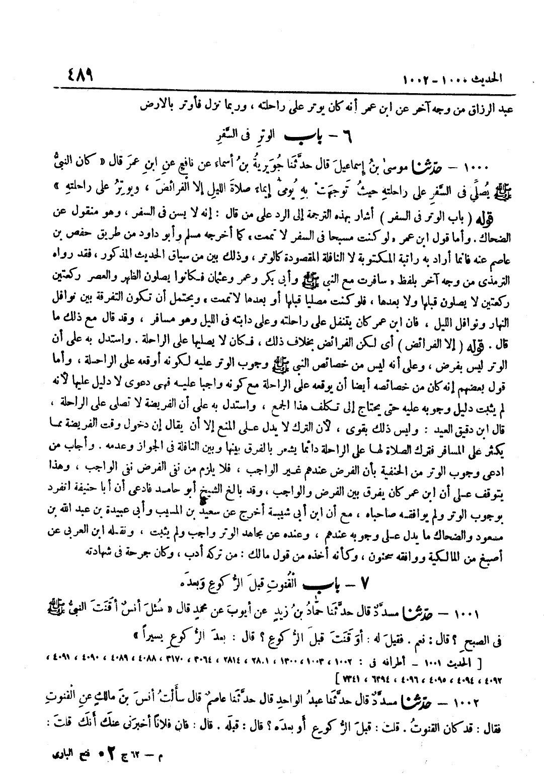 [1000] قَوْلُهُ إِلَّا الْفَرَائِضَ أَيْ لَكِنِ الْفَرَائِضُ بِخِلَافِ ذَلِكَ فَكَانَ لَا يُصَلِّيهَا عَلَى الرَّاحِلَةِ وَاسْتُدِلَّ بِهِ عَلَى أَنَّ الْوِتْرَ لَيْسَ بِفَرْضٍ وَعَلَى أَنَّهُ لَيْسَ مِنْ خَصَائِصِ النَّبِيِّ صَلَّى اللَّهُ عَلَيْهِ وَسَلَّمَ وُجُوبُ الْوِتْرِ عَلَيْهِ لِكَوْنِهِ أَوْقَعَهُ عَلَى الرَّاحِلَةِ وَأَمَّا قَوْلُ بَعْضِهِمْ إِنَّهُ كَانَ مِنْ خَصَائِصِهِ أَيْضًا أَنْ يُوقِعَهُ عَلَى الرَّاحِلَةِ مَعَ كَوْنِهِ وَاجِبًا عَلَيْهِ فَهِيَ دَعْوَى لَا دَلِيلَ عَلَيْهَا لِأَنَّهُ لَمْ يَثْبُتْ دَلِيلُ وُجُوبِهِ عَلَيْهِ حَتَّى يَحْتَاجَ إِلَى تَكَلُّفِ هَذَا الْجَمْعِ وَاسْتُدِلَّ بِهِ عَلَى أَنَّ الْفَرِيضَة لَا تصلي على الرَّاحِلَة قَالَ بن دَقِيقِ الْعِيدِ وَلَيْسَ ذَلِكَ بِقَوِيٍّ لِأَنَّ التَّرْكَ لَا يَدُلُّ عَلَى الْمَنْعِ إِلَّا أَنْ يُقَالَ إِنَّ دُخُولَ وَقْتِ الْفَرِيضَةِ مِمَّا يَكْثُرُ عَلَى الْمُسَافِرِ فَتَرْكُ الصَّلَاةِ لَهَا عَلَى الرَّاحِلَةِ دَائِمًا يُشْعِرُ بِالْفَرْقِ بَيْنهَا وَبَيْنَ النَّافِلَةِ فِي الْجَوَازِ وَعَدَمِهِ وَأَجَابَ مَنِ ادَّعَى وُجُوبَ الْوِتْرِ مِنَ الْحَنَفِيَّةِ بِأَنَّ الْفَرْضَ عِنْدَهُمْ غَيْرُ الْوَاجِبِ فَلَا يَلْزَمُ مِنْ نَفْيِ الْفَرْضِ نَفْيُ الْوَاجِبِ وَهَذَا يتَوَقَّف على أَن بن عُمَرَ كَانَ يُفَرِّقُ بَيْنَ الْفَرْضِ وَالْوَاجِبِ وَقَدْ بَالَغَ الشَّيْخُ أَبُو حَامِدٍ فَادَّعَى أَنَّ أَبَا حَنِيفَةَ انْفَرَدَ بِوُجُوبِ الْوِتْرِ وَلَمْ يُوَافِقْهُ صَاحِبَاهُ مَعَ أَن بن أبي شَيْبَةَ أَخْرَجَ عَنْ سَعِيدِ بْنِ الْمُسَيَّبِ وَأَبِي عُبَيْدَةَ بْنِ عَبْدِ اللَّهِ بْنِ مَسْعُودٍ وَالضَّحَّاكِ مَا يَدُلُّ عَلَى وُجُوبِهِ عِنْدَهُمْ وَعِنْدَهُ عَنْ مُجَاهِد الْوتر وَاجِب وَلم يثبت وَنَقله بن الْعَرَبِيِّ عَنْ أَصْبَغَ مِنَ الْمَالِكِيَّةِ وَوَافَقَهُ سَحْنُونُ وَكَأَنَّهُ أَخَذَهُ مِنْ قَوْلِ مَالِكٍ مَنْ تَرَكَهُ أدب وَكَانَ جرحة فِي شَهَادَته