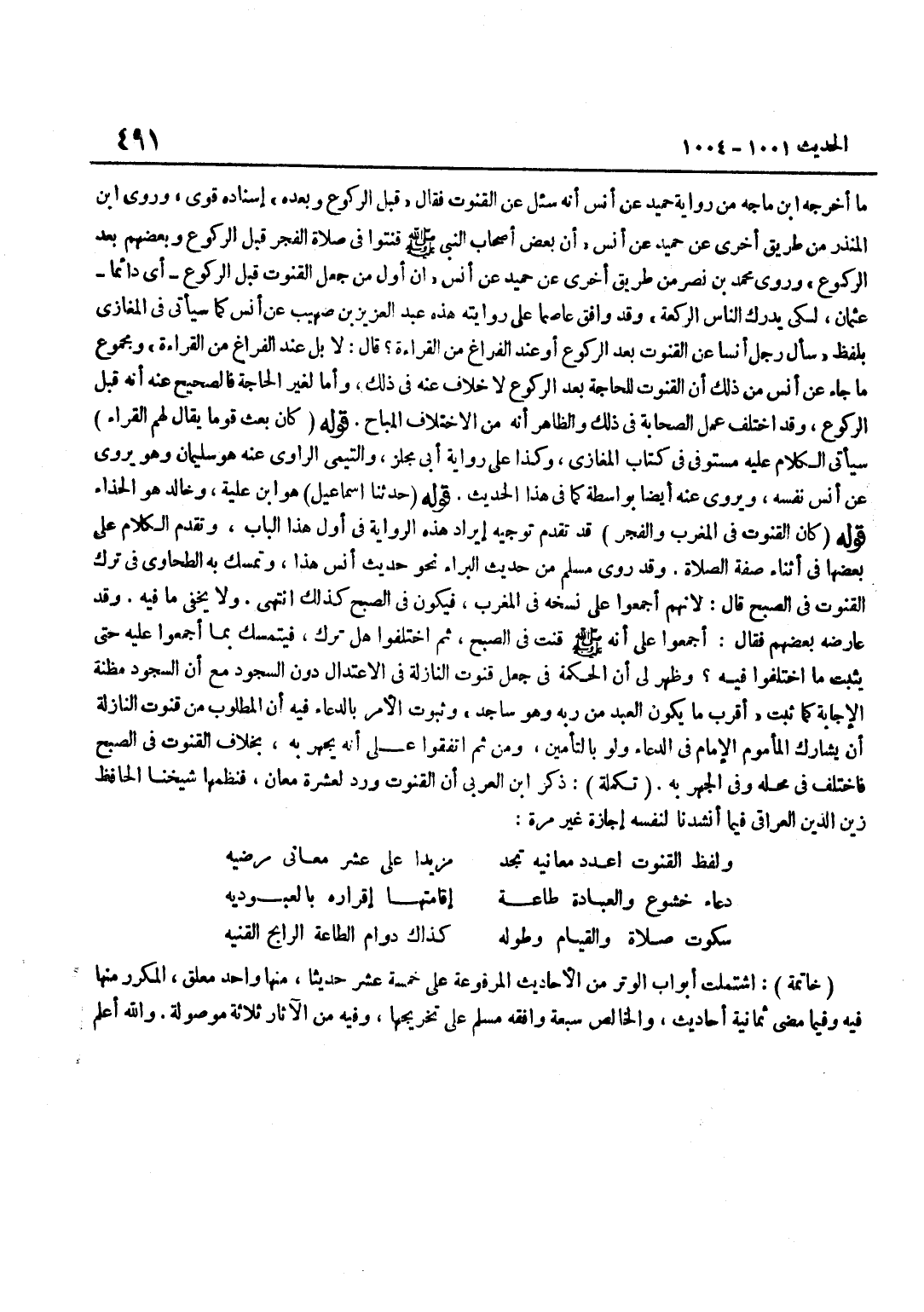 [1004] قَوْله حَدثنَا إِسْمَاعِيل هُوَ بن عُلَيَّةَ وَخَالِدٌ هُوَ الْحَذَّاءُ قَوْلُهُ كَانَ الْقُنُوتُ فِي الْمَغْرِبِ وَالْفَجْرِ قَدْ تَقَدَّمَ تَوْجِيهُ إِيرَادِ هَذِهِ الرِّوَايَةِ فِي أَوَّلِ هَذَا الْبَابِ وَتَقَدَّمَ الْكَلَامُ عَلَى بَعْضِهَا فِي أَثْنَاءِ صِفَةِ الصَّلَاةِ وَقَدْ رَوَى مُسْلِمٌ مِنْ حَدِيثِ الْبَرَاءِ نَحْوَ حَدِيثِ أَنَسٍ هَذَا وَتَمَسَّكَ بِهِ الطَّحَاوِيُّ فِي تَرْكِ الْقُنُوتِ فِي الصُّبْحِ قَالَ لِأَنَّهُمْ أَجْمَعُوا عَلَى نَسْخِهِ فِي الْمَغْرِبِ فَيَكُونُ فِي الصُّبْحِ كَذَلِكَ انْتَهَى وَلَا يَخْفَى مَا فِيهِ وَقَدْ عَارَضَهُ بَعْضُهُمْ فَقَالَ أَجْمَعُوا عَلَى أَنَّهُ صَلَّى اللَّهُ عَلَيْهِ وَسَلَّمَ قَنَتَ فِي الصُّبْحِ ثُمَّ اخْتَلَفُوا هَلْ تَرَكَ فَيُتَمَسَّكَ بِمَا أَجْمَعُوا عَلَيْهِ حَتَّى يَثْبُتَ مَا اخْتَلَفُوا فِيهِ وَظَهَرَ لِي أَن الْحِكْمَة فِي جعل قنوت النَّازِلَةَ فِي الِاعْتِدَالِ دُونَ السُّجُودِ مَعَ أَنَّ السُّجُودَ مَظِنَّةُ الْإِجَابَةِ كَمَا ثَبَتَ أَقْرَبُ مَا يَكُونُ الْعَبْدُ مِنْ رَبِّهِ وَهُوَ سَاجِدٌ وَثُبُوتُ الْأَمْرِ بِالدُّعَاءِ فِيهِ أَنَّ الْمَطْلُوبَ مِنْ قُنُوتِ النَّازِلَةِ أَنْ يُشَارِكَ الْمَأْمُومُ الْإِمَامَ فِي الدُّعَاءِ وَلَوْ بِالتَّأْمِينِ وَمِنْ ثَمَّ اتَّفَقُوا عَلَى أَنَّهُ يُجْهَرُ بِهِ بِخِلَافِ الْقُنُوتِ فِي الصُّبْحِ فَاخْتُلِفَ فِي مَحَلِّهِ وَفِي الْجَهْرِ بِهِ تَكْمِلَةٌ ذَكَرَ بن الْعَرَبِيِّ أَنَّ الْقُنُوتَ وَرَدَ لِعَشَرَةِ مَعَانٍ فَنَظَمَهَا شَيْخُنَا الْحَافِظُ زَيْنُ الدِّينِ الْعِرَاقِيُّ فِيمَا أَنْشَدَنَا لِنَفْسِهِ إِجَازَةً غَيْرَ مَرَّةٍ وَلَفْظُ الْقُنُوتِ اعْدُدْ مَعَانِيَهُ تَجِدْ مَزِيدًا عَلَى عَشْرِ مَعَانِي مَرْضِيَّهْ دُعَاءُ خُشُوعٍ وَالْعِبَادَةُ طَاعَةٌ إِقَامَتُهَا إِقْرَارُهُ بِالْعُبُودِيَّهْ سكُوت صَلَاة وَالْقِيَام وَطوله كَذَاك دوَام الطَّاعَة الرَّابِحِ الْقُنِيَّهْ خَاتِمَةٌ اشْتَمَلَتْ أَبْوَابُ الْوِتْرِ مِنَ الْأَحَادِيثِ الْمَرْفُوعَةِ عَلَى خَمْسَةَ عَشَرَ حَدِيثًا مِنْهَا وَاحِدٌ مُعَلَّقٌ الْمُكَرَّرُ مِنْهَا فِيهِ وَفِيمَا مَضَى ثَمَانِيَةُ أَحَادِيثَ وَالْخَالِصُ سَبْعَةٌ وَافَقَهُ مُسْلِمٌ عَلَى تَخْرِيجِهَا وَفِيهِ مِنَ الْآثَارِ ثَلَاثَةٌ مَوْصُولَةٌ وَاللَّهُ أعلم