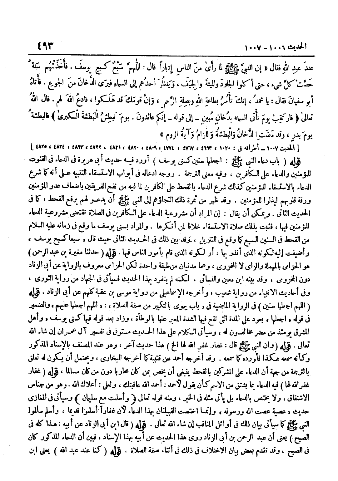 أَوْرَدَ فِيهِ حَدِيثَ أَبِي هُرَيْرَةَ فِي الدُّعَاءِ فِي الْقُنُوتِ لِلْمُؤْمِنِينَ وَالدُّعَاءِ عَلَى الْكَافِرِينَ وَفِيهِ مَعْنَى التَّرْجَمَةِ وَوَجْهُ إِدْخَالِهِ فِي أَبْوَابِ الِاسْتِسْقَاءِ التَّنْبِيهُ عَلَى أَنَّهُ كَمَا شُرِعَ الدُّعَاءُ بِالِاسْتِسْقَاءِ لِلْمُؤْمِنِينَ كَذَلِكَ شُرِعَ الدُّعَاءُ بِالْقَحْطِ عَلَى الْكَافِرِينَ لِمَا فِيهِ مِنْ نَفْعِ الْفَرِيقَيْنِ بِإِضْعَافِ عَدُوِّ الْمُؤْمِنِينَ وَرِقَّةِ قُلُوبِهِمْ لِيَذِلُّوا لِلْمُؤْمِنِينَ وَقَدْ ظَهَرَ مِنْ ثَمَرَةِ ذَلِكَ الْتِجَاؤُهُمْ إِلَى النَّبِيِّ صَلَّى اللَّهُ عَلَيْهِ وَسَلَّمَ أَنْ يَدْعُوَ لَهُمْ بِرَفْعِ الْقَحْطِ كَمَا فِي الْحَدِيثِ الثَّانِي وَيُمْكِنُ أَنْ يُقَالَ إِنَّ الْمُرَادَ أَنَّ مَشْرُوعِيَّةَ الدُّعَاءِ عَلَى الْكَافِرِينَ فِي الصَّلَاةِ تَقْتَضِي مَشْرُوعِيَّةَ الدُّعَاءِ لِلْمُؤْمِنِينَ فِيهَا فَثَبَتَ بِذَلِكَ صَلَاةُ الِاسْتِسْقَاءِ خِلَافًا لِمَنْ أَنْكَرَهَا وَالْمُرَادُ بِسِنِي يُوسُفَ مَا وَقَعَ فِي زَمَانِهِ عَلَيْهِ السَّلِامُ مِنَ الْقَحْطِ فِي السِّنِينَ السَّبْعِ كَمَا وَقَعَ فِي التَّنْزِيلِ وَقَدْ بُيِّنَ ذَلِكَ فِي الْحَدِيثِ الثَّانِي حَيْثُ قَالَ سَبْعًا كَسَبْعِ يُوسُفَ وَأُضِيفَتْ إِلَيْهِ لِكَوْنِهِ الَّذِي أَنْذَرَ بِهَا أَوْ لِكَوْنِهِ الَّذِي قَامَ بِأُمُورِ النَّاسِ فِيهَا