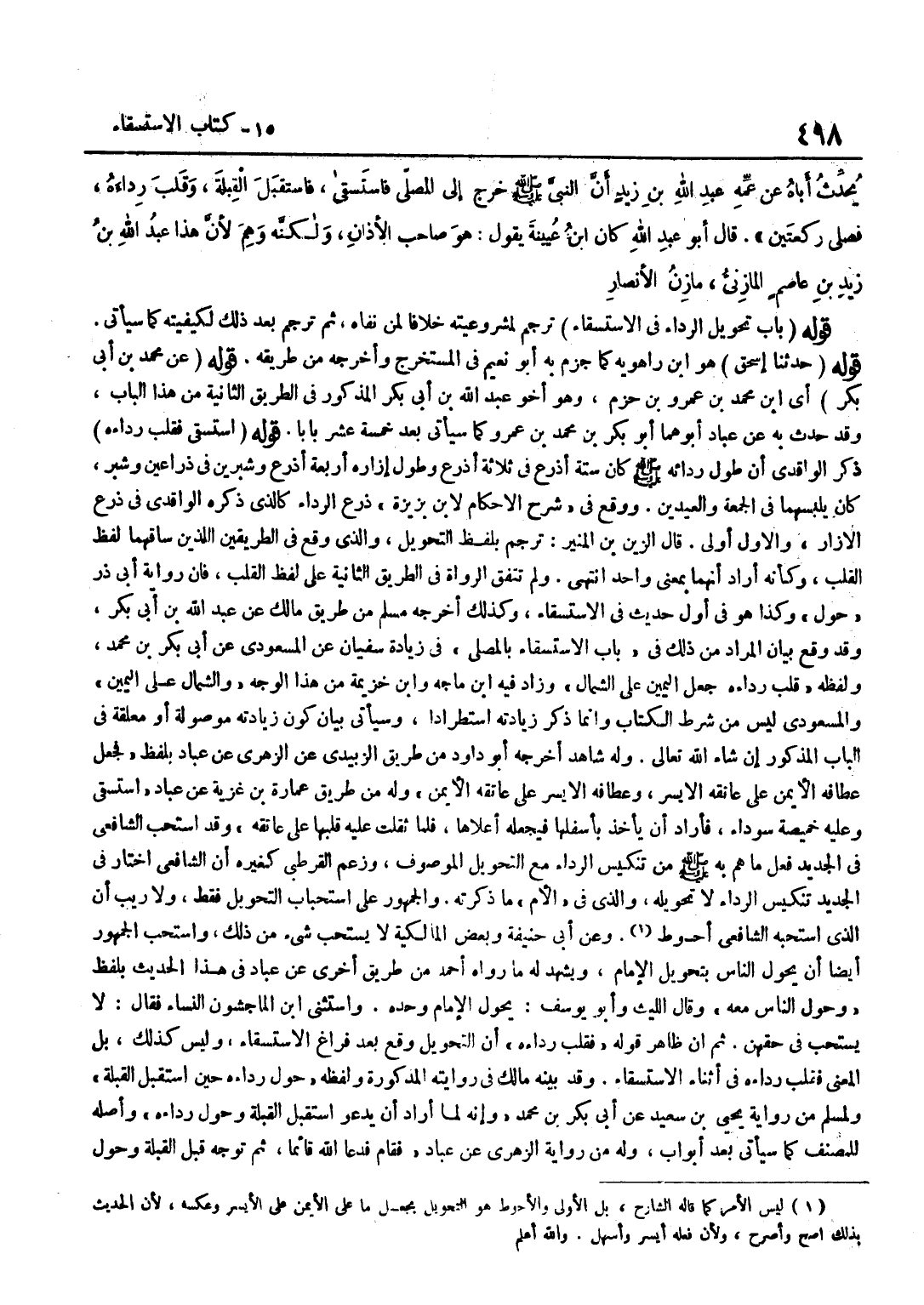 [1011] قَوْلُهُ حَدَّثَنَا إِسْحَاقُ هُوَ بن رَاهْوَيْهِ كَمَا جَزَمَ بِهِ أَبُو نُعَيْمٍ فِي الْمُسْتَخْرَجِ وَأَخْرَجَهُ مِنْ طَرِيقِهِ قَوْلُهُ عَنْ مُحَمَّدِ بن أبي بكر أَي بن مُحَمَّدِ بْنِ عَمْرِو بْنِ حَزْمٍ وَهُوَ أَخُو عَبْدِ اللَّهِ بْنِ أَبِي بَكْرٍ الْمَذْكُورِ فِي الطَّرِيقِ الثَّانِيَةِ مِنْ هَذَا الْبَابِ وَقَدْ حَدَّثَ بِهِ عَنْ عَبَّادٍ أَبُوهُمَا أَبُو بَكْرِ بْنُ مُحَمَّدِ بْنِ عَمْرِو كَمَا سَيَأْتِي بَعْدَ خَمْسَةَ عَشَرَ بَابًا قَوْلُهُ اسْتَسْقَى فَقَلَبَ رِدَاءَهُ ذَكَرَ الْوَاقِدِيُّ أَنَّ طُولَ رِدَائِهِ صَلَّى اللَّهُ عَلَيْهِ وَسَلَّمَ كَانَ سِتَّةَ أَذْرُعٍ فِي ثَلَاثَةِ أَذْرُعٍ وَطُولَ إِزَارِهِ أَرْبَعَةُ أَذْرُعٍ وَشِبْرَيْنِ فِي ذِرَاعَيْنِ وَشِبْرٍ كَانَ يَلْبَسُهُمَا فِي الْجُمُعَةِ وَالْعِيدَيْنِ وَوَقَعَ فِي شَرْحِ الْأَحْكَامِ لِابْنِ بَزِيزَةَ ذَرْعَ الرِّدَاءِ كَالَّذي ذكره الْوَاقِدِيّ فِي ذرع الْإِزَارِ وَالْأَوَّلُ أَوْلَى قَالَ الزَّيْنُ بْنُ الْمُنِيرِ تُرْجِمَ بِلَفْظِ التَّحْوِيلِ وَالَّذِي وَقَعَ فِي الطَّرِيقَيْنِ اللَّذَيْنِ سَاقَهُمَا لَفْظُ الْقَلْبِ وَكَأَنَّهُ أَرَادَ أَنَّهُمَا بِمَعْنًى وَاحِدٍ انْتَهَى وَلَمْ تَتَّفِقِ الرُّوَاةُ فِي الطَّرِيقِ الثَّانِيَةِ عَلَى لَفْظِ الْقَلْبِ فَإِنَّ رِوَايَةَ أَبِي ذَرٍّ حَوَّلَ وَكَذَا هُوَ فِي أَوَّلِ حَدِيثٍ فِي الِاسْتِسْقَاءِ وَكَذَلِكَ أَخْرَجَهُ مُسْلِمٌ مِنْ طَرِيقِ مَالِكٍ عَنْ عَبْدِ اللَّهِ بْنِ أَبِي بَكْرٍ وَقَدْ وَقَعَ بَيَانُ الْمُرَادِ مِنْ ذَلِكَ فِي بَابِ الِاسْتِسْقَاءِ بِالْمُصَلَّى فِي زِيَادَةِ سُفْيَانَ عَنْ الْمَسْعُودِيِّ عَنْ أَبِي بَكْرِ بْنِ مُحَمَّدٍ وَلَفْظُهُ قَلَبَ رِدَاءَهُ جَعَلَ الْيَمِينَ عَلَى الشِّمَالِ وَزَاد فِيهِ بن ماجة وبن خُزَيْمَةَ مِنْ هَذَا الْوَجْهِ وَالشِّمَالَ عَلَى الْيَمِينِ وَالْمَسْعُودِيُّ لَيْسَ مِنْ شَرْطِ الْكِتَابِ وَإِنَّمَا ذَكَرَ زِيَادَتَهُ اسْتِطْرَادًا وَسَيَأْتِي بَيَانُ كَوْنِ زِيَادَتِهِ مَوْصُولَةً أَوْ مُعَلَّقَةً فِي الْبَابِ الْمَذْكُورِ إِنْ شَاءَ اللَّهُ تَعَالَى وَلَهُ شَاهِدٌ أَخَرَجَهُ أَبُو دَاوُدَ مِنْ طَرِيقِ الزُّبَيْدِيِّ عَنِ الزُّهْرِيِّ عَنْ عَبَّادٍ بِلَفْظِ فَجَعَلَ عِطَافَهُ الْأَيْمَنَ عَلَى عَاتِقِهِ الْأَيْسَرِ وَعِطَافَهُ الْأَيْسَرَ عَلَى عَاتِقِهِ الْأَيْمَنِ وَلَهُ مِنْ طَرِيقِ عُمَارَةَ بْنِ غَزِيَّةَ عَنْ عَبَّادٍ اسْتَسْقَى وَعَلَيْهِ خَمِيصَةٌ سَوْدَاءُ فَأَرَادَ أَنْ يَأْخُذَ بِأَسْفَلِهَا فَيَجْعَلُهُ أَعْلَاهَا فَلَمَّا ثَقُلَتْ عَلَيْهِ قَلَبَهَا عَلَى عَاتِقِهِ وَقَدِ اسْتَحَبَّ الشَّافِعِيُّ فِي الْجَدِيدِ فِعْلَ مَا هَمَّ بِهِ صَلَّى اللَّهُ عَلَيْهِ وَسَلَّمَ مِنْ تَنْكِيسِ الرِّدَاءِ مَعَ التَّحْوِيلِ الْمَوْصُوفِ وَزَعَمَ الْقُرْطُبِيُّ كَغَيْرِهِ أَنَّ الشَّافِعِيَّ اخْتَارَ فِي الْجَدِيدِ تَنْكِيسَ الرِّدَاءِ لَا تَحْوِيلَهُ وَالَّذِي فِي الْأُمِّ مَا ذَكَرْتُهُ وَالْجُمْهُورُ عَلَى اسْتِحْبَابِ التَّحْوِيلِ فَقَطْ وَلَا رَيْبَ أَنَّ الَّذِي اسْتَحَبَّهُ الشَّافِعِيُّ أَحْوَطُ وَعَنْ أَبِي حَنِيفَةَ وَبَعْضِ الْمَالِكِيَّةِ لَا يُسْتَحَبُّ شَيْءٌ مِنْ ذَلِكَ وَاسْتَحَبَّ الْجُمْهُورُ أَيْضًا أَنْ يُحَوِّلَ النَّاسُ بِتَحْوِيلِ الْإِمَامِ وَيَشْهَدُ لَهُ مَا رَوَاهُ أَحْمَدُ مِنْ طَرِيقٍ أُخْرَى عَنْ عَبَّادٍ فِي هَذَا الْحَدِيثِ بِلَفْظِ وَحَوَّلَ النَّاسُ مَعَهُ وَقَالَ اللَّيْثُ وَأَبُو يُوسُفَ يُحَوِّلُ الْإِمَامُ وَحْدَهُ وَاسْتثنى بن الْمَاجِشُونِ النِّسَاءَ فَقَالَ لَا يُسْتَحَبُّ فِي حَقِّهِنَّ ثُمَّ إِنَّ ظَاهِرَ قَوْلِهِ