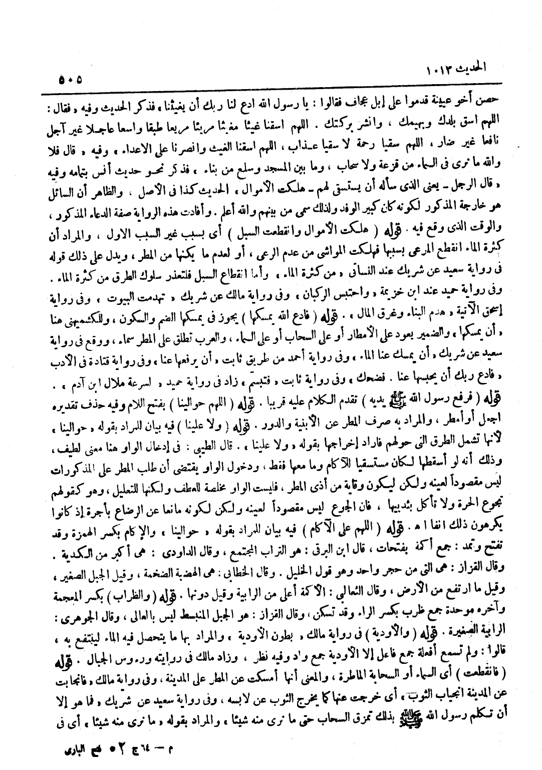 حِصْنٍ أَخُو عُيَيْنَةَ قَدِمُوا عَلَى إِبِلٍ عِجَافٍ فَقَالُوا يَا رَسُولَ اللَّهِ ادْعُ لَنَا رَبَّكَ أَنْ يُغِيثَنَا فَذَكَرَ الْحَدِيثَ وَفِيهِ فَقَالَ اللَّهُمَّ اسْقِ بَلَدَكَ وَبَهِيمَكَ وَانْشُرْ بَرَكَتَكَ اللَّهُمَّ اسْقِنَا غَيْثًا مُغِيثًا مَرِيئًا مُرِيعًا طَبَقًا وَاسِعًا عَاجِلًا غَيْرَ آجِلٍ نَافِعًا غَيْرَ ضَارٍّ اللَّهُمَّ سُقْيَا رَحْمَةٍ لَا سُقْيَا عَذَابٍ اللَّهُمَّ اسْقِنَا الْغَيْثَ وَانْصُرْنَا عَلَى الْأَعْدَاءِ وَفِيهِ قَالَ فَلَا وَاللَّهِ مَا نَرَى فِي السَّمَاءِ مِنْ قَزَعَةٍ وَلَا سَحَابٍ وَمَا بَيْنَ الْمَسْجِدِ وَسَلْعٍ مِنْ بِنَاءٍ فَذَكَرَ نَحْوَ حَدِيثِ أَنَسٍ بِتَمَامِهِ وَفِيهِ قَالَ الرَّجُلُ يَعْنِي الَّذِي سَأَلَهُ أَنْ يَسْتَسْقِيَ لَهُمْ هَلَكَتِ الْأَمْوَالُ الْحَدِيثَ كَذَا فِي الْأَصْلِ وَالظَّاهِرُ أَنَّ السَّائِلَ هُوَ خَارِجَةُ الْمَذْكُورُ لِكَوْنِهِ كَانَ كَبِيرَ الْوَفْدِ وَلِذَلِكَ سُمِّيَ مِنْ بَيْنِهِمْ وَاللَّهُ أَعْلَمُ وَأَفَادَتْ هَذِهِ الرِّوَايَةُ صِفَةَ الدُّعَاءِ الْمَذْكُورِ وَالْوَقْتَ الَّذِي وَقَعَ فِيهِ قَوْلُهُ هَلَكَتِ الْأَمْوَالُ وَانْقَطَعَتِ السُّبُلُ أَيْ بِسَبَبٍ غَيْرِ السَّبَبِ الْأَوَّلِ وَالْمُرَادُ أَنَّ كَثْرَةَ الْمَاءِ انْقَطَعَ الْمَرْعَى بِسَبَبِهَا فَهَلَكَتِ الْمَوَاشِي مِنْ عَدَمِ الرَّعْيِ أَوْ لِعَدَمِ مَا يُكِنُّهَا مِنَ الْمَطَرِ وَيَدُلُّ عَلَى ذَلِكَ قَوْلُهُ فِي رِوَايَةِ سَعِيدٍ عَنْ شَرِيكٍ عِنْدَ النَّسَائِيِّ مِنْ كَثْرَةِ الْمَاءِ وَأَمَّا انْقِطَاعُ السُّبُلِ فَلِتَعَذُّرِ سُلُوكِ الطُّرُقِ مِنْ كَثْرَةِ الْمَاءِ وَفِي رِوَايَة حميد عِنْد بن خُزَيْمَةَ وَاحْتَبَسَ الرَّكْبَانِ وَفِي رِوَايَةِ مَالِكٍ عَنْ شَرِيكٍ تَهَدَّمَتِ الْبُيُوتُ وَفِي رِوَايَةِ إِسْحَاقَ الْآتِيَةِ هُدِمَ الْبِنَاءُ وَغَرِقَ الْمَالُ قَوْلُهُ فَادْعُ اللَّهَ يُمْسِكُهَا يَجُوزُ فِي يُمْسِكُهَا الضَّمُّ وَالسُّكُونُ ولِلكُشْمِيهَنِيِّ هُنَا أَنْ يُمْسِكَهَا وَالضَّمِيرُ يَعُودُ عَلَى الْأَمْطَارِ أَوْ عَلَى السَّحَابِ أَوْ عَلَى السَّمَاءِ وَالْعَرَبُ تُطْلِقُ عَلَى الْمَطَرِ سَمَاءً وَوَقَعَ فِي رِوَايَةِ سَعِيدٍ عَنْ شَرِيكٍ أَنْ يُمْسِكَ عَنَّا الْمَاءَ وَفِي رِوَايَةِ أَحْمَدَ مِنْ طَرِيقِ ثَابِتٍ أَنْ يَرْفَعَهَا عَنَّا وَفِي رِوَايَةِ قَتَادَةَ فِي الْأَدَبِ فَادْعُ رَبَّكَ أَنْ يَحْبِسَهَا عَنَّا فَضَحِكَ وَفِي رِوَايَةِ ثَابِتٍ فَتَبَسَّمَ زَادَ فِي رِوَايَةِ حُمَيْدٍ لسرعة ملال بن آدَمَ قَوْلُهُ فَرَفَعَ رَسُولُ اللَّهِ صَلَّى اللَّهُ عَلَيْهِ وَسَلَّمَ يَدَيْهِ تَقَدَّمَ الْكَلَامُ عَلَيْهِ قَرِيبًا قَوْلُهُ اللَّهُمَّ حَوَالَيْنَا بِفَتْحِ اللَّامِ وَفِيهِ حَذْفٌ تَقْدِيرُهُ اجْعَلْ أَوْ أَمْطِرْ وَالْمُرَادُ بِهِ صَرْفُ الْمَطَرِ عَنْ الْأَبْنِيَةِ وَالدُّورِ قَوْلُهُ وَلَا عَلَيْنَا فِيهِ بَيَانٌ لِلْمُرَادِ بِقَوْلِهِ حَوَالَيْنَا لِأَنَّهَا تَشْمَلُ الطُّرُقَ الَّتِي حَوْلَهُمْ فَأَرَادَ إِخْرَاجَهَا بِقَوْلِهِ وَلَا عَلَيْنَا قَالَ الطِّيبِيُّ فِي إِدْخَالِ الْوَاوِ هُنَا مَعْنًى لَطِيفٌ وَذَلِكَ أَنَّهُ لَوْ أَسْقَطَهَا لَكَانَ مُسْتَسْقِيًا لِلْآكَامِ وَمَا مَعَهَا فَقَطْ وَدُخُولُ الْوَاوِ يَقْتَضِي أَنَّ طَلَبَ الْمَطَرِ عَلَى الْمَذْكُورَاتِ لَيْسَ مَقْصُودًا لِعَيْنِهِ وَلَكِنْ لِيَكُونَ وِقَايَةً مِنْ أَذَى الْمَطَرِ فَلَيْسَتِ الْوَاوُ مُخَلَّصَةً لِلْعَطْفِ وَلَكِنَّهَا لِلتَّعْلِيلِ وَهُوَ كَقَوْلِهِمْ تَجُوعُ الْحُرَّةُ وَلَا تَأْكُلُ بِثَدْيَيْهَا فَإِنَّ الْجُوعَ لَيْسَ مَقْصُودًا لِعَيْنِهِ وَلَكِنْ لِكَوْنِهِ مَانِعًا عَن