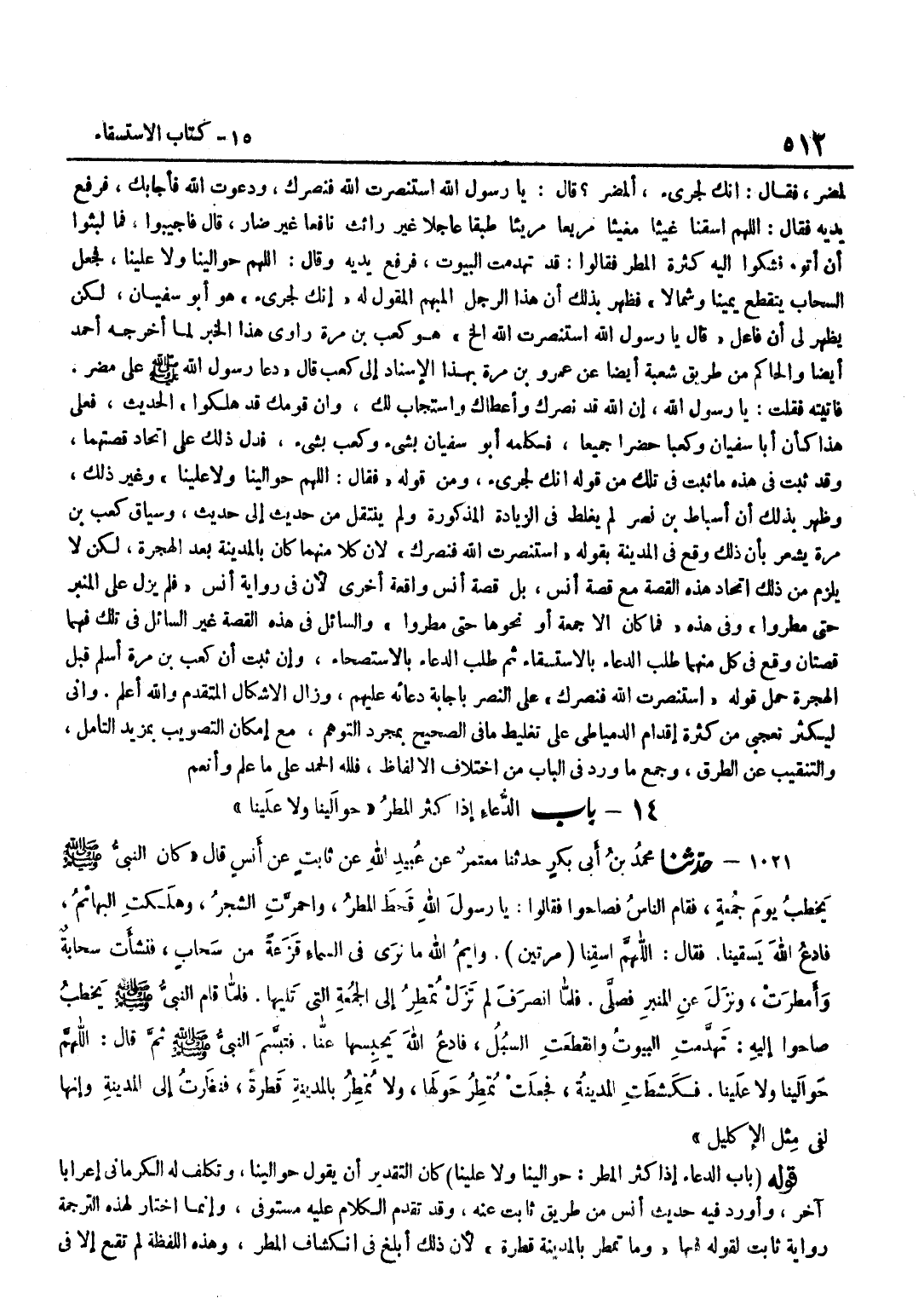 لمضر فَقَالَ انك لجرئ أَلِمُضَرَ قَالَ يَا رَسُولَ اللَّهِ اسْتَنْصَرْتَ اللَّهَ فَنَصَرَكَ وَدَعَوْتَ اللَّهَ فَأَجَابَكَ فَرَفَعَ يَدَيْهِ فَقَالَ اللَّهُمَّ اسْقِنَا غَيْثًا مُغِيثًا مُرِيعًا مَرِيئًا طَبَقًا عَاجِلًا غَيْرَ رَائِثٍ نَافِعًا غَيْرَ ضَارٍّ قَالَ فَأُجِيبُوا فَمَا لَبِثُوا أَنْ أَتَوْهُ فَشَكَوْا إِلَيْهِ كَثْرَةَ الْمَطَرِ فَقَالُوا قَدْ تَهَدَّمَتِ الْبُيُوتُ فَرَفَعَ يَدَيْهِ وَقَالَ اللَّهُمَّ حَوَالَيْنَا وَلَا عَلَيْنَا فَجَعَلَ السَّحَابُ يَتَقَطَّعُ يَمِينًا وَشِمَالًا فَظَهَرَ بِذَلِكَ أَنَّ هَذَا الرجل الْمُبْهم الْمَقُول لَهُ إِنَّك لجرئ هُوَ أَبُو سُفْيَانَ لَكِنْ يَظْهَرُ لِي أَنَّ فَاعِلَ قَالَ يَا رَسُولَ اللَّهِ اسْتَنْصَرْتَ اللَّهَ إِلَخْ هُوَ كَعْبُ بْنُ مُرَّةَ رَاوِي هَذَا الْخَبَرِ لِمَا أَخْرَجَهُ أَحْمَدُ أَيْضًا وَالْحَاكِمُ مِنْ طَرِيقِ شُعْبَةَ أَيْضًا عَنْ عَمْرِو بْنِ مُرَّةَ بِهَذَا الْإِسْنَادِ إِلَى كَعْبٍ قَالَ دَعَا رَسُولِ اللَّهِ صَلَّى اللَّهُ عَلَيْهِ وَسَلَّمَ عَلَى مُضَرَ فَأَتَيْتُهُ فَقُلْتُ يَا رَسُولَ اللَّهِ إِنَّ اللَّهَ قَدْ نَصَرَكَ وَأَعْطَاكَ وَاسْتَجَابَ لَكَ وَإِنَّ قَوْمَكَ قَدْ هَلَكُوا الْحَدِيثَ فَعَلَى هَذَا كَأَنَّ أَبَا سُفْيَانَ وَكَعْبًا حَضَرَا جَمِيعًا فَكَلَّمَهُ أَبُو سُفْيَانَ بِشَيْءٍ وَكَعْبٌ بِشَيْءٍ فَدَلَّ ذَلِكَ عَلَى اتِّحَادِ قِصَّتِهِمَا وَقَدْ ثَبَتَ فِي هَذِهِ مَا ثَبَتَ فِي تِلْكَ من قَوْله انك لجرئ وَمِنْ قَوْلِهِ فَقَالَ اللَّهُمَّ حَوَالَيْنَا وَلَا عَلَيْنَا وَغَيْرِ ذَلِكَ وَظَهَرَ بِذَلِكَ أَنَّ أَسْبَاطَ بْنَ نَصْرٍ لَمْ يَغْلَطْ فِي الزِّيَادَةِ الْمَذْكُورَةِ وَلَمْ يَنْتَقِلْ مِنْ حَدِيثٍ إِلَى حَدِيثٍ وَسِيَاقُ كَعْبِ بْنِ مُرَّةَ يُشْعِرُ بِأَنَّ ذَلِكَ وَقَعَ فِي الْمَدِينَةِ بِقَوْلِهِ اسْتَنْصَرْتَ اللَّهَ فَنَصَرَكَ لِأَنَّ كُلًّا مِنْهُمَا كَانَ بِالْمَدِينَةِ بَعْدَ الْهِجْرَةِ لَكِنْ لَا يَلْزَمُ مِنْ ذَلِكَ اتِّحَادُ هَذِهِ الْقِصَّةِ مَعَ قِصَّةِ أَنَسٍ بَلْ قِصَّةُ أَنَسٍ وَاقِعَةٌ أُخْرَى لِأَنَّ فِي رِوَايَةِ أَنَسٍ فَلَمْ يَزَلْ عَلَى الْمِنْبَرِ حَتَّى مُطِرُوا وَفِي هَذِهِ فَمَا كَانَ إِلَّا جُمْعَةً أَوْ نَحْوَهَا حَتَّى مُطِرُوا وَالسَّائِلُ فِي هَذِهِ الْقِصَّةِ غَيْرُ السَّائِلِ فِي تِلْكَ فَهُمَا قِصَّتَانِ وَقَعَ فِي كُلٍّ مِنْهُمَا طَلَبُ الدُّعَاءِ بِالِاسْتِسْقَاءِ ثُمَّ طَلَبُ الدُّعَاءِ بِالِاسْتِصْحَاءِ وَإِنْ ثَبَتَ أَنَّ كَعْبَ بْنَ مُرَّةَ أَسْلَمَ قَبْلَ الْهِجْرَةِ حُمِلَ قَوْلُهُ اسْتَنْصَرْتَ اللَّهَ فَنَصَرَكَ عَلَى النَّصْرِ بِإِجَابَةِ دُعَائِهِ عَلَيْهِمْ وَزَالَ الْإِشْكَالُ الْمُتَقَدِّمُ وَاللَّهُ أَعْلَمُ وَإِنِّي لَيَكْثُرُ تَعَجُّبِي مِنْ كَثْرَةِ إِقْدَامِ الدِّمْيَاطِيِّ عَلَى تَغْلِيطِ مَا فِي الصَّحِيحِ بِمُجَرَّدِ التَّوَهُّمِ مَعَ إِمْكَانِ التَّصْوِيبِ بِمَزِيدِ التَّأَمُّلِ وَالتَّنْقِيبِ عَنِ الطُّرُقِ وَجَمْعِ مَا وَرَدَ فِي الْبَابِ مِنِ اخْتِلَافِ الْأَلْفَاظِ فَلِلَّهِ الْحَمْدُ عَلَى مَا علم وأنعم