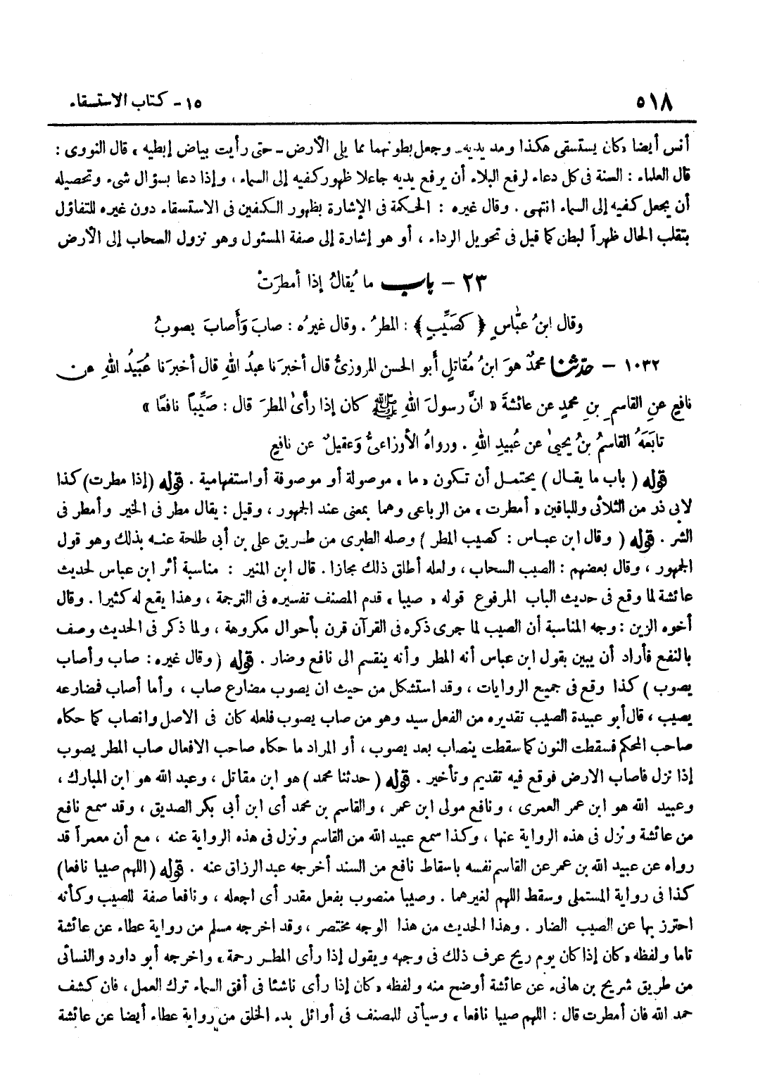 [1032] قَوْلُهُ حَدثنَا مُحَمَّد هُوَ بن مقَاتل وَعبد الله هُوَ بن الْمُبَارك وَعبيد الله هُوَ بن عمر الْعمريّ وَنَافِع مولى بن عمر وَالقَاسِم بن مُحَمَّد أَي بن أَبِي بَكْرٍ الصِّدِّيقِ وَقَدْ سَمِعَ نَافِعٌ مِنْ عَائِشَةَ وَنَزَلَ فِي هَذِهِ الرِّوَايَةِ عَنْهَا وَكَذَا سَمِعَ عُبَيْدُ اللَّهِ مِنَ الْقَاسِمِ وَنَزَلَ فِي هَذِهِ الرِّوَايَةِ عَنْهُ مَعَ أَنَّ مَعْمَرًا قَدْ رَوَاهُ عَنْ عُبَيْدِ اللَّهِ بْنِ عُمَرَ عَنِ الْقَاسِمِ نَفْسِهِ بِإِسْقَاطِ نَافِعٍ مِنَ السَّنَدِ أَخْرَجَهُ عَبْدُ الرَّزَّاقِ عَنْهُ قَوْلُهُ اللَّهُمَّ صَيِّبًا نَافِعًا كَذَا فِي رِوَايَةِ الْمُسْتَمْلِي وَسَقَطَ اللَّهُمَّ لِغَيْرِهِمَا وَصَيِّبًا مَنْصُوبٌ بِفِعْلٍ مُقَدَّرٍ أَيِ اجْعَلْهُ وَنَافِعًا صِفَةٌ لِلصَّيِّبِ وَكَأَنَّهُ احْتُرِزَ بِهَا عَنِ الصَّيِّبِ الضَّارِّ وَهَذَا الْحَدِيثُ مِنْ هَذَا الْوَجْهِ مُخْتَصَرٌ وَقَدْ أَخْرَجَهُ مُسْلِمٌ مِنْ رِوَايَةِ عَطَاءٍ عَنْ عَائِشَةَ تَامًّا وَلَفْظُهُ كَانَ إِذَا كَانَ يَوْمُ رِيحٍ عُرِفَ ذَلِكَ فِي وَجْهِهِ وَيَقُولُ إِذَا رَأَى الْمَطَرَ رَحْمَةٌ وَأَخْرَجَهُ أَبُو دَاوُدَ وَالنَّسَائِيُّ مِنْ طَرِيقِ شُرَيْحِ بْنِ هَانِئٍ عَنْ عَائِشَةَ أَوْضَحَ مِنْهُ وَلَفْظُهُ كَانَ إِذَا رَأَى نَاشِئًا فِي أُفُقِ السَّمَاءِ تَرَكَ الْعَمَلَ فَإِنْ كُشِفَ حَمِدَ اللَّهَ فَإِنْ أَمْطَرَتْ قَالَ اللَّهُمَّ صَيِّبًا نَافِعًا وَسَيَأْتِي لِلْمُصَنِّفِ فِي أَوَائِلِ بَدْءِ الْخَلْقِ مِنْ رِوَايَةِ عَطَاءٍ أَيْضًا عَنْ عَائِشَةَ