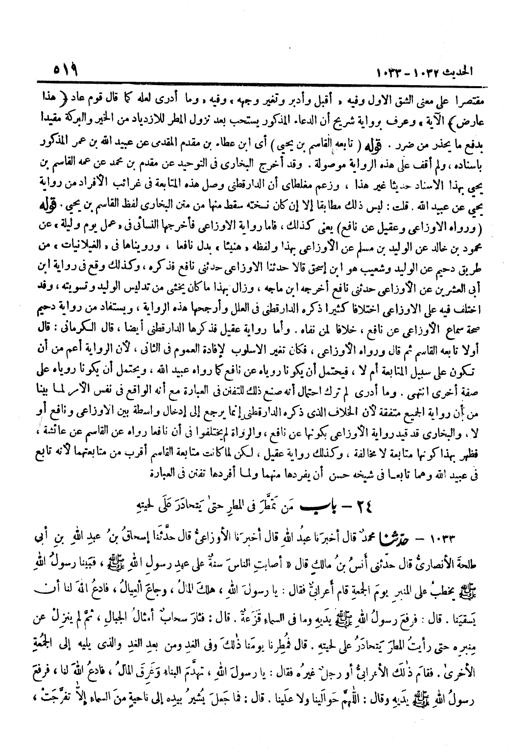مُقْتَصِرًا عَلَى مَعْنَى الشِّقِّ الْأَوَّلِ وَفِيهِ أَقْبَلَ وَأَدْبَرَ وَتَغَيَّرَ وَجْهُهُ وَفِيهِ وَمَا أَدْرِي لَعَلَّهُ كَمَا قَالَ قَوْمُ عَادٍ هَذَا عَارض الْآيَةَ وَعُرِفَ بِرِوَايَةِ شُرَيْحٍ أَنَّ الدُّعَاءَ الْمَذْكُورَ يُسْتَحَبُّ بَعْدَ نُزُولِ الْمَطَرِ لِلِازْدِيَادِ مِنَ الْخَيْرِ وَالْبَرَكَةِ مُقَيَّدًا بِدَفْعِ مَا يُحْذَرُ مِنْ ضَرَرٍ قَوْله تَابعه الْقَاسِم بن يحيى أَي بن عَطَاءِ بْنِ مُقَدَّمٍ الْمُقَدَّمِيُّ عَنْ عُبَيْدِ اللَّهِ بْنِ عُمَرَ الْمَذْكُورِ بِإِسْنَادِهِ وَلَمْ أَقِفْ عَلَى هَذِهِ الرِّوَايَةِ مَوْصُولَةً وَقَدْ أَخْرَجَ الْبُخَارِيُّ فِي التَّوْحِيدِ عَنْ مُقَدَّمِ بْنِ مُحَمَّدٍ عَنْ عَمِّهِ الْقَاسِمِ بْنِ يَحْيَى بِهَذَا الْإِسْنَادِ حَدِيثًا غَيْرَ هَذَا وَزَعَمَ مُغَلْطَايْ أَنَّ الدَّارَقُطْنِيَّ وَصَلَ هَذِهِ الْمُتَابَعَةَ فِي غَرَائِبِ الْأَفْرَادِ مِنْ رِوَايَةِ يَحْيَى عَنْ عُبَيْدِ اللَّهِ قُلْتُ لَيْسَ ذَلِكَ مُطَابِقًا إِلَّا إِنْ كَانَ نُسْخَتُهُ سَقَطَ مِنْهَا مِنْ مَتْنِ الْبُخَارِيِّ لَفْظُ الْقَاسِمِ بْنِ يَحْيَى قَوْلُهُ وَرَوَاهُ الْأَوْزَاعِيُّ وَعُقَيْلٌ عَنْ نَافِعٍ يَعْنِي كَذَلِكَ فَأَمَّا رِوَايَةُ الْأَوْزَاعِيِّ فَأَخْرَجَهَا النَّسَائِيُّ فِي عَمَلِ يَوْمٍ وَلَيْلَةٍ عَنْ مَحْمُودِ بْنِ خَالِدٍ عَنِ الْوَلِيدِ بْنِ مُسْلِمٍ عَنِ الْأَوْزَاعِيِّ بِهَذَا وَلَفْظُهُ هَنِيئًا بَدَلَ نَافِعًا وَرُوِّينَاهَا فِي الْغِيلَانِيَّاتِ مِنْ طَرِيق دُحَيْم عَن الْوَلِيد وَشُعَيْب هُوَ بن إِسْحَاقَ قَالَا حَدَّثَنَا الْأَوْزَاعِيُّ حَدَّثَنِي نَافِعٌ فَذَكَرَهُ وَكَذَلِكَ وَقع فِي رِوَايَة بن أَبِي الْعِشْرِينَ عَنِ الْأَوْزَاعِيِّ حَدَّثَنِي نَافِعٌ أَخْرَجَهُ بن مَاجَهْ وَزَالَ بِهَذَا مَا كَانَ يُخْشَى مِنْ تَدْلِيسِ الْوَلِيدِ وَتَسْوِيَتِهِ وَقَدِ اخْتُلِفَ فِيهِ عَلَى الْأَوْزَاعِيِّ اخْتِلَافًا كَثِيرًا ذَكَرَهُ الدَّارَقُطْنِيُّ فِي الْعِلَلِ وَأَرْجَحُهَا هَذِهِ الرِّوَايَةُ وَيُسْتَفَادُ مِنْ رِوَايَةِ دُحَيْمٍ صِحَّةُ سَمَاعِ الْأَوْزَاعِيِّ عَنْ نَافِعٍ خِلَافًا لِمَنْ نَفَاهُ وَأَمَّا رِوَايَةُ عُقَيْلٍ فَذَكَرَهَا الدَّارَقُطْنِيُّ أَيْضًا قَالَ الْكِرْمَانِيُّ قَالَ أَوَّلًا تَابَعَهُ الْقَاسِمُ ثُمَّ قَالَ وَرَوَاهُ الْأَوْزَاعِيُّ فَكَانَ تَغَيُّرُ الْأُسْلُوبِ لِإِفَادَةِ الْعُمُومِ فِي الثَّانِي لِأَنَّ الرِّوَايَةَ أَعَمُّ مِنْ أَنْ تَكُونَ عَلَى سَبِيلِ الْمُتَابَعَةِ أَمْ لَا فَيُحْتَمَلُ أَنْ يَكُونَا رَوَيَاهُ عَنْ نَافِعٍ كَمَا رَوَاهُ عُبَيْدُ اللَّهِ وَيُحْتَمَلُ أَنْ يَكُونَا رَوَيَاهُ عَلَى صِفَةٍ أُخْرَى انْتَهَى وَمَا أَدْرِي لِمَ تَرَكَ احْتِمَالَ أَنَّهُ صَنَعَ ذَلِكَ لِلتَّفَنُّنِ فِي الْعِبَارَةِ مَعَ أَنَّهُ الْوَاقِعُ فِي نَفْسِ الْأَمْرِ لِمَا بَيَّنَّا مِنْ أَنَّ رِوَايَةَ الْجَمِيعِ مُتَّفِقَةٌ لِأَنَّ الْخِلَافَ الَّذِي ذَكَرَهُ الدَّارَقُطْنِيُّ إِنَّمَا يَرْجِعُ إِلَى إِدْخَالِ وَاسِطَةٍ بَيْنَ الْأَوْزَاعِيِّ وَنَافِعٍ أَوْ لَا وَالْبُخَارِيُّ قَدْ قَيَّدَ رِوَايَةَ الْأَوْزَاعِيِّ بِكَوْنِهَا عَنْ نَافِعٍ وَالرُّوَاةُ لَمْ يَخْتَلِفُوا فِي أَنَّ نَافِعًا رَوَاهُ عَنِ الْقَاسِمِ عَنْ عَائِشَةَ فَظَهَرَ بِهَذَا كَوْنُهَا مُتَابَعَةً لَا مُخَالَفَةً وَكَذَلِكَ رِوَايَةُ عُقَيْلٍ لَكِنْ لَمَّا كَانَتْ مُتَابَعَةُ الْقَاسِمِ أَقْرَبَ مِنْ مُتَابَعَتِهِمَا لِأَنَّهُ تَابَعَ فِي عُبَيْدِ اللَّهِ وَهُمَا تَابَعَا فِي شَيْخِهِ حَسُنَ أَنْ يُفْرِدَهَا مِنْهُمَا وَلما أفردها تفنن فِي الْعبارَة