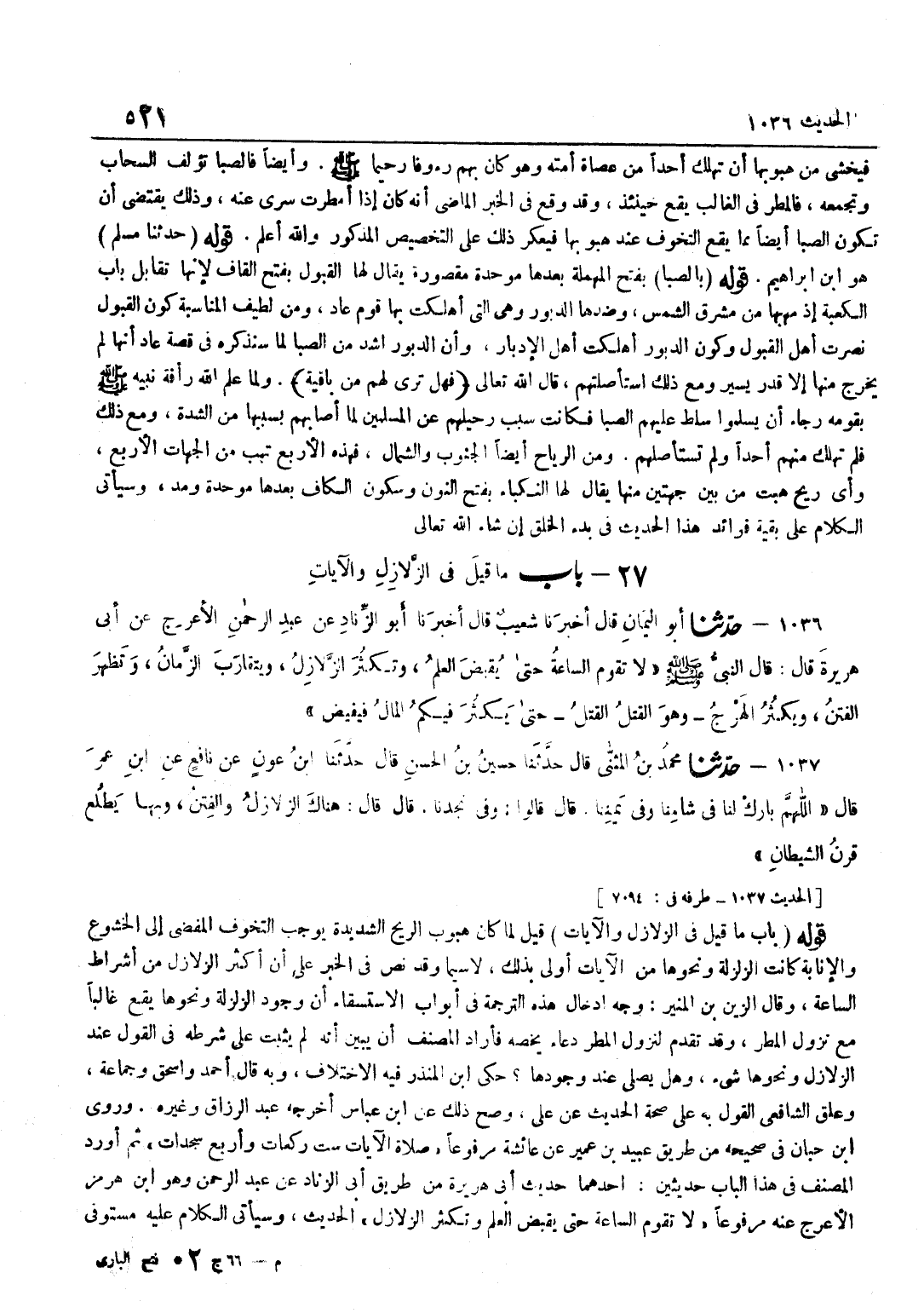 الزَّلْزَلَةُ وَنَحْوُهَا مِنَ الْآيَاتِ أَوْلَى بِذَلِكَ لَا سِيَّمَا وَقَدْ نَصَّ فِي الْخَبَرِ عَلَى أَنَّ أَكْثَرَ الزَّلَازِلِ مِنْ أَشْرَاطِ السَّاعَةِ وَقَالَ الزَّيْنُ بْنُ الْمُنِيرِ وَجْهُ إِدْخَالِ هَذِهِ التَّرْجَمَةِ فِي أَبْوَابِ الِاسْتِسْقَاءِ أَنَّ وُجُودَ الزَّلْزَلَةِ وَنَحْوِهَا يَقَعُ غَالِبًا مَعَ نُزُولِ الْمَطَرِ وَقَدْ تَقَدَّمَ لِنُزُولِ الْمَطَرِ دُعَاءٌ يَخُصُّهُ فَأَرَادَ الْمُصَنِّفُ أَنْ يُبَيِّنَ أَنَّهُ لَمْ يَثْبُتْ عَلَى شَرْطِهِ فِي الْقَوْلِ عِنْدَ الزَّلَازِلِ وَنَحْوهَا شَيْء وَهل يُصَلِّي عِنْد وجودهَا حكى بن الْمُنْذِرِ فِيهِ الِاخْتِلَافَ وَبِهِ قَالَ أَحْمَدُ وَإِسْحَاقُ وَجَمَاعَةٌ وَعَلَّقَ الشَّافِعِيُّ الْقَوْلَ بِهِ عَلَى صِحَّةِ الحَدِيث عَن على وَصَحَّ ذَلِك عَن بن عَبَّاس أخرجه عبد الرَّزَّاق وَغَيره وروى بن حِبَّانَ فِي صَحِيحِهِ مِنْ طَرِيقِ عُبَيْدِ بْنِ عُمَيْرٍ عَنْ عَائِشَةَ مَرْفُوعًا صَلَاةُ الْآيَاتِ سِتُّ رَكَعَاتٍ وَأَرْبَعُ سَجَدَاتٍ ثُمَّ أَوْرَدَ الْمُصَنِّفُ فِي هَذَا الْبَابِ حَدِيثَيْنِ أَحَدُهُمَا حَدِيثُ أَبِي هُرَيْرَةَ مِنْ طَرِيقِ أَبِي الزِّنَادِ عَنْ عَبْدِ الرَّحْمَنِ وَهُوَ بن هُرْمُزَ الْأَعْرَجِ عَنْهُ مَرْفُوعًا لَا تَقُومُ السَّاعَةُ حَتَّى يُقْبَضَ الْعِلْمُ وَتَكْثُرُ الزَّلَازِلُ الْحَدِيثَ وَسَيَأْتِي الْكَلَامُ عَلَيْهِ مُسْتَوْفًى