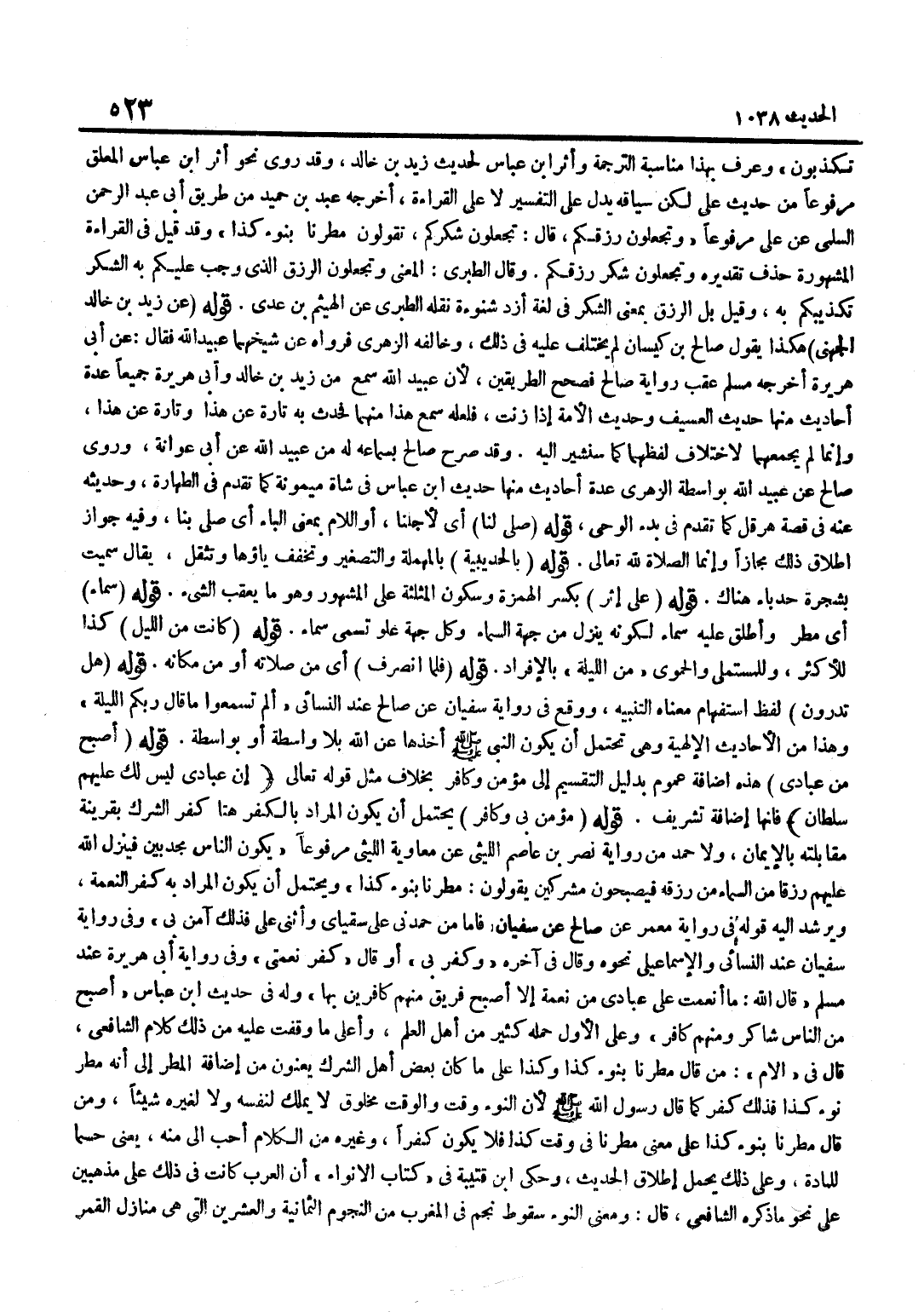 [1038] قَوْلُهُ عَنْ زَيْدِ بْنِ خَالِدٍ الْجُهَنِيِّ هَكَذَا يَقُولُ صَالِحُ بْنُ كَيْسَانَ لَمْ يُخْتَلَفْ عَلَيْهِ فِي ذَلِكَ وَخَالَفَهُ الزُّهْرِيُّ فَرَوَاهُ عَنْ شَيْخِهِمَا عُبَيْدُ اللَّهِ فَقَالَ عَنْ أَبِي هُرَيْرَةَ أَخْرَجَهُ مُسْلِمٌ عَقِبَ رِوَايَةِ صَالِحٍ فَصَحَّحَ الطَّرِيقَيْنِ لِأَنَّ عُبَيْدَ اللَّهِ سَمِعَ مِنْ زَيْدِ بْنِ خَالِدٍ وَأَبِي هُرَيْرَةَ جَمِيعًا عِدَّةَ أَحَادِيثَ مِنْهَا حَدِيثُ الْعَسِيفِ وَحَدِيثُ الْأَمَةِ إِذَا زَنَتْ فَلَعَلَّهُ سَمِعَ هَذَا مِنْهُمَا فَحَدَّثَ بِهِ تَارَةً عَنْ هَذَا وَتَارَةً عَنْ هَذَا وَإِنَّمَا لَمْ يَجْمَعْهُمَا لِاخْتِلَافِ لَفْظِهِمَا كَمَا سَنُشِيرُ إِلَيْهِ وَقَدْ صَرَّحَ صَالِحٌ بِسَمَاعِهِ لَهُ مِنْ عُبَيْدِ اللَّهِ عَنْ أَبِي عَوَانَةَ وَرَوَى صَالِحٌ عَنْ عُبَيْدِ اللَّهِ بِوَاسِطَةِ الزُّهْرِيِّ عِدَّةَ أَحَادِيثَ مِنْهَا حَدِيثُ بن عَبَّاسٍ فِي شَاةِ مَيْمُونَةَ كَمَا تَقَدَّمَ فِي الطَّهَارَةِ وَحَدِيثُهُ عَنْهُ فِي قِصَّةِ هِرَقْلَ كَمَا تَقَدَّمَ فِي بَدْءِ الْوَحْيِ قَوْله صَلَّى لَنَا أَيْ لِأَجْلِنَا أَوِ اللَّامُ بِمَعْنَى الْبَاءِ أَيْ صَلَّى بِنَا وَفِيهِ جَوَازُ إِطْلَاقِ ذَلِكَ مَجَازًا وَإِنَّمَا الصَّلَاةُ لِلَّهِ تَعَالَى قَوْلُهُ بِالْحُدَيْبِيَةِ بِالْمُهْمَلَةِ وَالتَّصْغِيرِ وَتُخَفَّفُ يَاؤُهَا وَتُثَقَّلُ يُقَالُ سُمِّيَتْ بِشَجَرَةِ حَدْبَاءَ هُنَاكَ قَوْلُهُ عَلَى إِثْرِ بِكَسْرِ الْهَمْزَةِ وَسُكُونِ الْمُثَلَّثَةِ عَلَى الْمَشْهُورِ وَهُوَ مَا يَعْقُبُ الشَّيْءَ قَوْلُهُ سَمَاءٍ أَيْ مَطَرٍ وَأُطْلِقَ عَلَيْهِ سَمَاءٌ لِكَوْنِهِ يَنْزِلُ مِنْ جِهَةِ السَّمَاءِ وَكُلُّ جِهَةِ عُلُوٍّ تُسَمَّى سَمَاءً قَوْلُهُ كَانَتْ مِنَ اللَّيْلِ كَذَا لِلْأَكْثَرِ وَلِلْمُسْتَمْلِي وَالْحَمَوِيِّ مِنَ اللَّيْلَةِ بِالْإِفْرَادِ قَوْلُهُ فَلَمَّا انْصَرَفَ أَيْ مِنْ صَلَاتِهِ أَوْ مِنْ مَكَانِهِ قَوْلُهُ هَلْ تَدْرُونَ لَفْظُ اسْتِفْهَامٍ مَعْنَاهُ التَّنْبِيهُ وَوَقَعَ فِي رِوَايَةِ سُفْيَانَ عَنْ صَالِحٍ عِنْدَ النَّسَائِيِّ أَلَمْ تَسْمَعُوا مَا قَالَ رَبُّكُمُ اللَّيْلَةَ وَهَذَا مِنَ الْأَحَادِيثِ الْإِلَهِيَّةِ وَهِيَ تَحْتَمِلُ أَنْ يَكُونَ النَّبِيُّ صَلَّى اللَّهُ عَلَيْهِ وَسَلَّمَ أَخَذَهَا عَنِ اللَّهِ بِلَا وَاسِطَةٍ أَوْ بِوَاسِطَةٍ قَوْلُهُ أَصْبَحَ مِنْ عِبَادِي هَذِهِ إِضَافَةُ عُمُومٍ بِدَلِيلِ التَّقْسِيمِ إِلَى مُؤْمِنٍ وَكَافِرٍ بِخِلَافِ مِثْلِ قَوْلِهِ تَعَالَى إِنَّ عِبَادِي لَيْسَ لَكَ عَلَيْهِمْ سُلْطَانٌ فَإِنَّهَا إِضَافَةُ تَشْرِيفٍ قَوْلُهُ مُؤْمِنٌ بِي وَكَافِرٌ يُحْتَمَلُ أَنْ يَكُونَ الْمُرَادُ بِالْكُفْرِ هُنَا كُفْرَ الشِّرْكِ بِقَرِينَةِ مُقَابَلَتِهِ بِالْإِيمَانِ وَلِأَحْمَدَ مِنْ رِوَايَةِ نَصْرِ بْنِ عَاصِمٍ اللَّيْثِيِّ عَنْ مُعَاوِيَةَ اللَّيْثِيِّ مَرْفُوعًا يَكُونُ النَّاسُ مُجْدِبِينَ فَيُنْزِلُ اللَّهُ عَلَيْهِمْ رِزْقًا مِنَ السَّمَاءِ مِنْ رِزْقِهِ فَيُصْبِحُونَ مُشْرِكِينَ يَقُولُونَ مُطِرْنَا بِنَوْءِ كَذَا وَيُحْتَمَلُ أَنْ يَكُونَ الْمُرَادُ بِهِ كُفْرَ النِّعْمَةِ وَيُرْشِدُ إِلَيْهِ قَوْلُهُ فِي رِوَايَةِ مَعْمَرٍ عَنْ صَالِحٍ عَنْ سُفْيَانَ فَأَما من حمدني على سقياى وَأثْنى على فَذَلِكَ آمَنَ بِي وَفِي رِوَايَةِ سُفْيَانَ عِنْدَ النَّسَائِيِّ وَالْإِسْمَاعِيلِيِّ نَحْوُهُ وَقَالَ فِي آخِرِهِ وَكَفَرَ بِي أَوْ قَالَ كَفَرَ نِعْمَتِيَ وَفِي رِوَايَةِ أَبِي هُرَيْرَةَ عِنْدَ مُسْلِمٍ قَالَ اللَّهُ مَا أَنْعَمْتُ عَلَى عِبَادِي مِنْ نِعْمَةٍ إِلَّا أَصْبَحَ فَرِيقٌ مِنْهُمْ كَافِرِينَ بِهَا وَلَهُ فِي