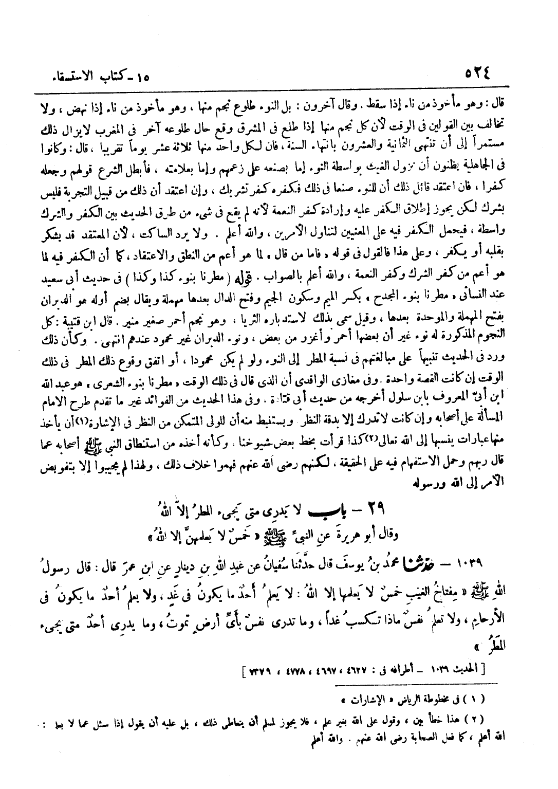 قَالَ وَهُوَ مَأْخُوذٌ مِنْ نَاءَ إِذَا سَقَطَ وَقَالَ آخَرُونَ بَلِ النَّوْءُ طُلُوعُ نَجْمٍ مِنْهَا وَهُوَ مَأْخُوذٌ مِنْ نَاءَ إِذَا نَهَضَ وَلَا تَخَالُفَ بَيْنَ الْقَوْلَيْنِ فِي الْوَقْتِ لِأَنَّ كُلَّ نَجْمٍ مِنْهَا إِذَا طَلَعَ فِي الْمَشْرِقِ وَقَعَ حَالَ طُلُوعِهِ آخَرُ فِي الْمَغْرِبِ لَا يَزَالُ ذَلِكَ مُسْتَمِرًّا إِلَى أَنْ تَنْتَهِيَ الثَّمَانِيَةُ وَالْعِشْرُونَ بِانْتِهَاءِ السَّنَةِ فَإِنَّ لِكُلِّ وَاحِدٍ مِنْهَا ثَلَاثَةَ عَشَرَ يَوْمًا تَقْرِيبًا قَالَ وَكَانُوا فِي الْجَاهِلِيَّةِ يَظُنُّونَ أَنَّ نُزُولَ الْغَيْثِ بِوَاسِطَةِ النَّوْءِ إِمَّا بِصُنْعِهِ عَلَى زَعْمِهِمْ وَإِمَّا بِعَلَامَتِهِ فَأَبْطَلَ الشَّرْعُ قَوْلَهُمْ وَجَعَلَهُ كُفْرًا فَإِنِ اعْتَقَدَ قَائِلٌ ذَلِكَ أَنَّ لِلنَّوْءِ صُنْعًا فِي ذَلِكَ فَكُفْرُهُ كُفْرُ تَشْرِيكٍ وَإِنِ اعْتَقَدَ أَنَّ ذَلِكَ مِنْ قَبِيلِ التَّجْرِبَةِ فَلَيْسَ بِشِرْكٍ لَكِنْ يَجُوزُ إِطْلَاقُ الْكُفْرِ عَلَيْهِ وَإِرَادَةُ كُفْرِ النِّعْمَةِ لِأَنَّهُ لَمْ يَقَعْ فِي شَيْءٍ مِنْ طُرُقِ الْحَدِيثِ بَيْنَ الْكُفْرِ وَالشِّرْكِ وَاسِطَةٌ فَيُحْمَلُ الْكُفْرُ فِيهِ عَلَى الْمَعْنَيَيْنِ لِتَنَاوُلِ الْأَمْرَيْنِ وَاللَّهُ أَعْلَمُ وَلَا يَرِدُ السَّاكِتُ لِأَنَّ الْمُعْتَقِدَ قَدْ يَشْكُرُ بِقَلْبِهِ أَوْ يَكْفُرُ وَعَلَى هَذَا فَالْقَوْلُ فِي قَوْلِهِ فَأَمَّا مَنْ قَالَ لِمَا هُوَ أَعَمُّ مِنَ النُّطْقِ وَالِاعْتِقَادِ كَمَا أَنَّ الْكُفْرَ فِيهِ لِمَا هُوَ أَعَمُّ مِنَ كُفْرِ الشِّرْكِ وَكُفْرِ النِّعْمَةِ وَاللَّهُ أَعْلَمُ بِالصَّوَابِ قَوْلُهُ مُطِرْنَا بِنَوْءِ كَذَا وَكَذَا فِي حَدِيثِ أَبِي سَعِيدٍ عِنْدَ النَّسَائِيِّ مُطِرْنَا بِنَوْءِ الْمِجْدَحِ بِكَسْرِ الْمِيمِ وَسُكُونِ الْجِيمِ وَفَتْحِ الدَّالِ بَعْدَهَا مُهْمَلَةٌ وَيُقَالُ بِضَمِّ أَوَّلِهِ هُوَ الدَّبَرَانُ بِفَتْحِ الْمُهْمَلَةِ وَالْمُوَحَّدَةِ بَعْدَهَا وَقِيلَ سُمِّيَ بِذَلِكَ لِاسْتِدْبَارِهِ الثُّرَيَّا وَهُوَ نَجْمٌ أَحْمَرُ صَغِيرٌ مُنِيرٌ قَالَ بن قُتَيْبَةَ كُلُّ النُّجُومِ الْمَذْكُورَةِ لَهُ نَوْءٌ غَيْرُ أَنَّ بَعْضَهَا أَحْمَرُ وَأَغْزَرُ مِنْ بَعْضٍ وَنَوْءُ الدَّبَرَانِ غَيْرُ مَحْمُودٍ عِنْدَهُمْ انْتَهَى وَكَأَنَّ ذَلِكَ وَرَدَ فِي الْحَدِيثِ تَنْبِيهًا عَلَى مُبَالَغَتِهِمْ فِي نِسْبَةِ الْمَطَرِ إِلَى النَّوْءِ وَلَوْ لَمْ يَكُنْ مَحْمُودًا أَوِ اتَّفَقَ وُقُوعُ ذَلِكَ الْمَطَرِ فِي ذَلِكَ الْوَقْتِ إِنْ كَانَتِ الْقِصَّةُ وَاحِدَةً وَفِي مَغَازِي الْوَاقِدِيِّ أَنَّ الَّذِي قَالَ فِي ذَلِكَ الْوَقْتِ مُطِرْنَا بِنَوْءِ الشِّعْرَى هُوَ عَبْدُ اللَّهِ بْنُ أَبِي الْمَعْرُوفُ بِابْنِ سَلُولَ أَخْرَجَهُ مِنْ حَدِيثِ أَبِي قَتَادَةَ وَفِي هَذَا الْحَدِيثِ مِنَ الْفَوَائِدِ غَيْرِ مَا تَقَدَّمَ طَرَحُ الْإِمَامِ الْمَسْأَلَةَ عَلَى أَصْحَابِهِ وَإِنْ كَانَتْ لَا تُدْرَكُ إِلَّا بِدِقَّةِ النَّظَرِ وَيُسْتَنْبَطُ مِنْهُ أَنَّ لِلْوَلِيِّ الْمُتَمَكِّنِ من النّظر فِي الْإِشَارَة أَنْ يَأْخُذَ مِنْهَا عِبَارَاتٍ يَنْسُبُهَا إِلَى اللَّهِ تَعَالَى كَذَا قَرَأْتُ بِخَطِّ بَعْضِ شُيُوخِنَا وَكَأَنَّهُ أَخَذَهُ مِنِ اسْتِنْطَاقِ النَّبِيِّ صَلَّى اللَّهُ عَلَيْهِ وَسَلَّمَ أَصْحَابَهُ عَمَّا قَالَ رَبُّهُمْ وَحَمْلُ الِاسْتِفْهَامِ فِيهِ عَلَى الْحَقِيقَةِ لَكِنَّهُمْ رَضِيَ اللَّهُ عَنْهُمْ فَهِمُوا خِلَافَ ذَلِكَ وَلِهَذَا لَمْ يُجِيبُوا إِلَّا بِتَفْوِيضِ الْأَمر إِلَى الله وَرَسُوله
